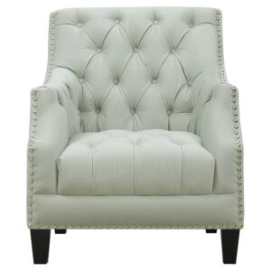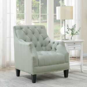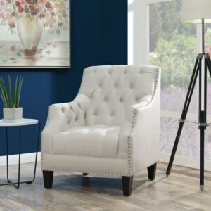 The Picket House Furnishings Perry Tufted Arm Chair adds comfortable, stylish seating to your home. This charming wood chair features fabric upholstery, available in a selection of colors to coordinate with any décor. Button tufting decorates the seat and back cushion, while nailhead trim adds a traditional accent to this chair.