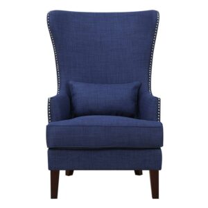A flared back and a variety of color choices make the Picket House Furnishings Kegan Accent Chair a dynamic accent to any modern room. This bold chair is crafted from thick hardwood and engineered wood with block feet. The seat and cushions come padded with ample foam and upholstered in 100% polyester. Choose from the available color and pattern options to best match your room. Silver nailhead studs accent the chair border.
