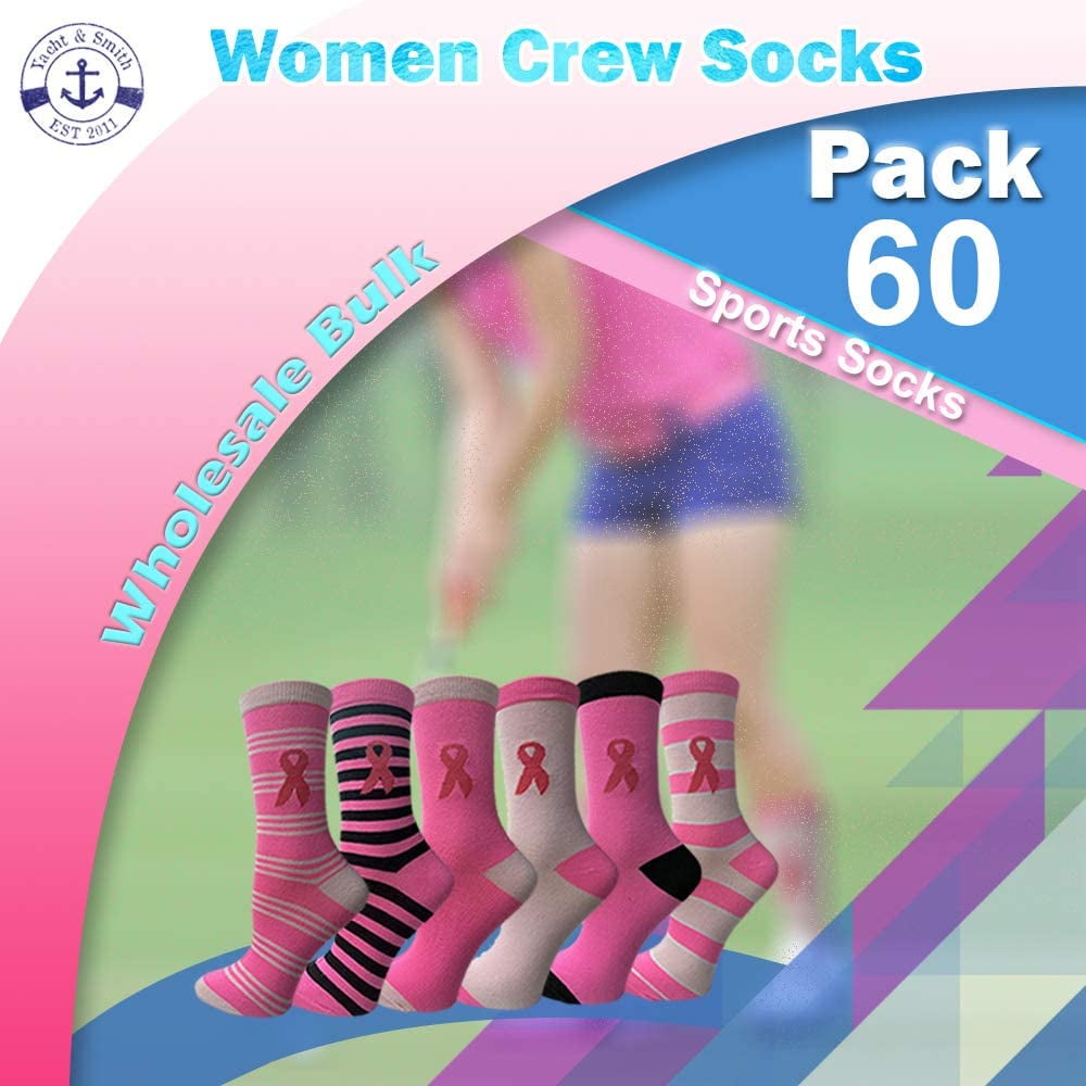 60 PAIRS OF WOMENS PIN RIBBON CREW SOCKS:: Each pack includes 60 pairs of assorted colorful breast cancer awareness womens and girls socks. Many colors ranging from pink, black, red, and white. Socks include pink ribbon breast cancer awareness print. ATHLETIC SOCKS: Choose from sporty crew socks or low cut ankle socks for that no show look. Comfortable for daily wear. Ideal for activities including basketball, soccer, tennis, running, cycling, softball, baseball and or simply to match with pink outfits!show look. BREAST CANCER AWARENESS: Show your support for breast cancer research. A great value for 12 pack of women’s socks. Soft and stylish for the athlete or for casual wearing. Looks great with sneakers, boots, or shoes. PINK SOCKS: One size fits most women and teens. Featuring the pink ribbon iconic symbol. Size 9-11 will fit womens shoe sizes 4-10. MATERIAL CONTENT: 97% polyester, 2% spandex, and 1% elastic. Machine wash with similar colors. Use only non-chlorine bleach when needed. Tumble dry medium.