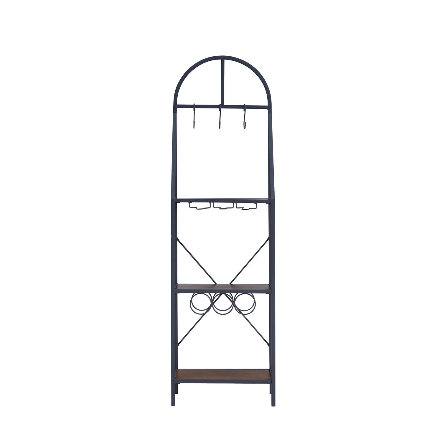 Southern Enterprises Pirricole Bakers Rack, Rustic Brown:FEATURES: Narrow kitchen storage tower 3 shelves, wine rack, 3 glassware racks, and removeable towel hooks Metal detailing Wood grain and distressing will vary; not butcher block certified Kitchen, dining room, or open concept living space Industrial inspired transitional style w/ a touch of farmhouse chic Rustic brown and dark distressed pine finish Overall: 18.75″ W x 11″ D x 64.5″ H Assembly: Required Countertop: 18.75″ W x 11″ D x 37.25″ H x .75″ THK Shelves: 18.5″ W x 10.75″ D x 15.25/15.5″ H Shelf openings: 17.25″ W x 9″ D x 15.25/15.5″ H Hooks: 2″ D, 5″ H Base type: 4 legs Clearance: 17.25″ W x 9.5″ D x 4.25″ H Footprint: 18.75″ W x 11″ D Legs: .5″ W x .5″ D x 53.5″ H Approx. weight: 21 lb. Supports up to: 20 lb. (each shelf/countertop), 1 lb. (each hook), 1 lb. (each glassware rack), 4 lb. (each bottle holder) Materials: Engineered wood, pine veneer, powder-coated iron Compliance: CARB Phase 2, CPC/CPSIACARE:Dust with a soft, dry cloth. Not butcher block certified, quickly clean spills. Use a cutting board when prepping with sharp objects.