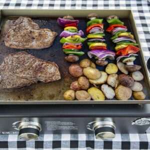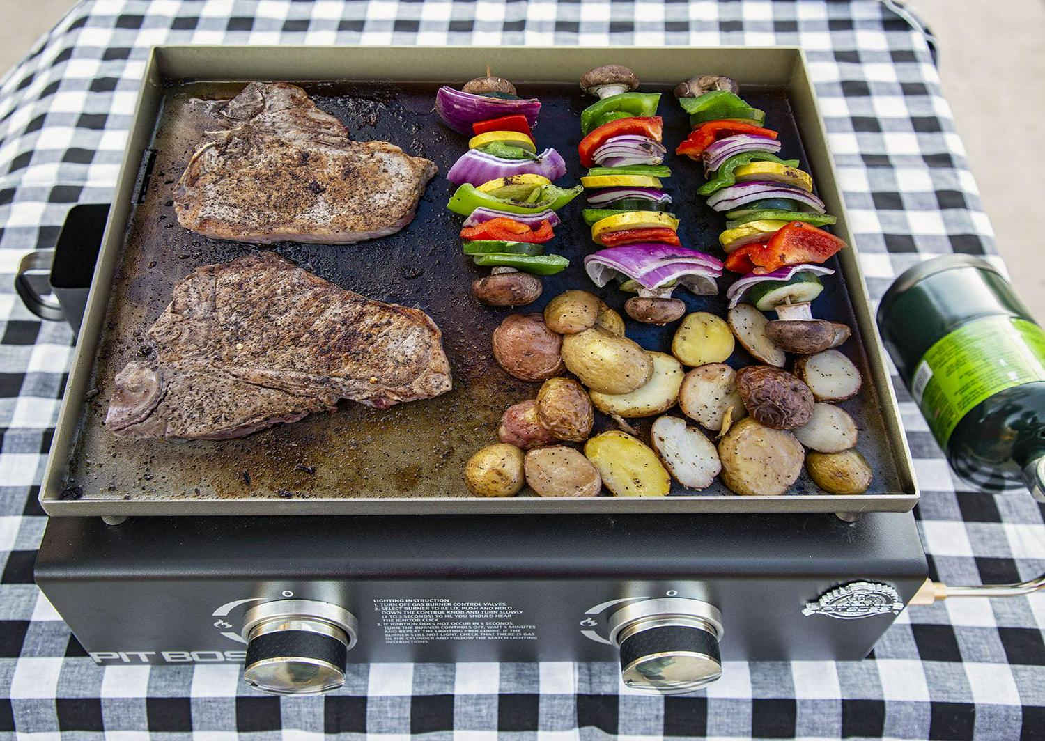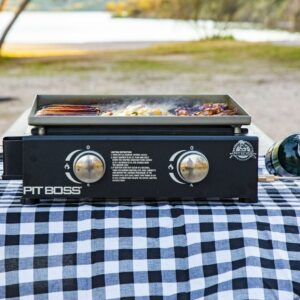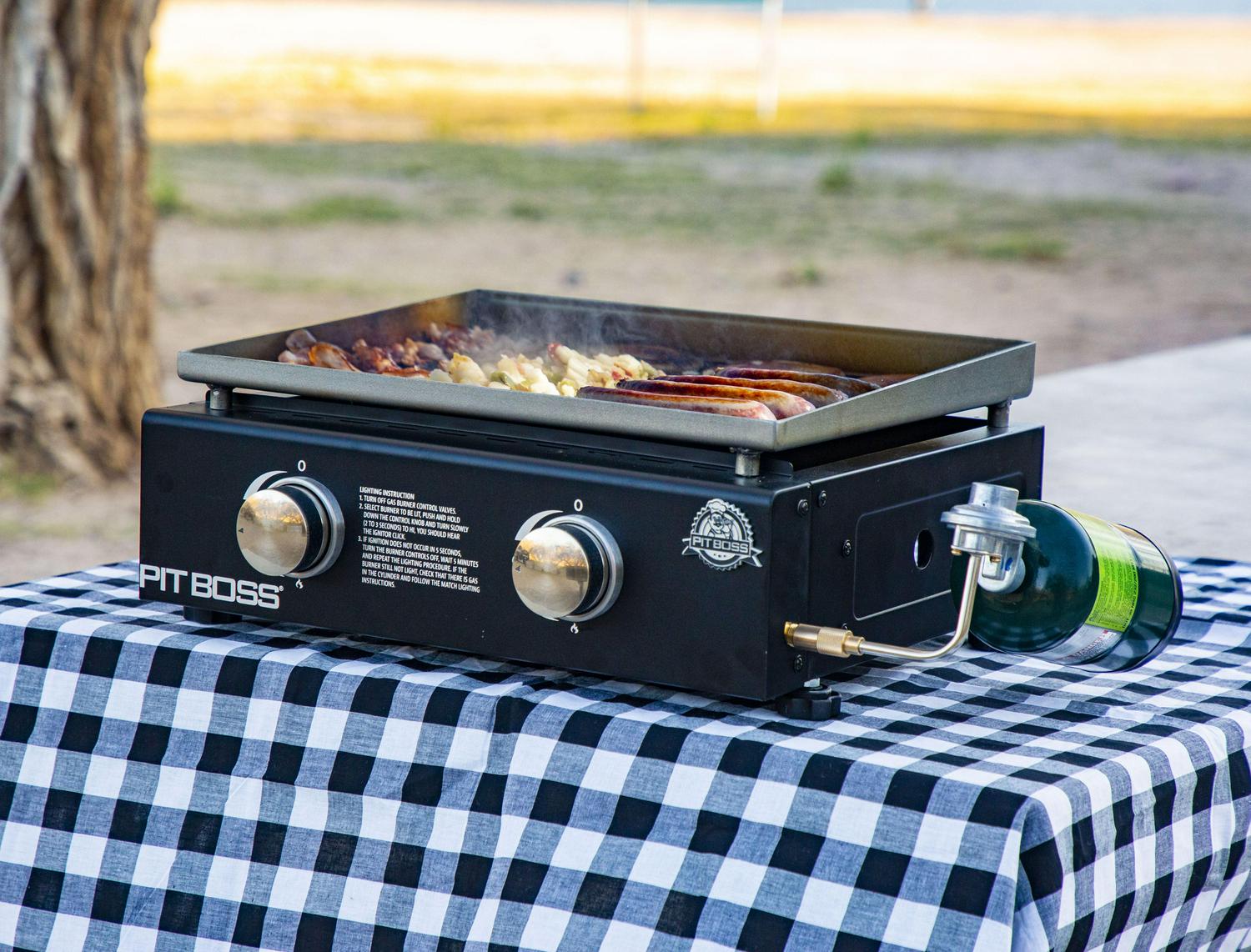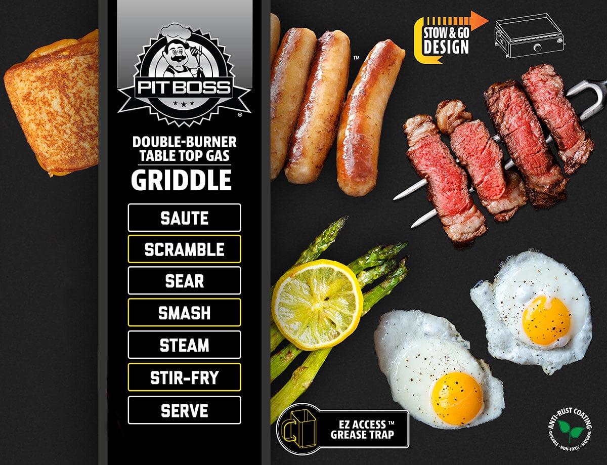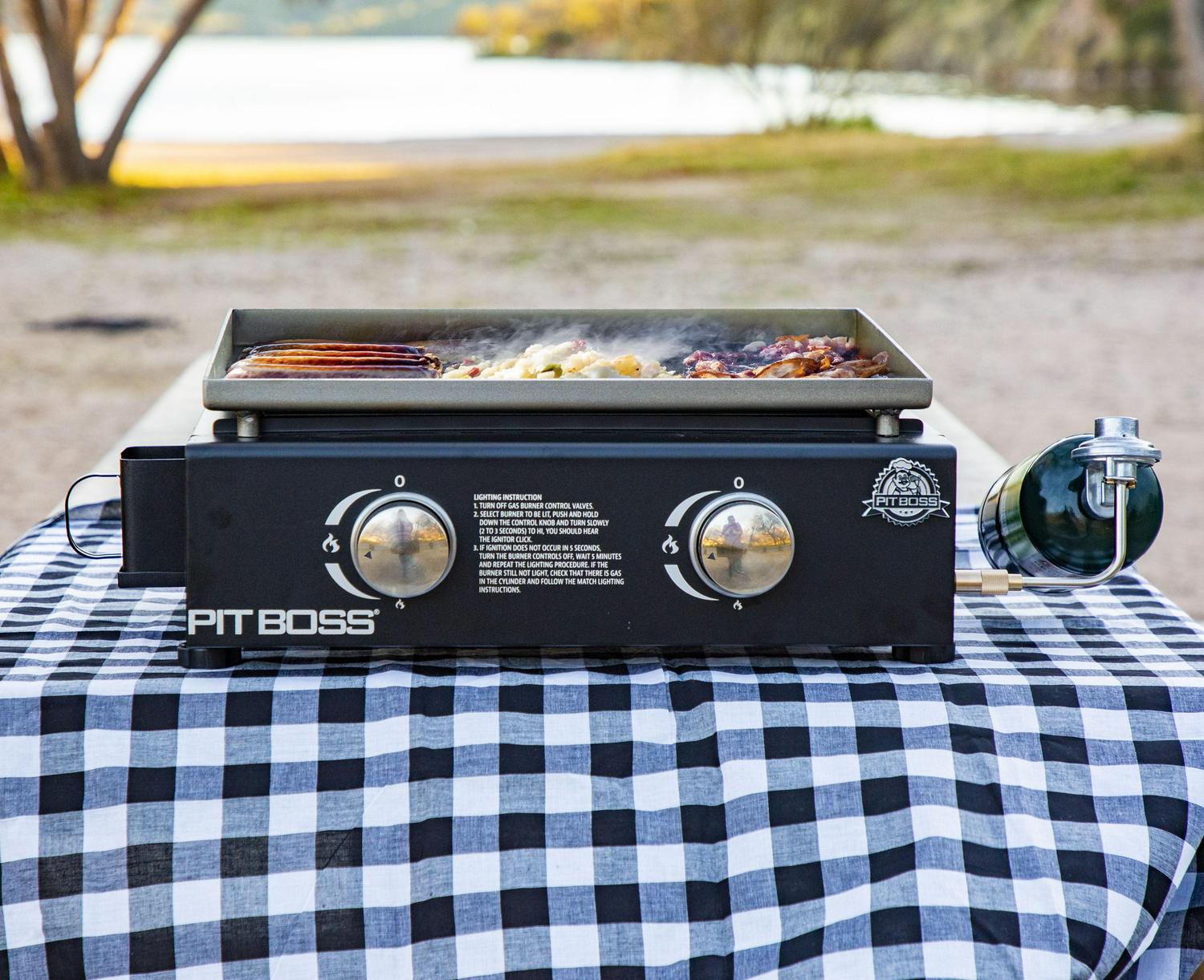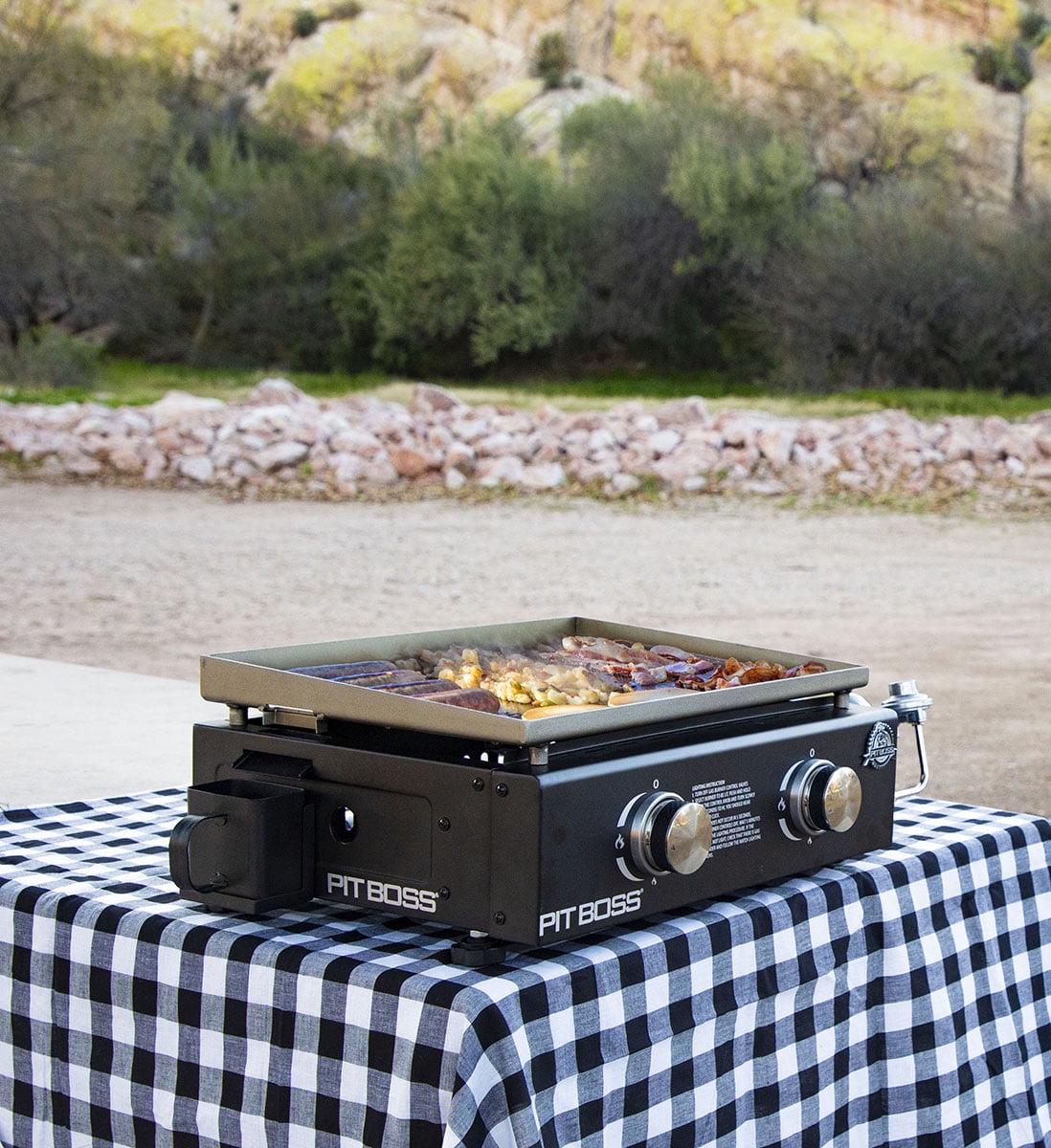 Bring amazing food to the great outdoors with the Pit Boss 336GS Tabletop Gas Griddle. Lightweight and ultra-portable, this two-burner griddle is great for tailgating, picnicking, or camping. It features non-slip tabletop legs and a 4.7mm thick, pre-seasoned surface. You can cook with ease and enjoy quick mess-free clean up, thanks to the built-in front-loading grease tray. With 265 square inches of cooking surface, this tabletop griddle can handle everything from scrambled eggs and pancakes to burgers, steaks and more. The Pit Boss 336GS Tabletop Gas Griddle is the best cooking machine for cooking what you want, where you want.