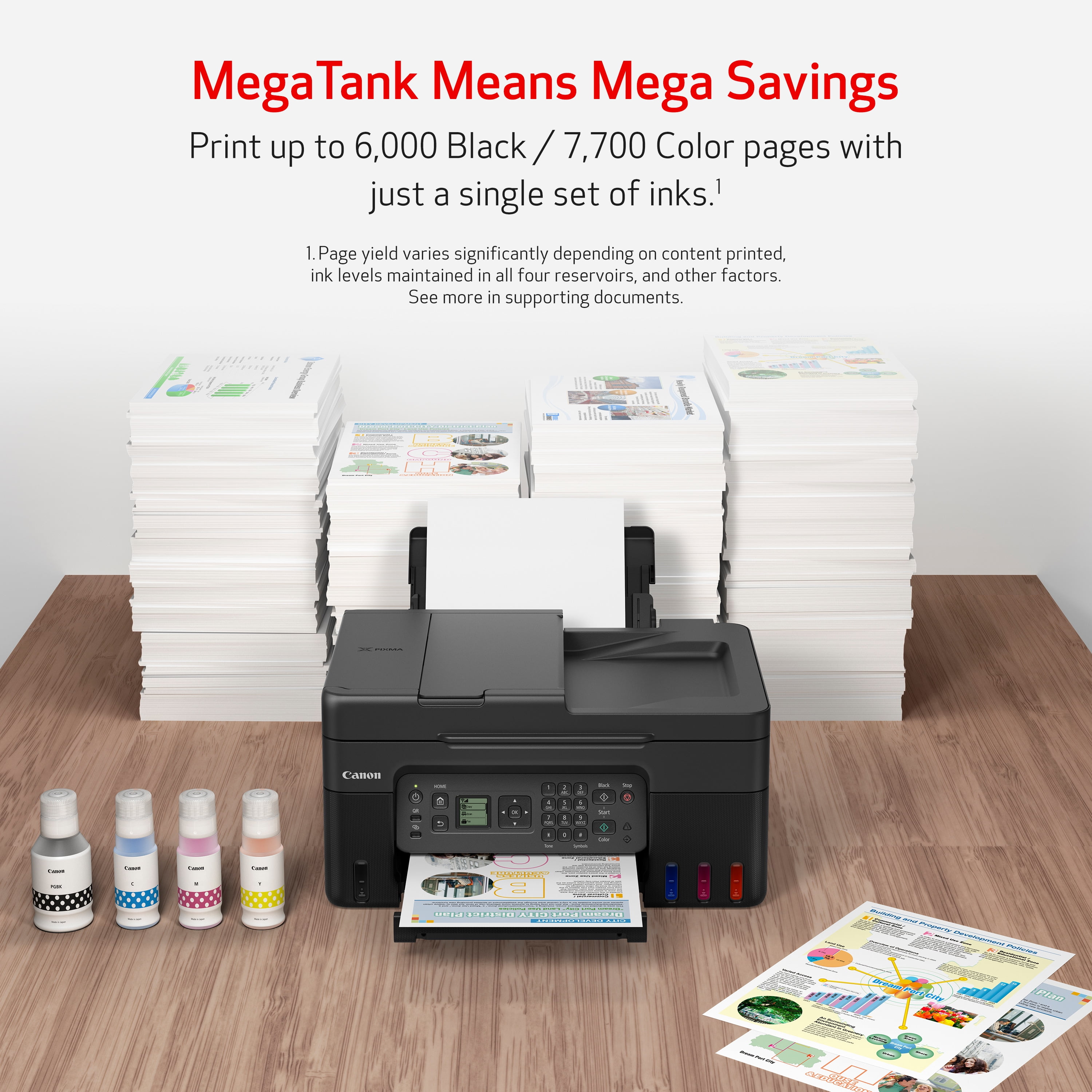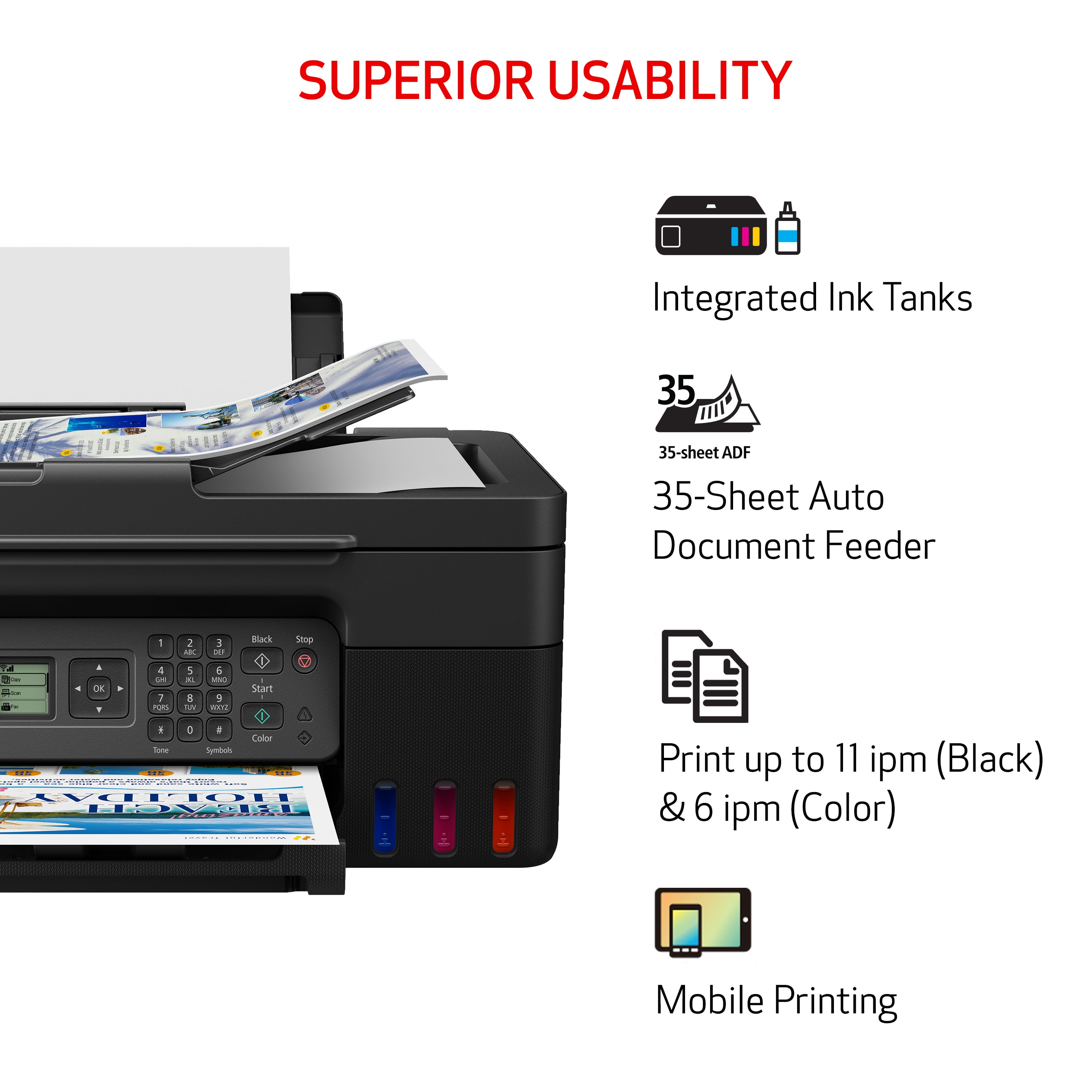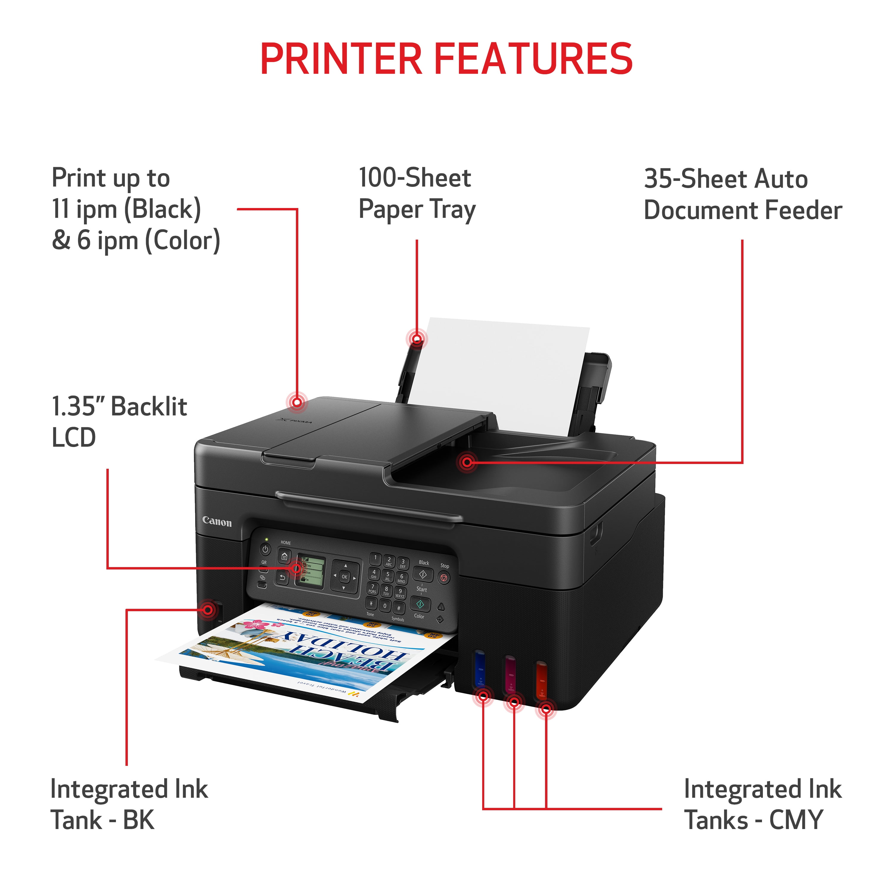 ALL-IN-ONE: Print, Copy, Scan & Fax features for full control at your fingertips. HIGH PAGE YIELD: Print up to 6,000 Black / 7,700 Color pages on just a single set of inks INK SAVINGS: Save $1,000 with the included ink bottle set Fast PRINT SPEEDS: Print approximately 11 (black) / 6 (color) images per minute EASY SETUP: Get running in just a few minutes thanks to a streamlined and easy setup process out of the box. EASY TO FILL Ink bottles have a âkeyed nozzleâ design to only fit and fill the correct color ink tank. BACKLIT 1.35â SQUARE LCD SCREEN: Get the job done with an intuitive and easy to use 1.35â Square LCD Screen. AUTO DOCUMENT FEEDER: Copy multi-page documents with ease with the 35-Sheet Auto Document feeder.