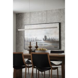 – A smooth metal beam with a brushed nickel finish suspends from the ceiling to add clear visual interest to minimalist residential or commercial settings.