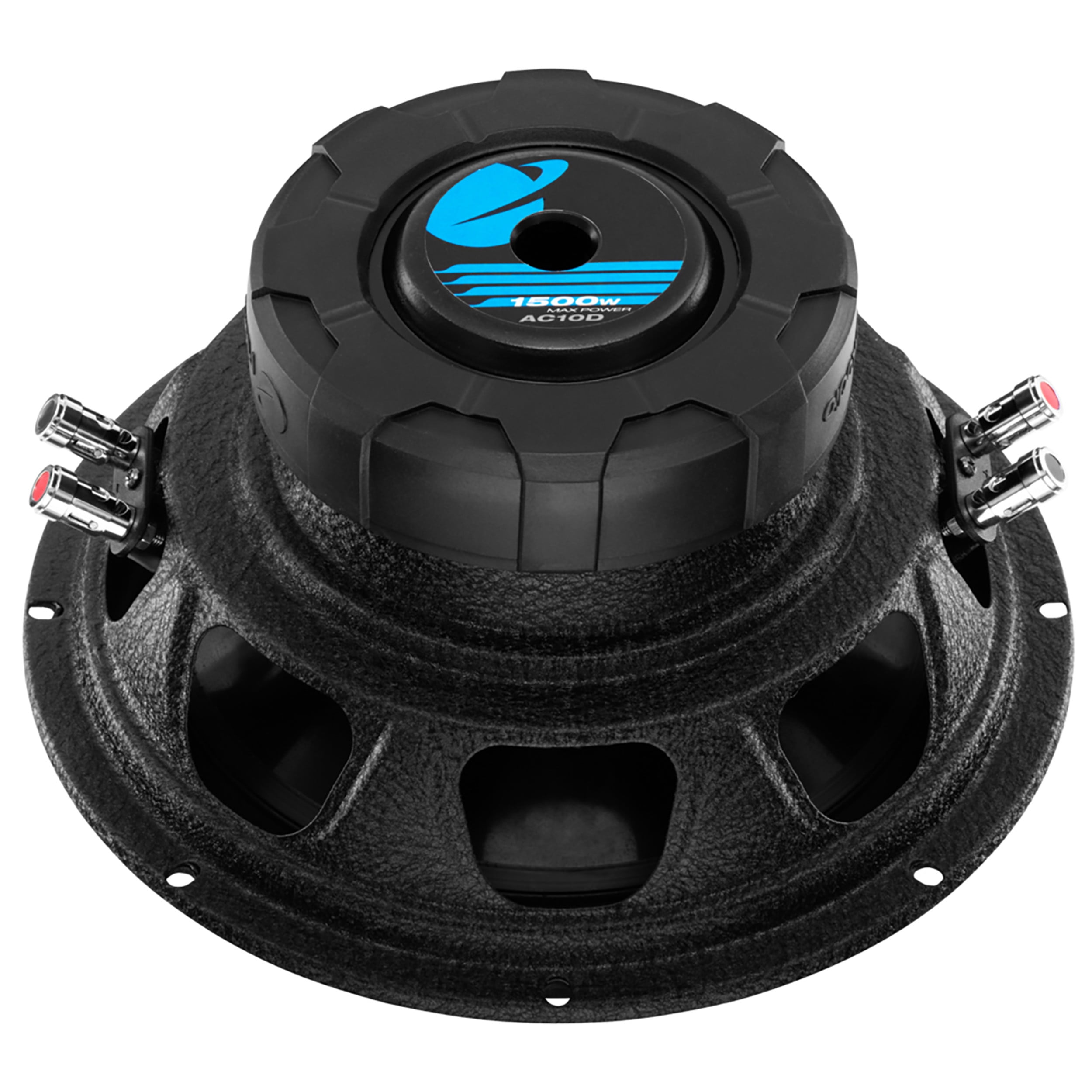 The AC10D 10 Inch Car Subwoofer boasts 1500 watts peak power and 750 watts RMS, this subwoofer is perfect for someone looking to add that bit of bass to their car The dual 4 Ohm high temp 2″ voice coils are able to withstand high temperatures yet maintain its strength and fatigue properties giving our voice coils with this material advantage of longer play times with lower weights Features a polypropylene cone that provides a resilient and durable material and foam surround providing the subwoofer with higher efficiency and excursion The stamped basket offers a strong and rigid platform allowing the listener to hear clean and clear music output 87dB sensitivity, 39 Hz resonant frequency; Dimensions (D x W x H): 11 x 11 x 5.3 inches Mounting Depth: 4.75 inches Mounting Diameter: 9.13 inches Works in 1 CuFt Sealed or 2 CuFt Ported enclosure Color: Black 1 Year Manufacturer Warranty