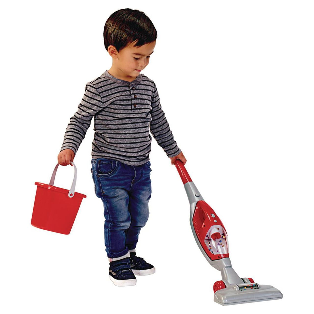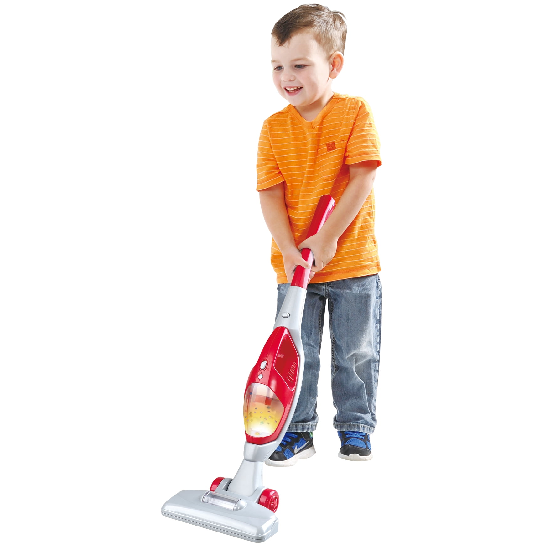 The Playgo vacuum is perfect for pretend play with whirling beads, lights and working sounds! The vaccum has a 2-in-1 detaching hand held vacuum. Vacuum takes three AA batteries. Batteries are included and the toy is ready to play. Playset includes: upright vacuum, held vacuum (with vacuum head), a mop, a broom, a large bucket and drainer. Designed and suitable for children ages 2+ years and older. Kids and parents love the bold red colors and fun design of this playset.