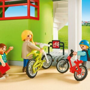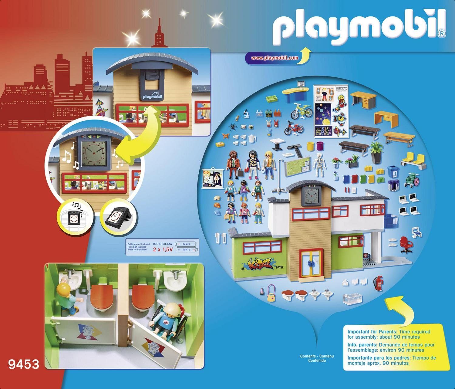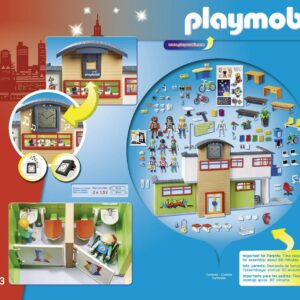 Classes are in session at the Furnished School Building. Upon arriving, students can ind storage for all their school supplies in the downstairs lockers, before heading to their first class of the day. Then, with the help of the functioning digital clock with school bell, students can make sure they get to class on time. Those unable to take the stairs can use the functioning elevator to get to classes on the second floor. The elevator, along with the access ramp and larger bathroom stalls, make this school wheelchair friendly. The downstairs room is a fully-equipped biology classroom with a skeleton model, bio charts, and encased spider for studying. Upstairs, students will find a computer lab and teacher s office. Combine this set with the rest of the PLAYMOBIL School theme (#9453-9457 sold separately), for even more fun. Set includes three adult figures, six child figures, functioning clock with school bell, desks, backpacks, bicycles, laptops, chairs, classroom charts, books, skeleton, wheelchair, toilets, sinks, and tons of other accessories. Dimensions: 29.9 x 14.1 x 14.5 in (LxWxH). Recommended for ages five years and up. Warning. Choking Hazard. Contains a small ball and small parts. Not for children under 3 years.