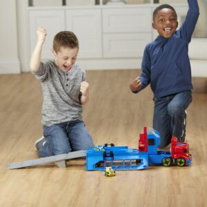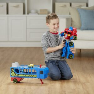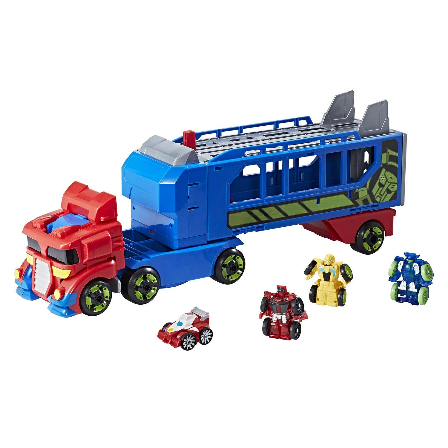 Fearless leader Optimus Prime gets the Rescue Bots to the scene in a hurry by transporting them in trailer mode! Featuring head-to-head racing action, little heroes can imagine helping the Rescue Bots race to the rescue with the Flip Racers Optimus Prime Race Track Trailer playset! Convert Optimus Prime from truck mode into bot mode, standing 15 inches tall! Then convert the trailer into a dual race track measuring over 30 inches long! This exciting playset includes Bumblebee and Blurr Flip Racers figures, sized right for little hands that kids can launch and race. In trailer mode, the playset can store up to 20 Flip Racers figures! (Each sold separately. Subject to availability.)Manufactured under license from TOMY Company, Ltd. Transformers Rescue Bots is a trademark and copyright of Hasbro