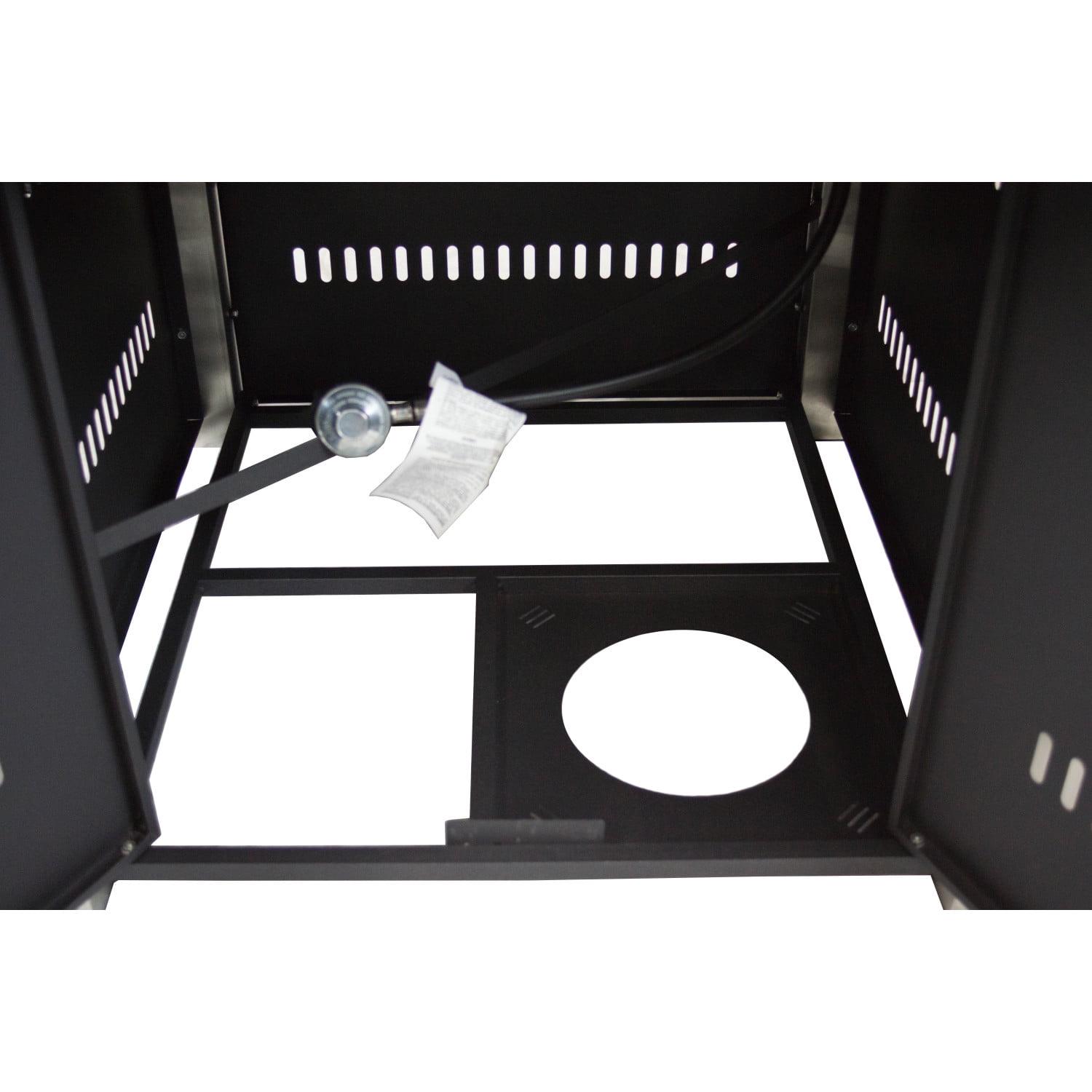 - Hinged doors access the propane tank and igniter