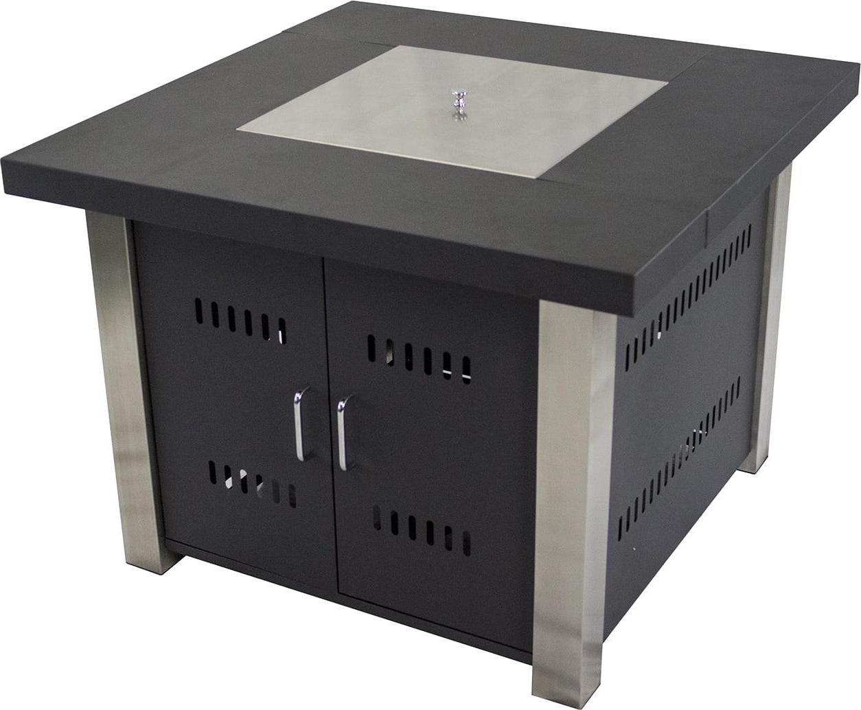 The sleek and modern Pleasant Hearth OFG901T Montreal 38-in Matte Black and Stainless Steel Propane Gas Fire Pit Table is sure to be a hit amongst even the most discerning of guests. The stainless-steel accent legs and the stainless-steel table lid will reflect the sunlight and draw attention to the matte black, steel table. A well-hidden 20-lb propane tank (not included) powers the unit and gives off 40,000 BTU’s of warmth. Open the hinged doors to expose the control panel and tank. The piezo ignition turns on the unit with just the turn of a knob and the variable flame control lets you dictate a big flame and lots of heat or a low, ambient fire. Once on, enjoy the sparkle of the blue glass rocks that reflect the flickering flames. When your pit is not in use, just put the stainless-steel table lid in place, and use the unit as an occasional table.