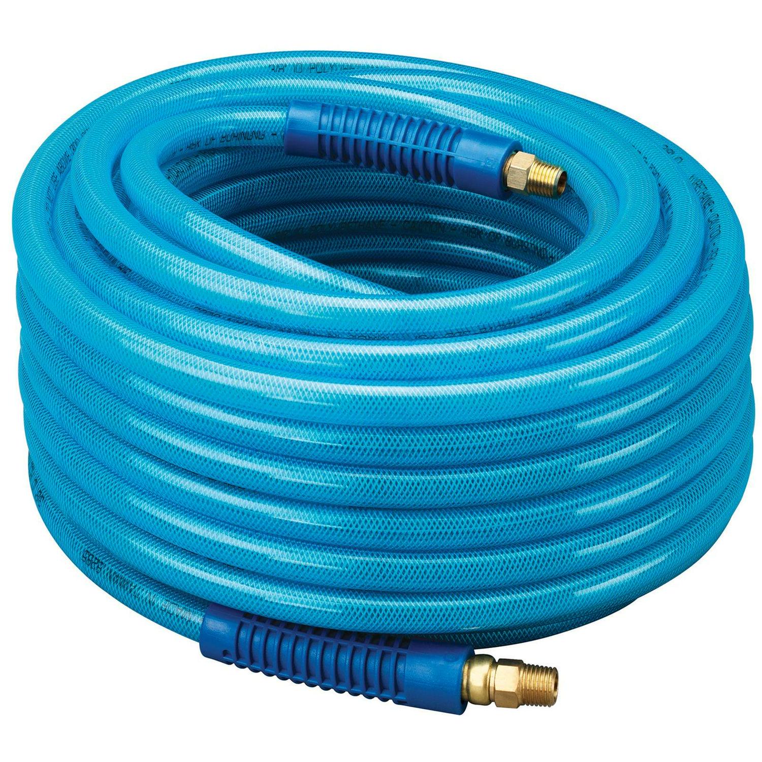 – Blue polyurethane tube and cover for durability, flexibility in cold weather, and resistance to weathering, abrasion, oil, and kinks
