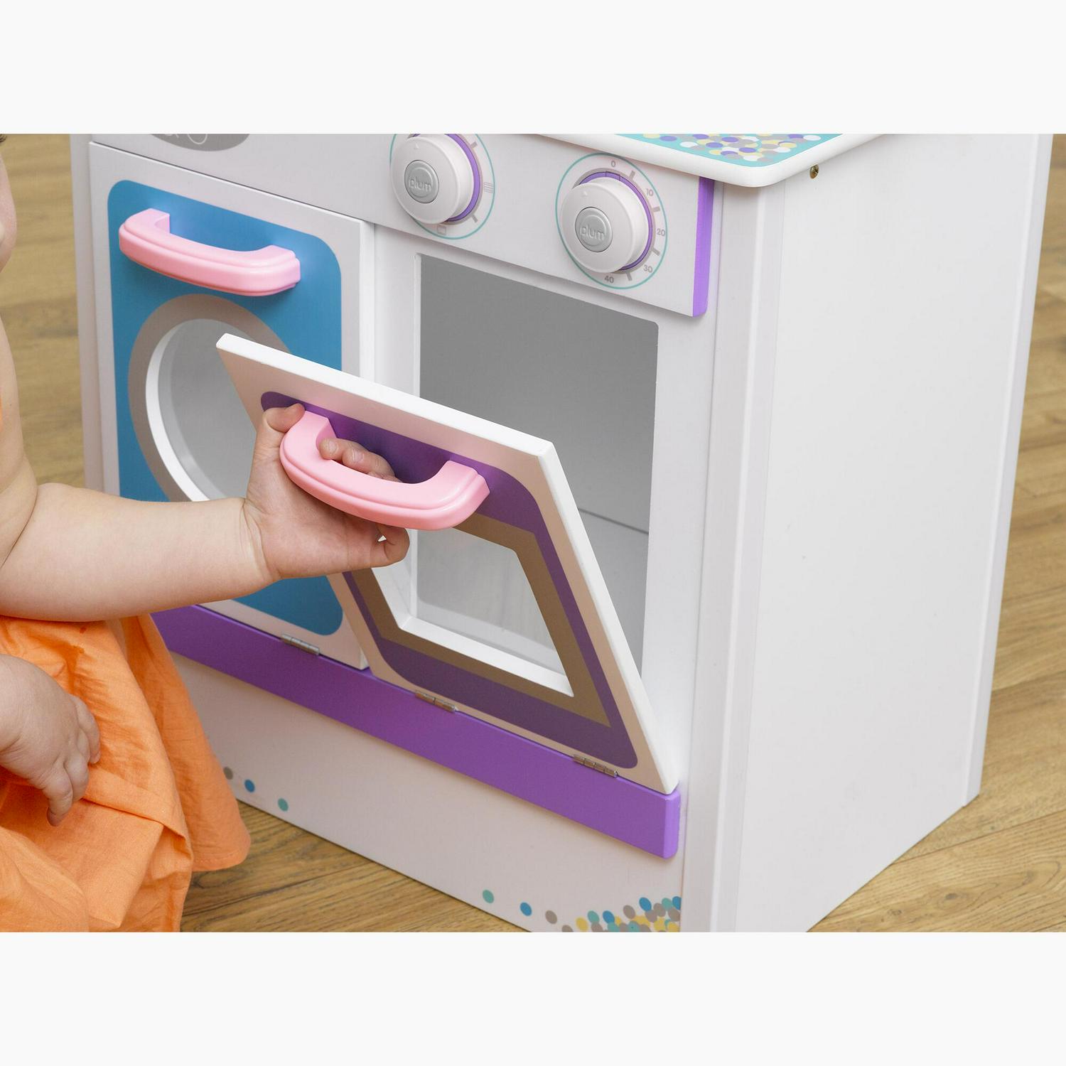 The colorful PlumCook-a-lot Chive Wooden Kitchen is the perfect first kitchen for little cooks. Aspiring chefs can use the click and turn knobs to set temperature, fry on the hobs, bake cakes inside the oven and even do their laundry in the washing machine.