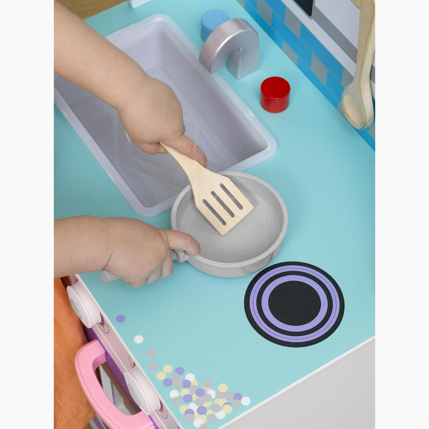 Cleaning up couldnt be easier, the removable sink can be filled up with water to wash the wooden accessories which include frying pan, spoon and spatula, so that little chefs can start cooking straight away.