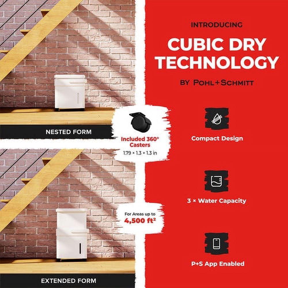 Lift and Twist Dehumidifier This Pohl Schmitt 4500 Sq Ft Cube Dehumidifier with Cubic Dry Technology has a unique lift-and-twist design. Raise and rotate to transform it into its extended form to enjoy a bigger water tank capacity and a longer running time without the need for frequent draining! In nested form, it becomes compact and easy to store. Energy Star s Most Efficient for 2021 Recognized by Energy Star as one of the most efficient portable dehumidifiers for 2021. It costs less to operate, delivers more value, and is better for the environment than non-Energy Star units. WiFi Enabled for Smart Humidity Control This is a WiFi enabled dehumidifier that lets you monitor the humidity level in the room real-time. Just download our app on your smartphone, follow instructions, and start monitoring! You can also take control through the LED control panel: power the unit on or off, set the timer, adjust the fill level, activate Continuous Dehumidifying mode, etc. Easy to Transport with 360° Casters Moving this appliance from one room to another is effortless as it has 360° casters. Just roll those casters to different rooms within your home such as your bedroom, living room, kitchen, bathroom, and laundry room. No lifting required! Quiet Operation With a noise level of 48 dB, this dehumidifier quietly runs in the background. Comfortably sleep, work, study, or go about your day even with this unit turned on. You won t even notice it s there!