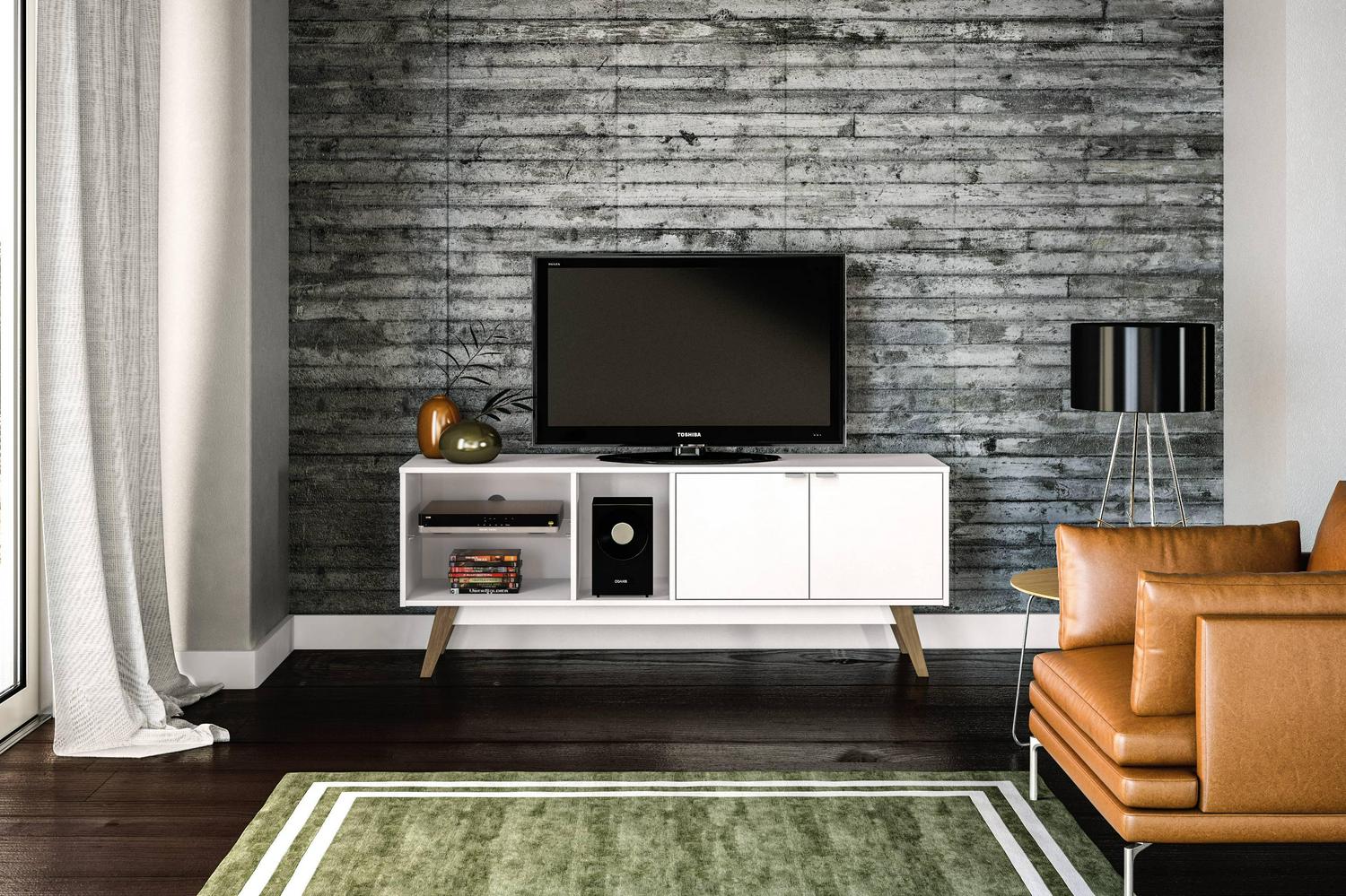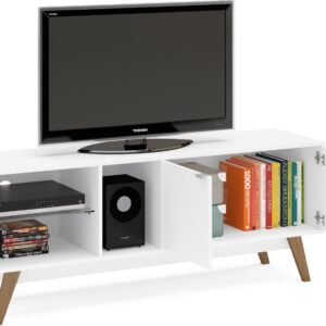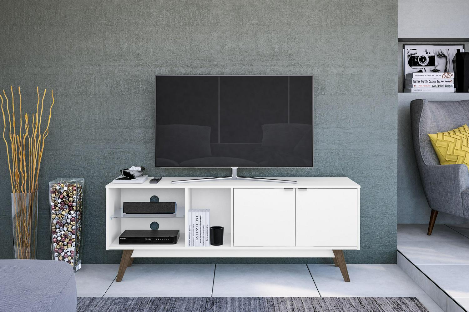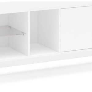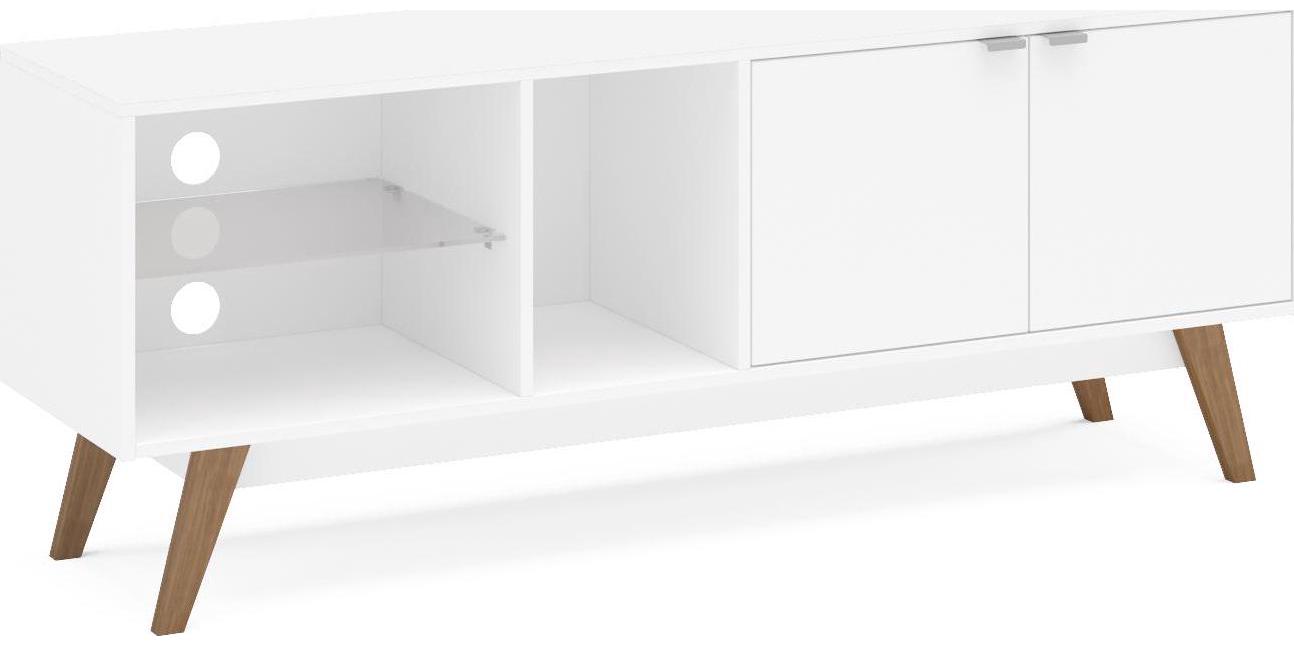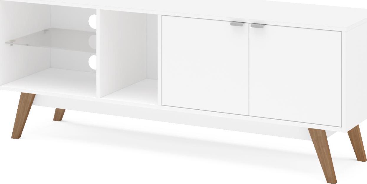 The Bariloche TV stand from Polifurniture is a beautiful piece for your living room, its low-profile sleek design combines looks with function. It can hold up to a 60-inch TV and has ample space for all your media storage needs. The clean white finish combined with glass brings a fresh look to any room. With two doors that enclose a spacious storage space, an open cubby, and two shelves, this TV stand has room for all your entertainment components and more. This TV stand can hold up to a 65-inch TV, so it will look good and help entertain all at the same time. Assembly required. Assembled dimensions: 59.06 in W x 15.75 in D x 22.75 in H