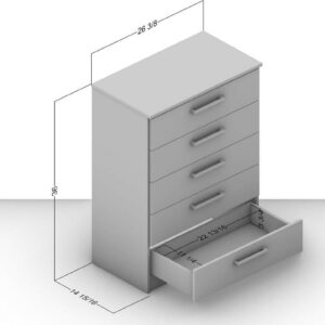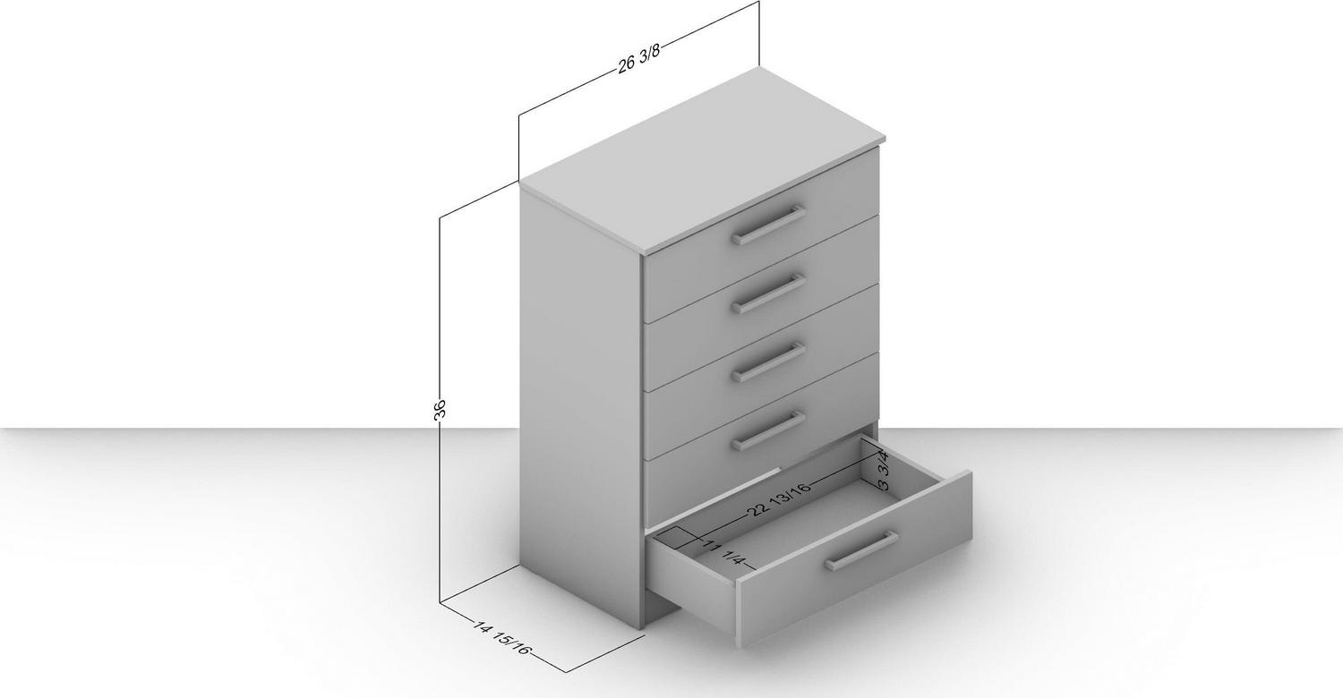 Add a modern look to your room with the Juliette 5 Drawer Dresser from Polifurniture. The clean lines and solid finish will compliment any bedroom. The 5 drawers provide plenty of storage space to keep all your personal belongings organized This dresser is available in a white, dark brown or black finish. It is constructed from engineered wood with a resistant melamine finish to protect against everyday use. Pair with any of the items in Polifurniture’s Juliette Collection for a complete bedroom set. Assembly required; instructions provided. Assembled dimensions: 26.375 in. W x 14.31 in. D x 36 in. H