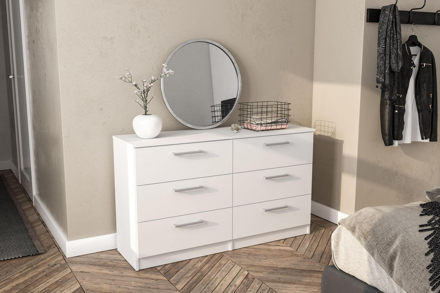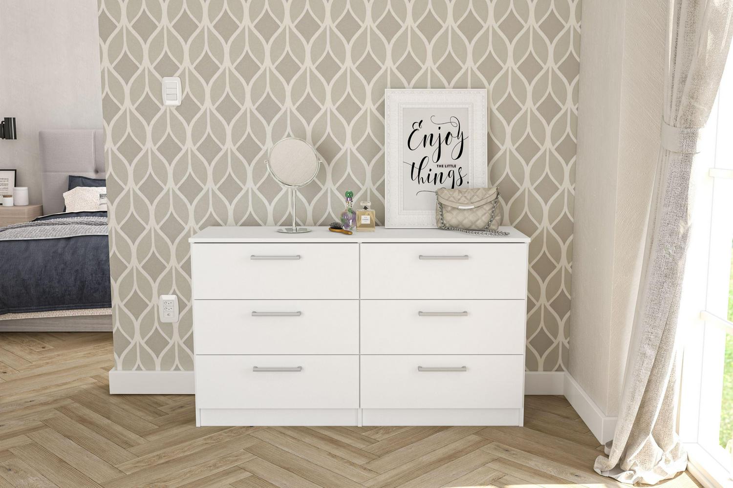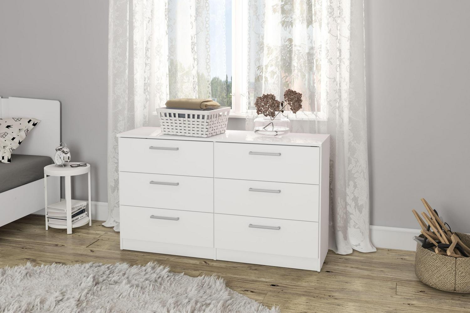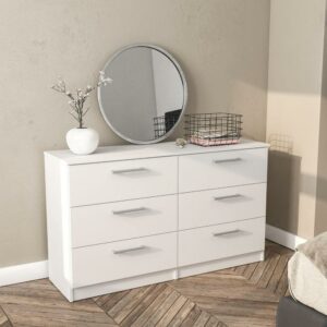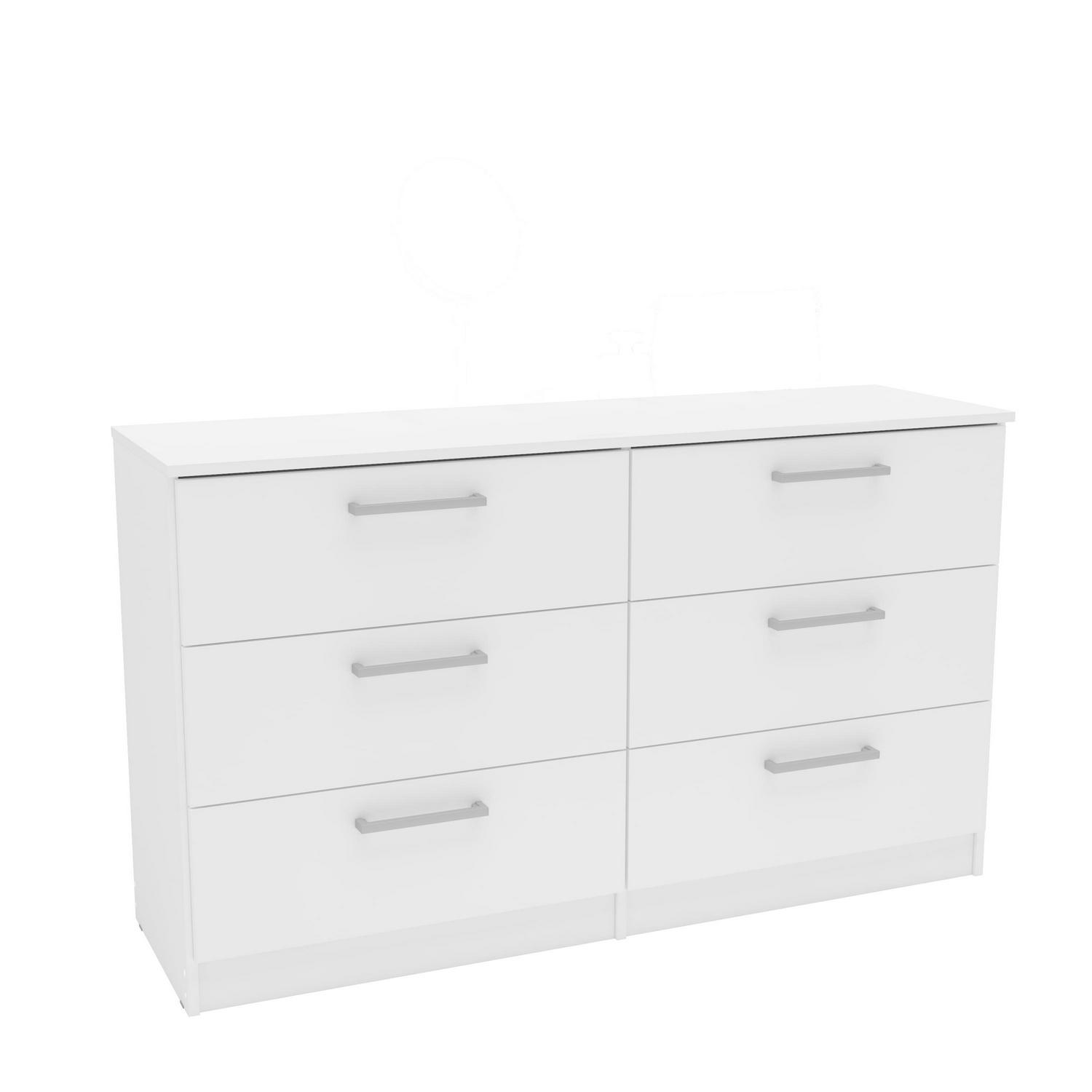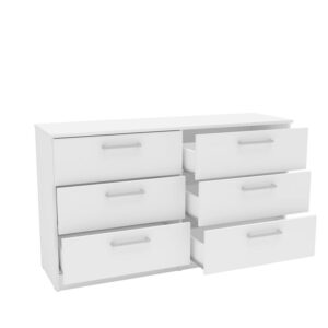 Update the look to your room with the Juliette Modern 6 Drawer Double Dresser from Polifurniture. The clean lines and solid finish will complement any bedroom. The 6 drawers provide plenty of storage space to keep all your personal belongings organized. This double dresser is sure to give your bedroom a modern flair while boasting ample storage space for all of your bedroom needs. This dresser is available in multiple color options, and is constructed from engineered wood with a resistant melamine finish to protect again every day use. Pair with any of the items from Polifurniture s Juliette Collection for a complete bedroom set.