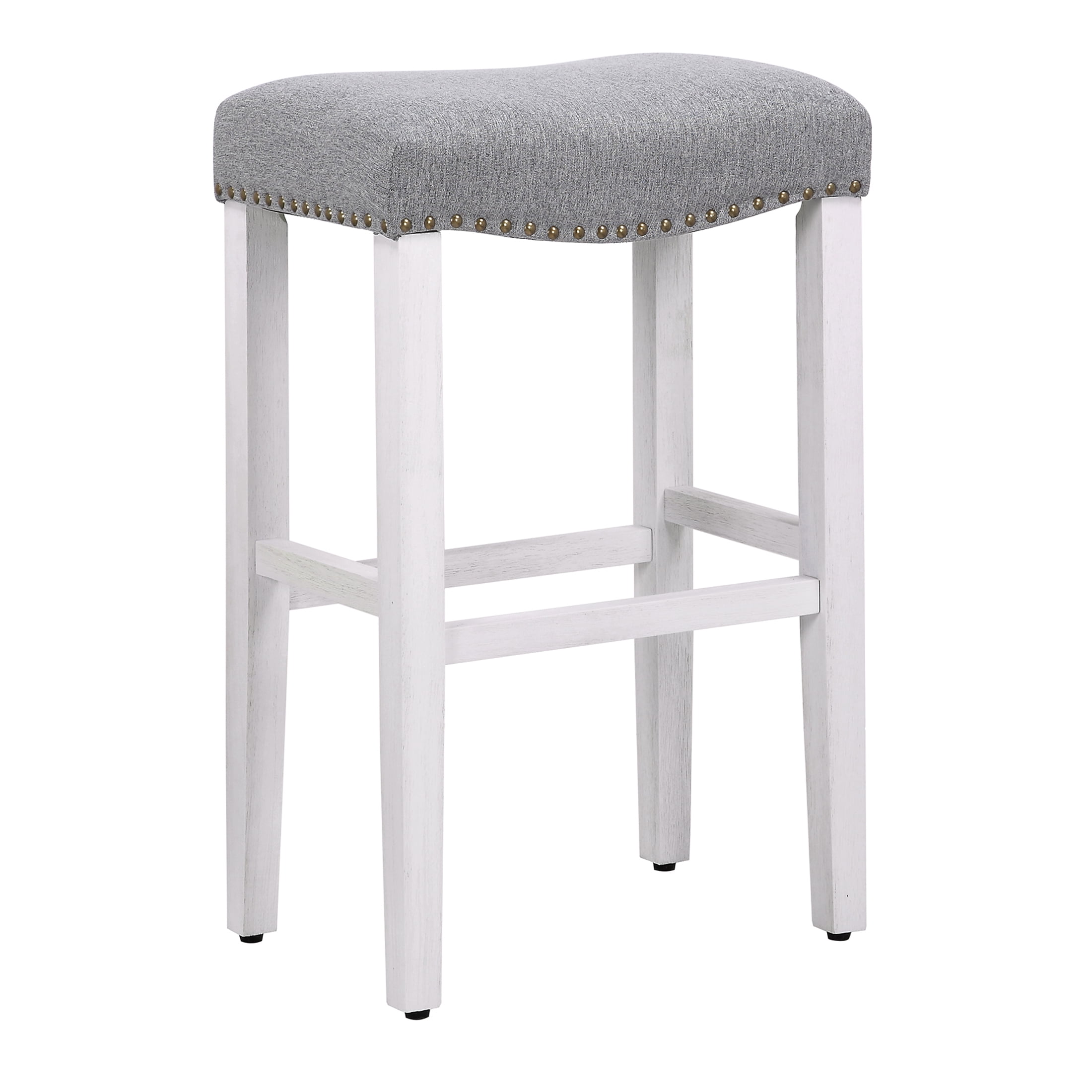 Contemporary Saddle Design Polished Bronze Nail Head Trim Antique White Stained Solid Wood Frame Seat Height: 29″ Inches Simple Assembly Required