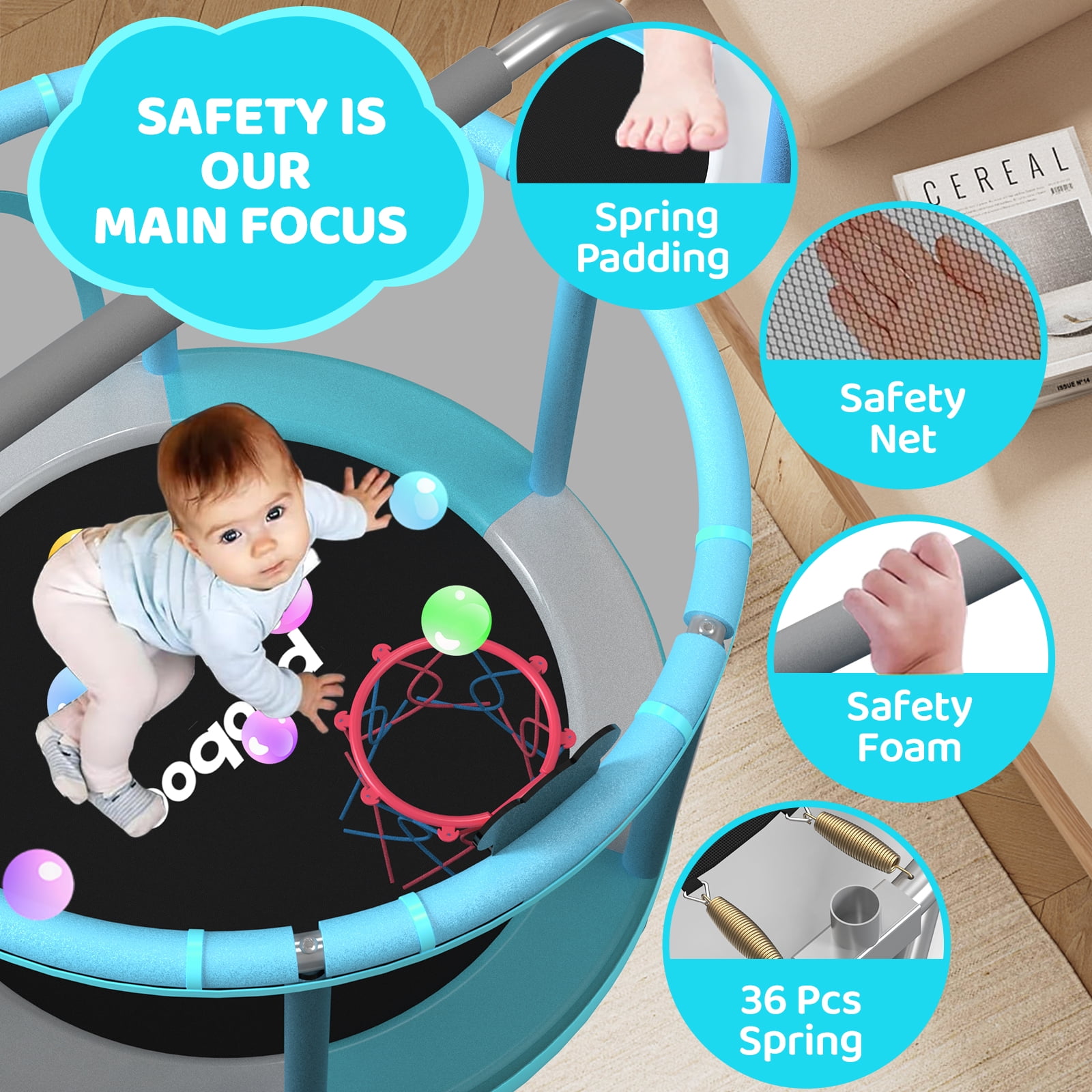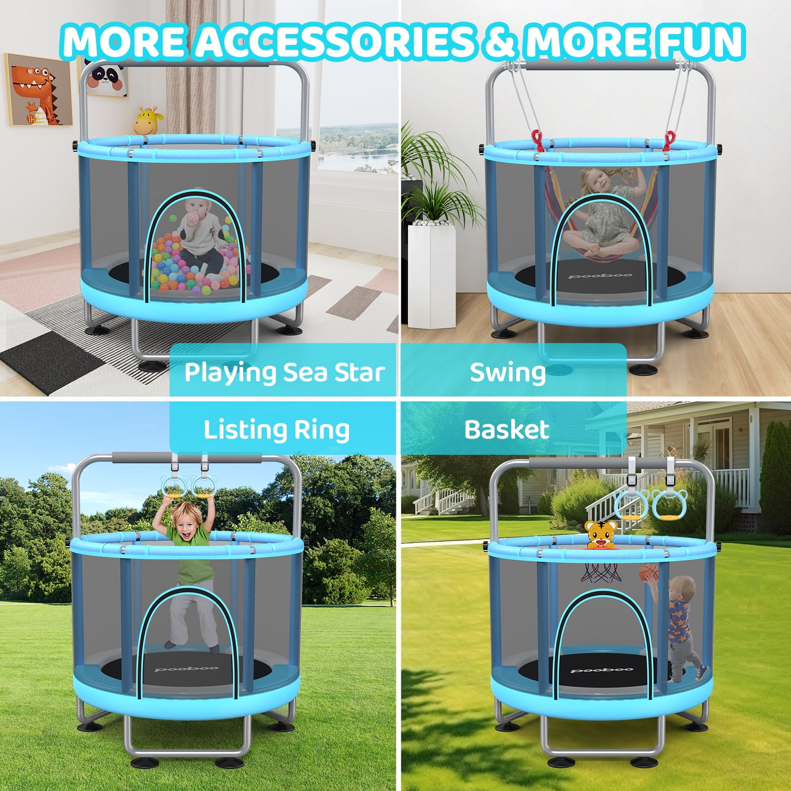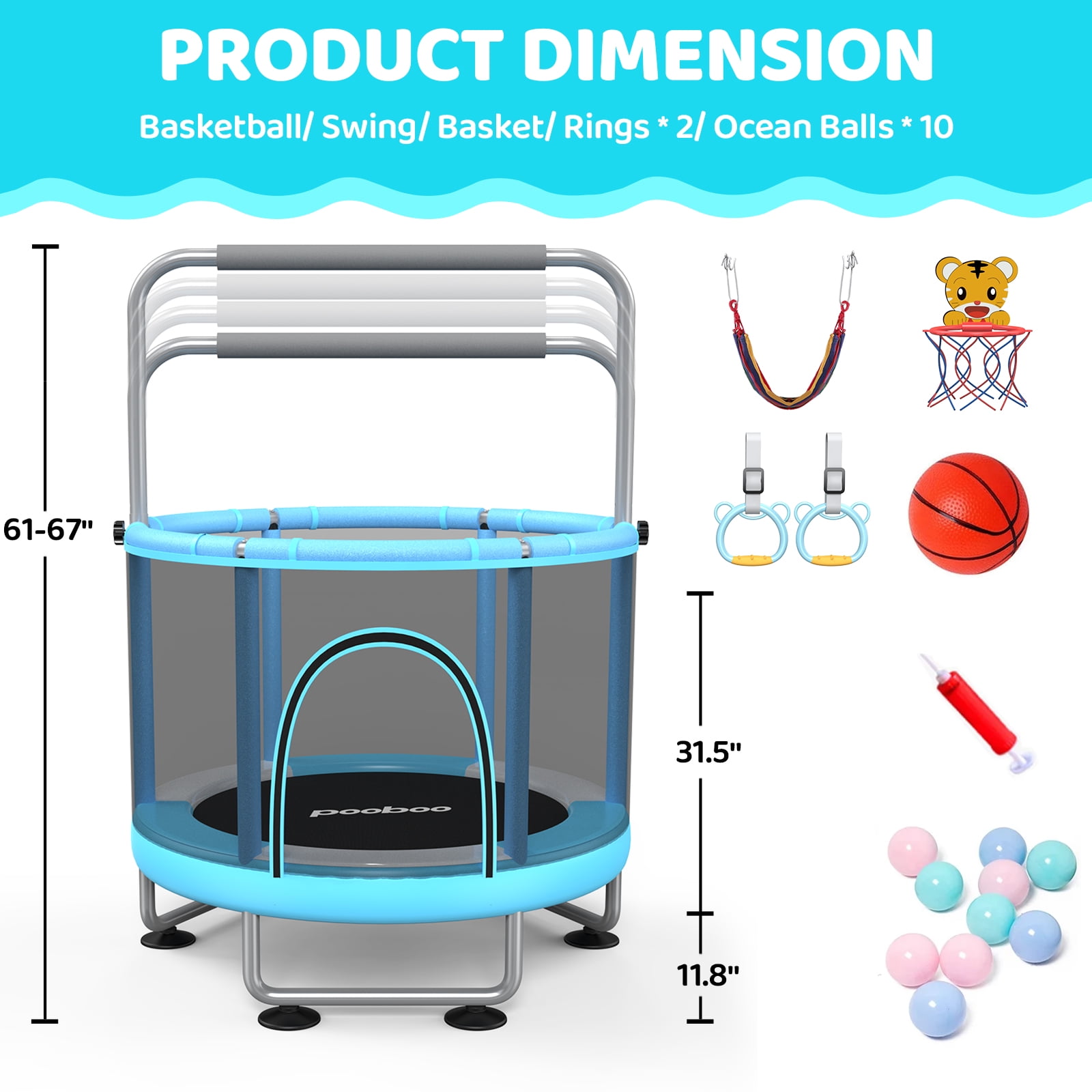 👉【 Safey Design】Pooboo trampoline is equipped with a thickened enclosure net to protect you from falling when jumping, while allowing you to enjoy the fun of free jumping. With elastic jumping mat, and thickened spring cover pads. The No-Gap design design completely covers the springs for safe jumping. Provides protection and comfort during use. 👉【 Excellent Bounce Performance】The kids trampoline has 36 galvanized spring, all springs have undergone 30,000 extreme extension experiments without deformation, creates great bounce to kids experience the fun of bouncing while playing. The heat treatment process improves elasticity and durability, so it will not break down after long-term jumping. 👉【 Stable & Strong Structure】The 60″ mini chirdren’s trampoline can accommodate up to 2 children ages 1-13 years old. 3 U-shaped legs with silent suction cups for soundless and effective floor adherence, combined with 6 vertical and 6 horizontal safety bars, enhance the stability and safety of the trampoline and provide all-around safety protection. 👉【 Providing Fun】This toddler trampoline comes with swings, basketball & hoop frame, ocean ball and hanging rings. The removable basketball hoop allows your child to enjoy shooting while jumping and enjoy swinging in their free time. The gymnastic bar comes with 2 handing rings to work on your child’s fitness and balance. The colourful ocean balls also help you train your child’s color recognition skills. 👉【 2 Adjustable Height】The two-level height-adjustable horizontal bar is suitable for children at different stages, and a variety of ways to play can release energy, which can be removed when not needed, and the top is provided with a safety seal for children to play with peace of mind. 👉【 Perfect Gift for your Child】This premium quality trampoline offers you a fun way to get fun, the right fit for your family and yard. Ideal for both indoor and outdoor use, this trampoline is a perfect gift for your kids and friends. 👉【 Easy to install】The small kids trampoline comes with an installation manual, detailing all parts of the trampoline and each assembly step, easy to install without additional tools. 👉【 100% Customer Satifaction & Warranty】 If you encounter any problems during use, please contact us in time,We will answer you within 24 hours. You will have 1 year warranty, we will not onlly return and refund, will offer you the best way to solve your problems! DEFINETELY 100% CUSTOMER SATISFACTION WHEN YOU CONTACT US!