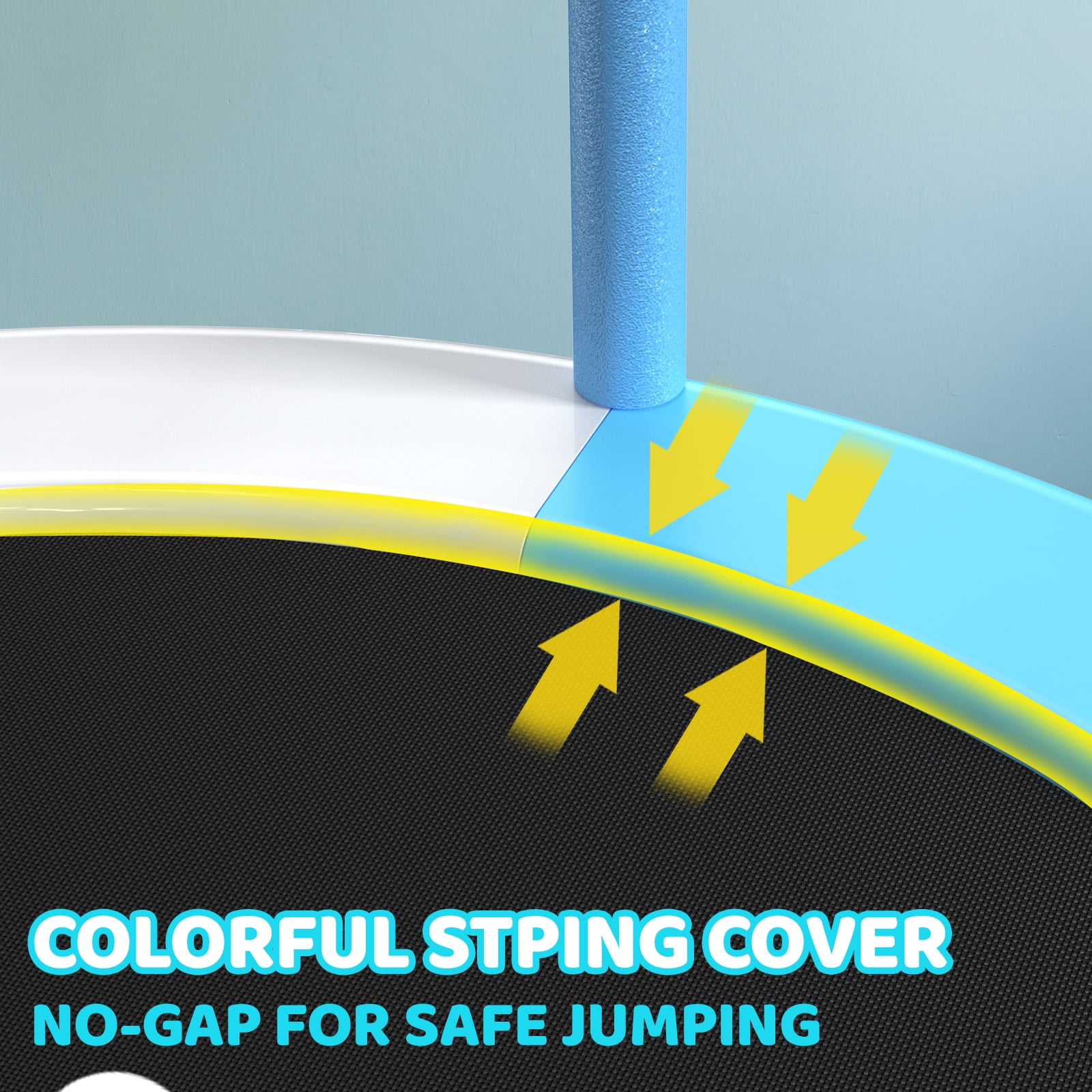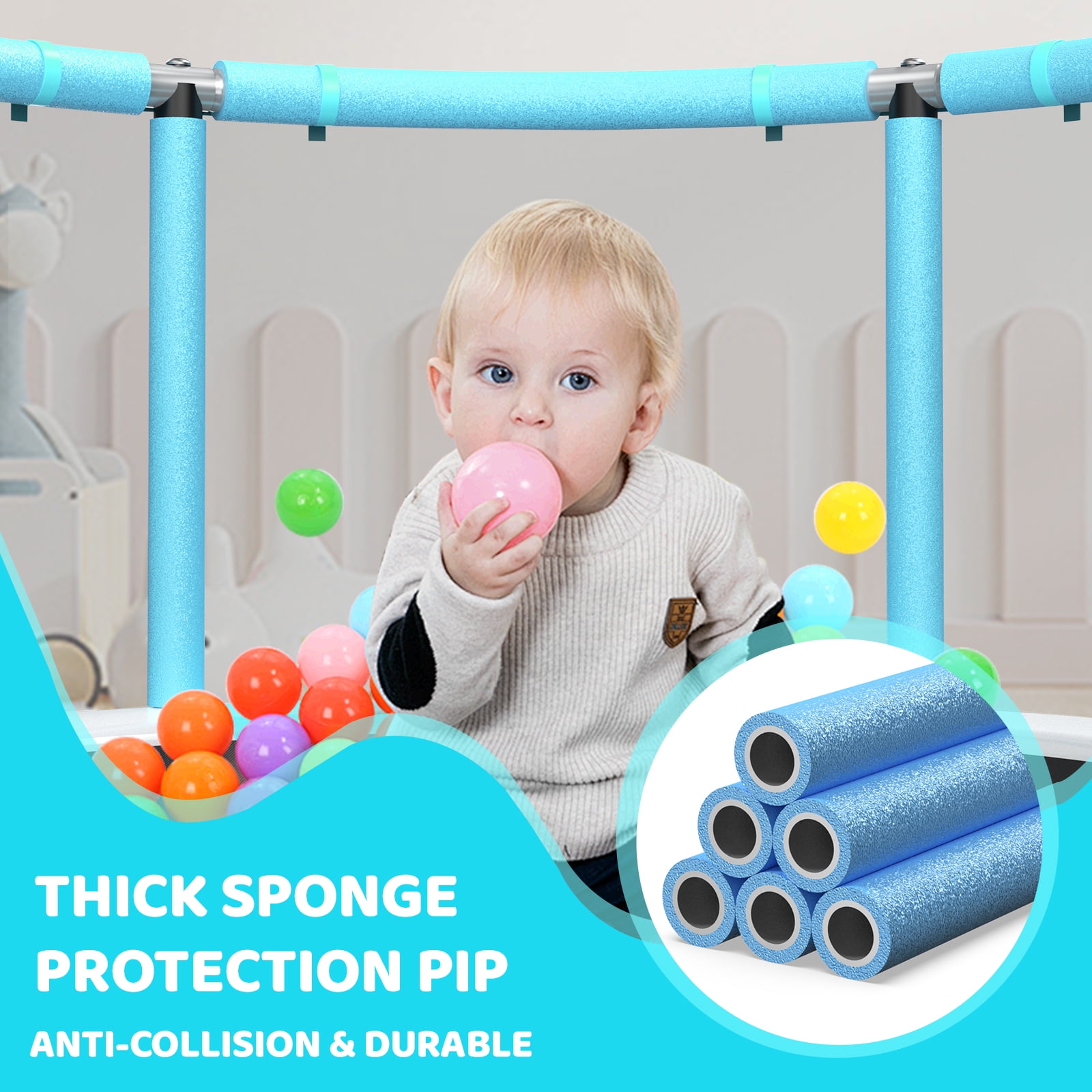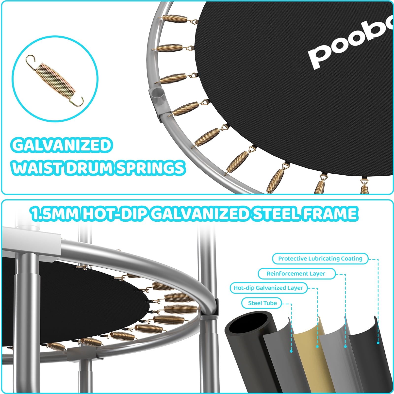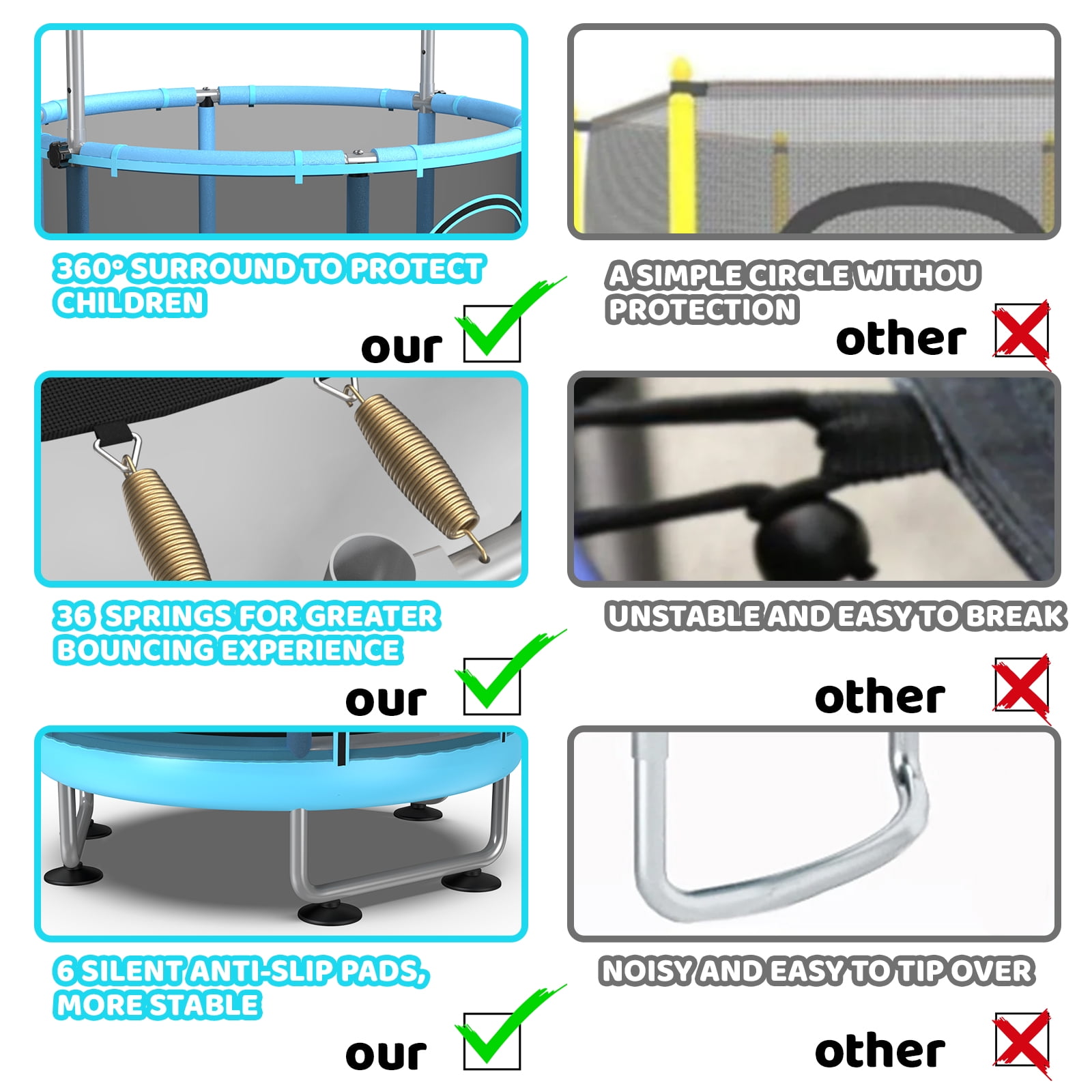 👉【 Safey Design】Pooboo trampoline is equipped with a thickened enclosure net to protect you from falling when jumping, while allowing you to enjoy the fun of free jumping. With elastic jumping mat, and thickened spring cover pads. The No-Gap design design completely covers the springs for safe jumping. Provides protection and comfort during use. 👉【 Excellent Bounce Performance】The kids trampoline has 36 galvanized spring, all springs have undergone 30,000 extreme extension experiments without deformation, creates great bounce to kids experience the fun of bouncing while playing. The heat treatment process improves elasticity and durability, so it will not break down after long-term jumping. 👉【 Stable & Strong Structure】The 60″ mini chirdren’s trampoline can accommodate up to 2 children ages 1-13 years old. 3 U-shaped legs with silent suction cups for soundless and effective floor adherence, combined with 6 vertical and 6 horizontal safety bars, enhance the stability and safety of the trampoline and provide all-around safety protection. 👉【 Providing Fun】This toddler trampoline comes with swings, basketball & hoop frame, ocean ball and hanging rings. The removable basketball hoop allows your child to enjoy shooting while jumping and enjoy swinging in their free time. The gymnastic bar comes with 2 handing rings to work on your child’s fitness and balance. The colourful ocean balls also help you train your child’s color recognition skills. 👉【 2 Adjustable Height】The two-level height-adjustable horizontal bar is suitable for children at different stages, and a variety of ways to play can release energy, which can be removed when not needed, and the top is provided with a safety seal for children to play with peace of mind. 👉【 Perfect Gift for your Child】This premium quality trampoline offers you a fun way to get fun, the right fit for your family and yard. Ideal for both indoor and outdoor use, this trampoline is a perfect gift for your kids and friends. 👉【 Easy to install】The small kids trampoline comes with an installation manual, detailing all parts of the trampoline and each assembly step, easy to install without additional tools. 👉【 100% Customer Satifaction & Warranty】 If you encounter any problems during use, please contact us in time,We will answer you within 24 hours. You will have 1 year warranty, we will not onlly return and refund, will offer you the best way to solve your problems! DEFINETELY 100% CUSTOMER SATISFACTION WHEN YOU CONTACT US!