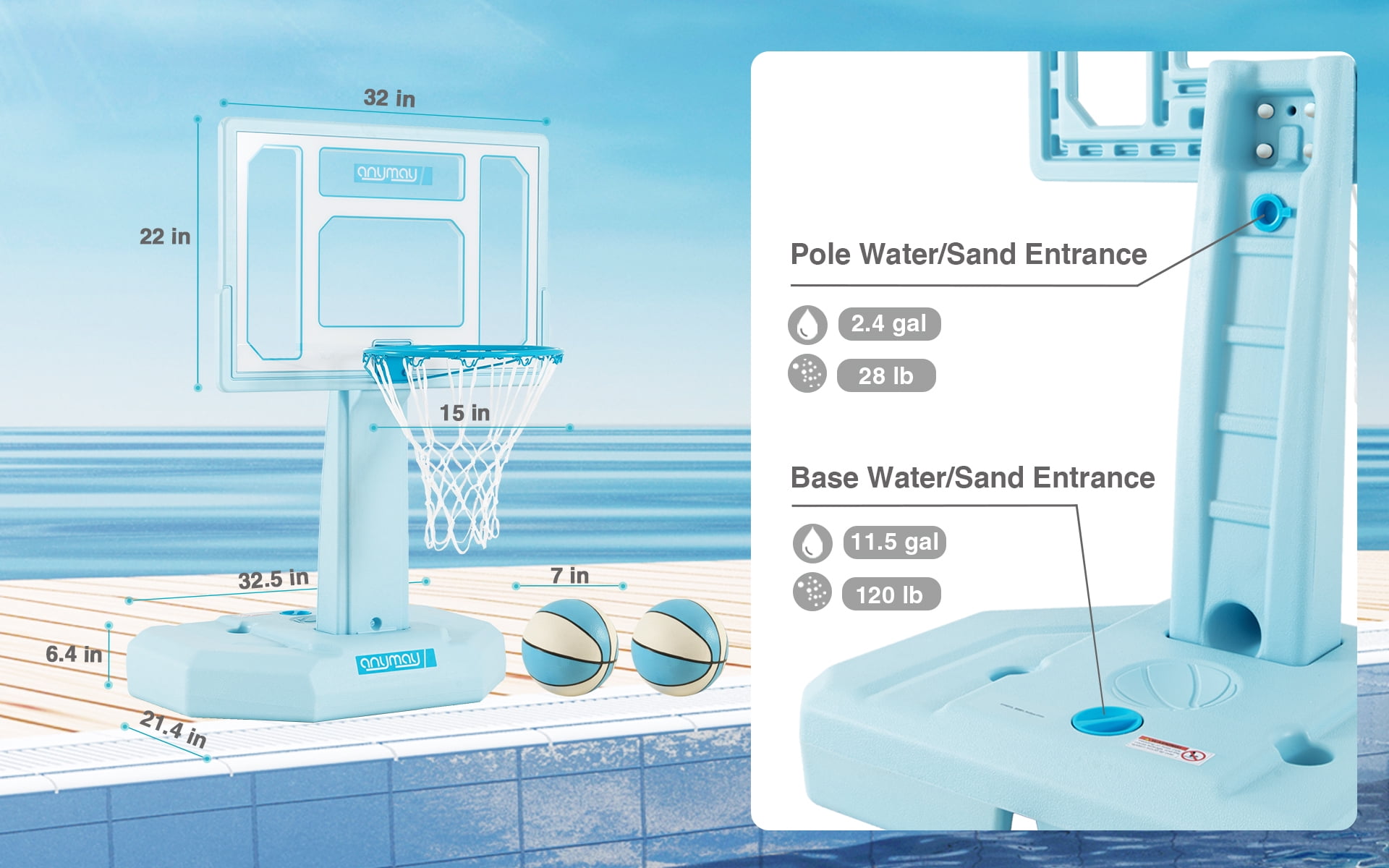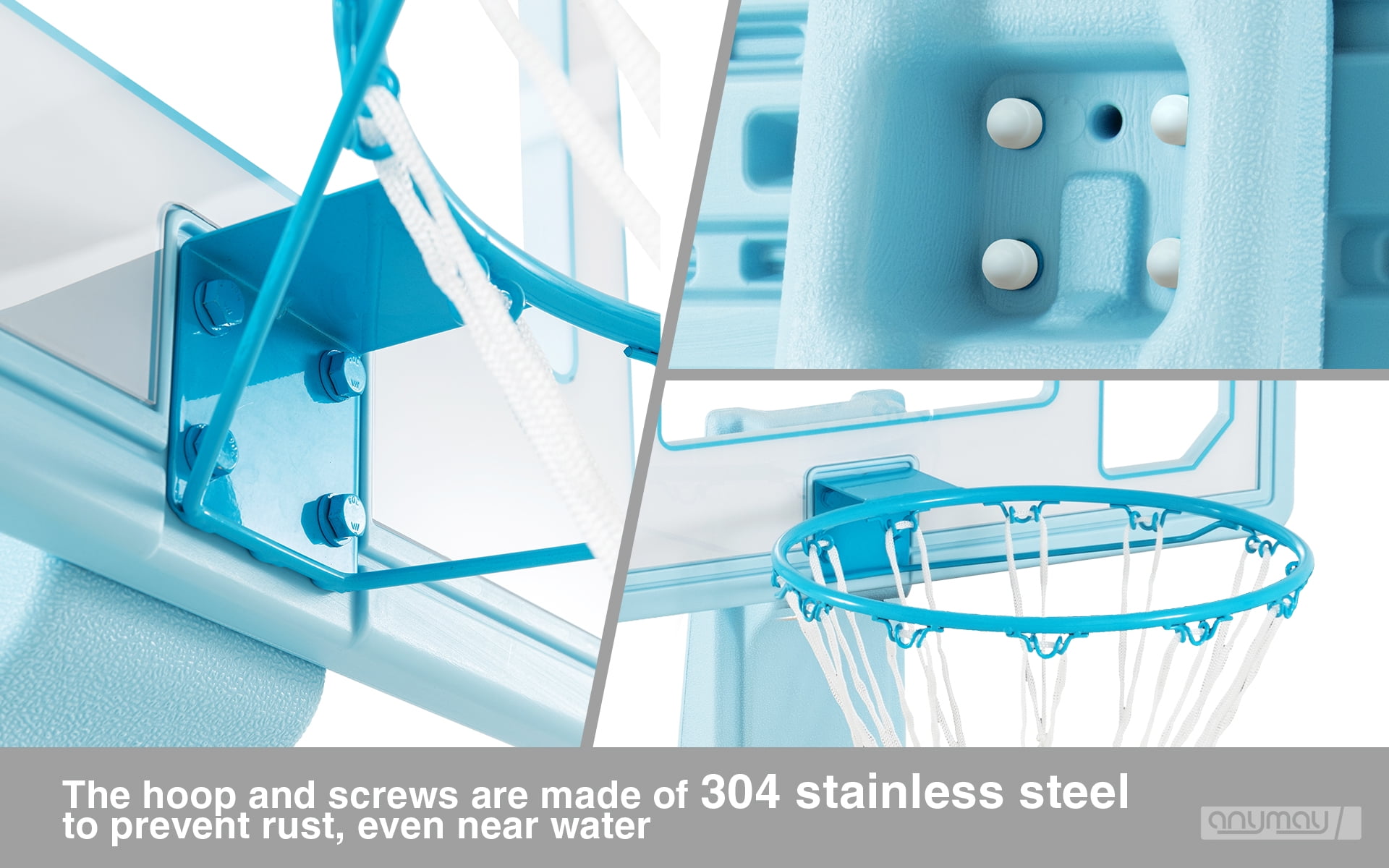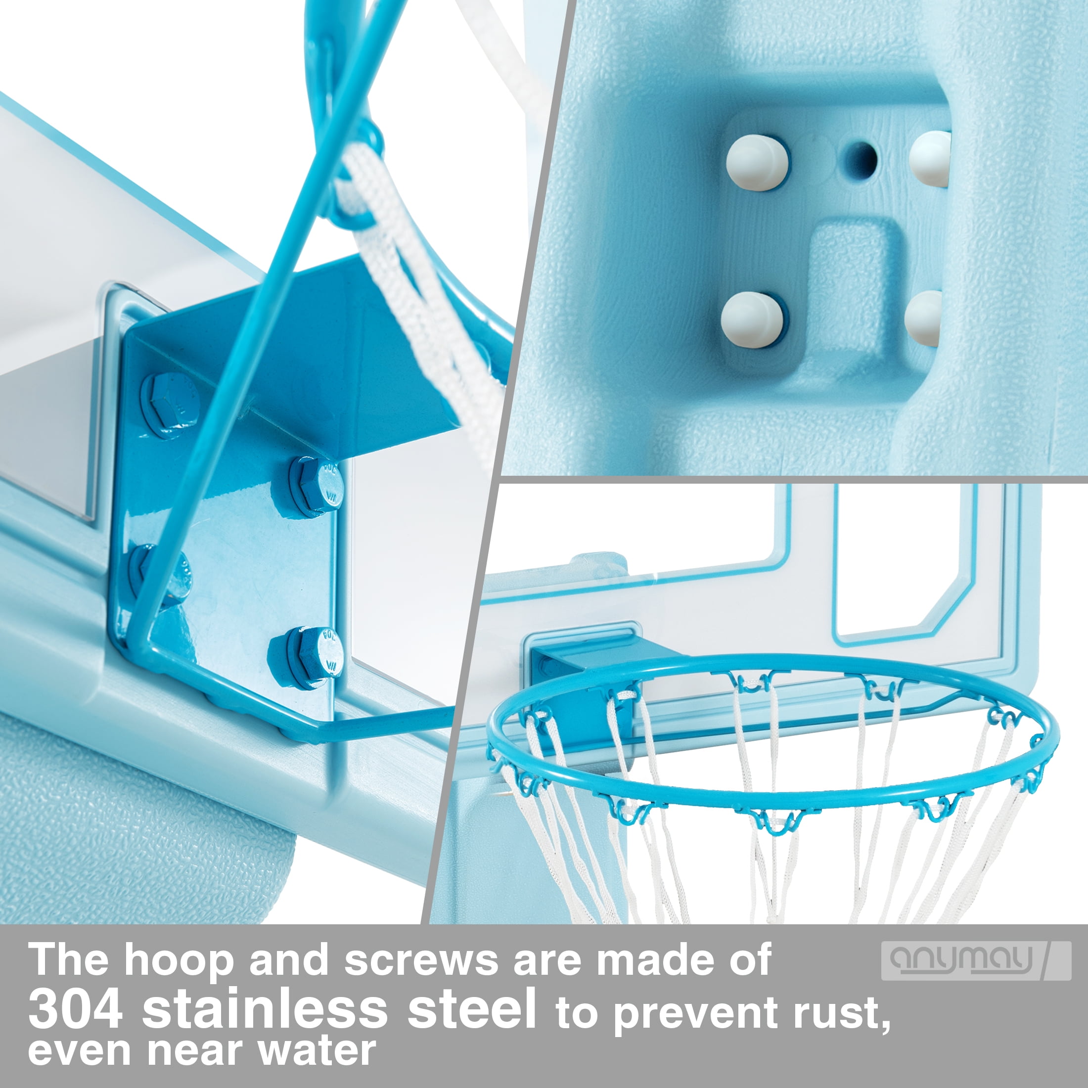 Enhance your poolside basketball experience with ANYMAY’s exclusive design, featuring a range of improvements from color options to structural integrity. Unlike fragile inflatable hoops, ANYMAY offers a super durable and heavy-duty portable basketball hoop. Features: – Portability: Easily move and set up the portable basketball hoop wherever you want. – Durability: ANYMAY’s hoop is made with high-quality materials for long-lasting use. – Regulation-Size waterproof basketball: Experience an authentic basketball game with a regulation-size waterproof basketball included in the package. – Rust-Resistant: The hoop and screws are made of 304 stainless steel to prevent rust, even near water. – Easy Assembly: Setting up the ANYMAY basketball hoop is quick and hassle-free. – Complete Package: Includes 1 Pool Basketball, 2 inflatable water basketballs, and a ball pump for a full game experience. Upgrade your poolside entertainment with ANYMAY’s portable pool basketball hoop, designed for durability and an authentic basketball experience. backboard_material:PE basketball_backboard_size :32inch age_group:All age