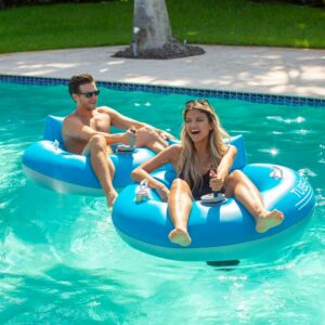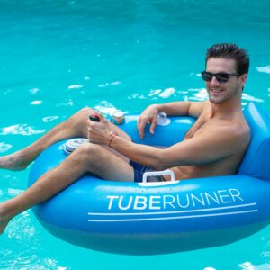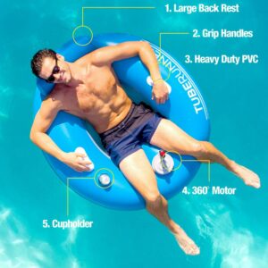 PoPoolCandy Tube Runner Motorized Pool Tube with 3-Blade Propeller Don t Just Float, Drive! BUMP EM, RACE EM, OR JUST RELAX! Tube Runner is the world s most exciting Motorized Pool Tube! PoolCandy motorized floats will revolutionize the way you play in the pool! MOTORIZED POWER AND 360° CONTROL: Drive around the pool with a powerful 66-watt motor that activates at the touch of a button spin and turn in every direction! DESIGNED AND TESTED FOR SAFETY: Tube Runner s 3-blade propeller is fully enclosed behind a protective safety grill. Have fun in the pool, lake or river! COMFORT AND CONVENIENCE: Features a high backrest and a perfectly positioned cup holder. Assembles in minutes no tools required. Includes an adapter so you can inflate with your hair dryer!