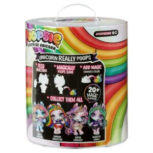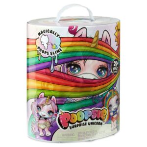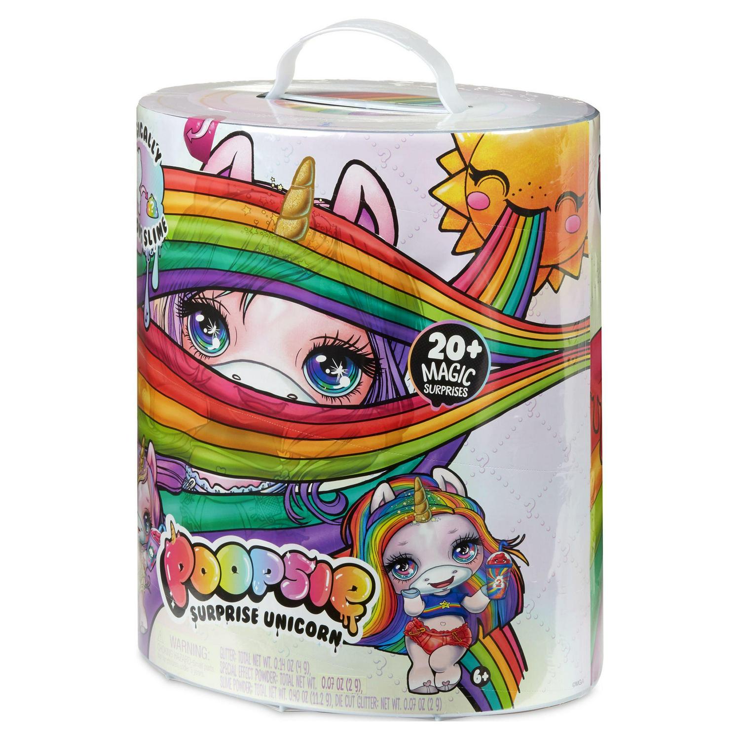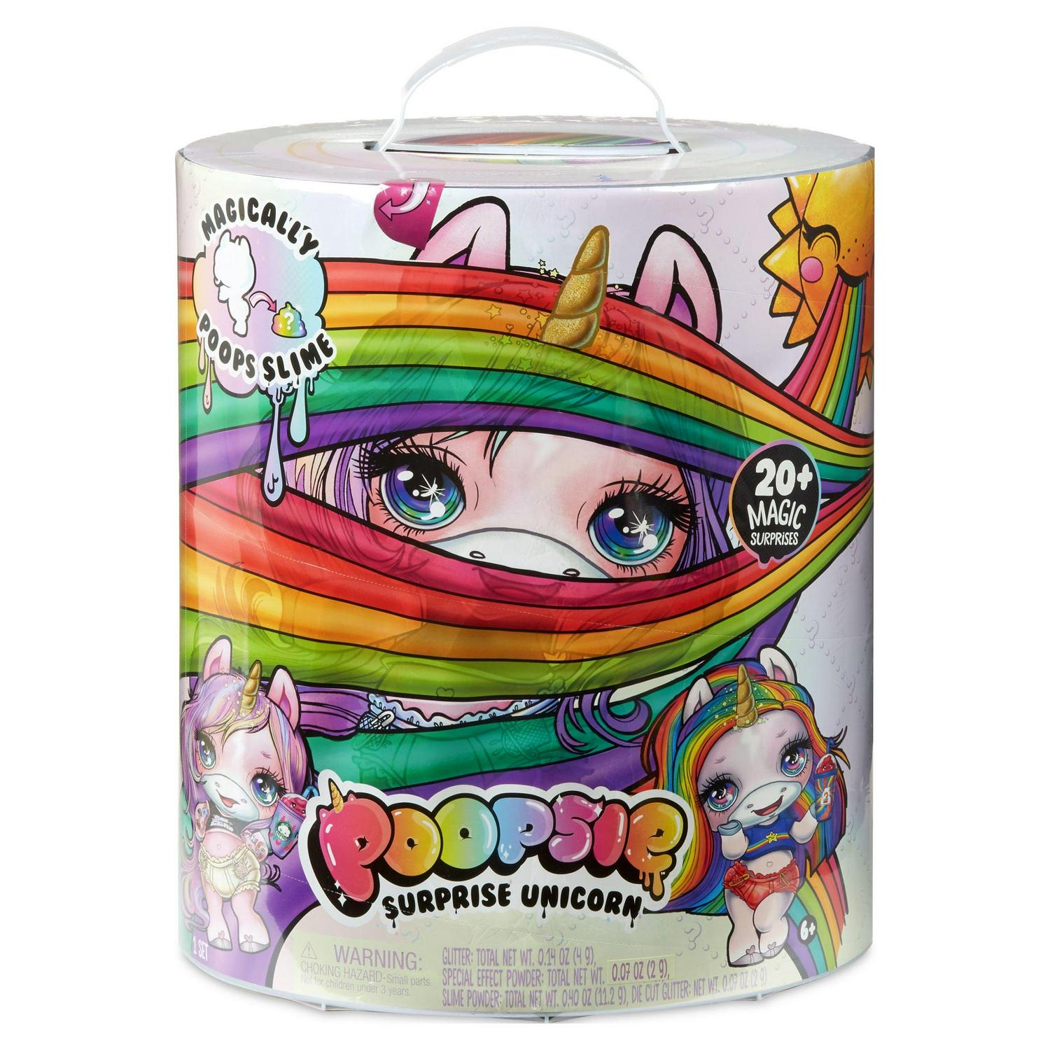 Make magical unicorn poop (slime) with Poopsie slime surprise! with a little unicorn magic and sparkle, you can customize unicorn poop and transform it multiple times! when you gotta go, store the poop for magical fun anytime! poopsie surprise unicorn magically poop slime! each time you feed your surprise unicorn and sit her on her glitter potty, she creates surprise, collectible unicorn poop (slime)! transform your unicorn poop over and over again with unicorn magic! over 20 magic surprises included with each surprise unicorn! four unicorns to collect! will you unroll rainbow bright Star or Oops Starlight Feature: Poopsie surprise unicorn includes one surprise unicorn (rainbow bright Star or oops Starlight)Feature: One glitter pottyFeature: Four unicorn food packets (slime powder), four unicorn magic packets, one unicorn sparkle packet Feature: One exclusive bottle and one exclusive poop character Keychain Feature: One unicorn shirt & diaper, spoon, hair brush, cleaning tool, and measuring cup.