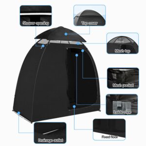 – Patent Pending Design: It has a curtain in the middle to create separated 2 rooms as you like. Large door with double side zippers is convenient to get in & out. Black fabric prevents see in. One hanging rope and two mesh pockets inside are good for storage. One shower opening allows the water hose insert. The mesh top is better for air ventilation and humidity disperse. It also comes with a top cover for UV protection and waterproof.