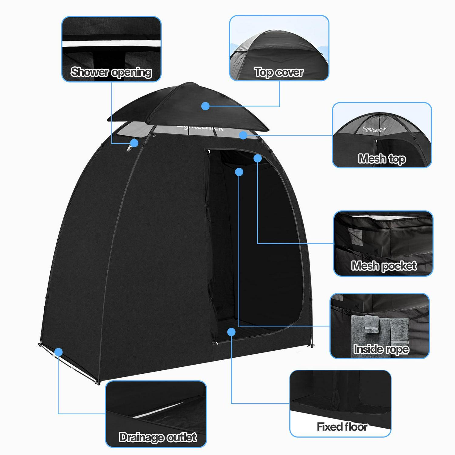 Improving from a single room shower shelter, this 2 rooms shower tent makes camping showers way more convenient. It s nice to have the space to shower, and a nice dry area to potty and get dressed in. Pop up styles make it more sturdy and no pole broken, but still lightweight than other products on the market.With compact carry bag, you can put it in the back of your car and take it with you when go anywhere else, this shower tent can let you skip the lines in the bathrooms, you can dressing and shower on the beach, forest and etc, save your time!