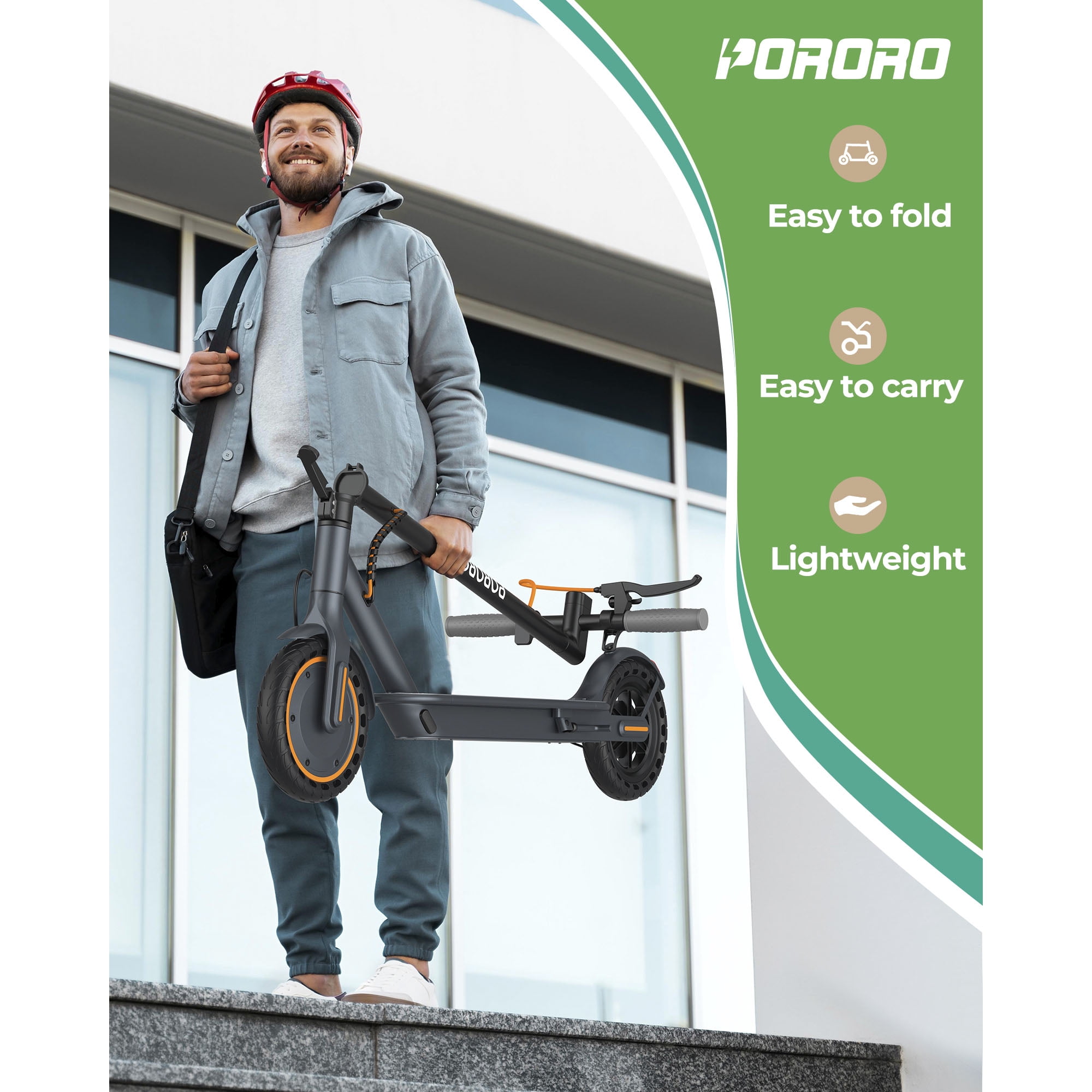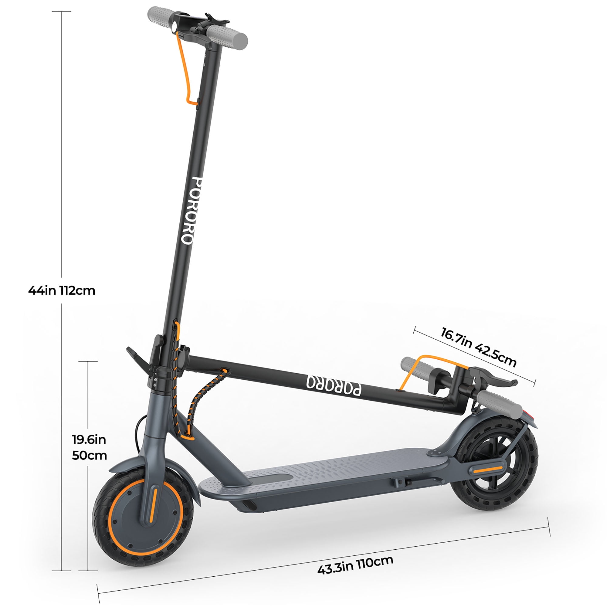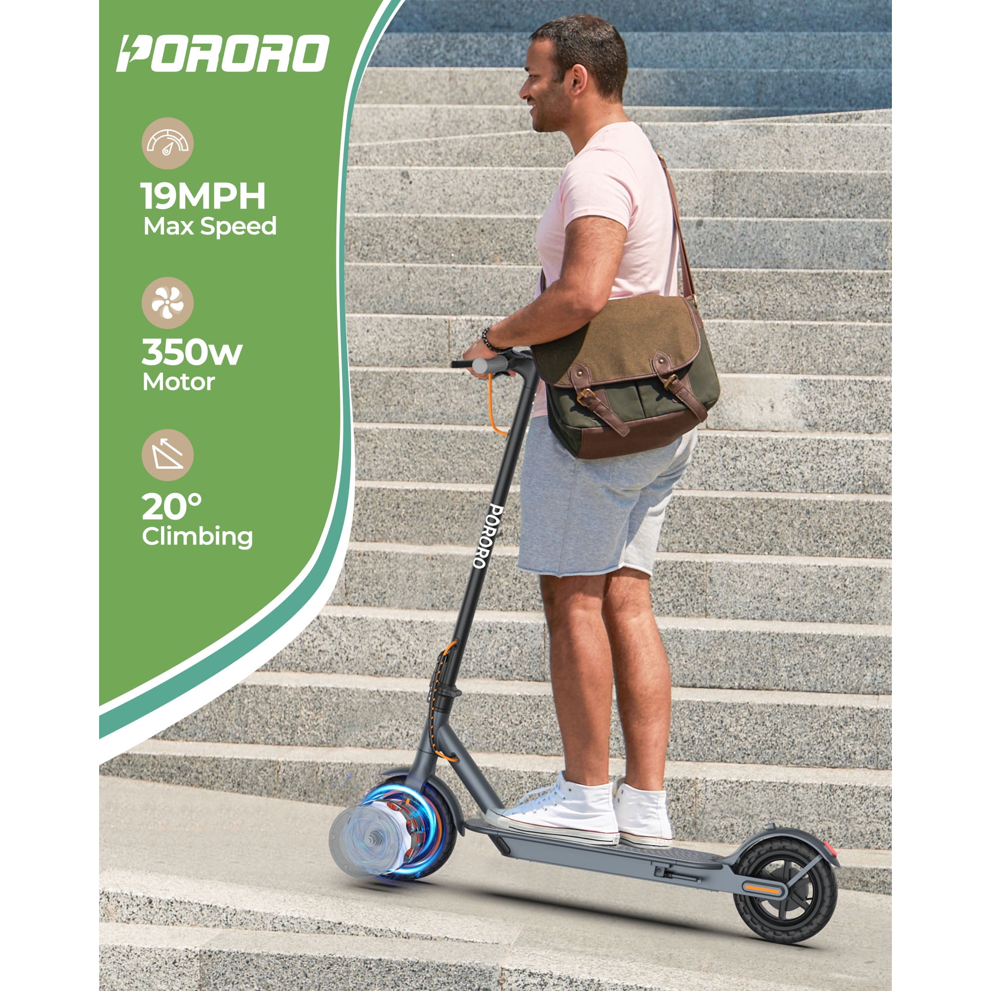 The PORORO is a set design, research and development, production, sales in one of the integrated enterprises. Our philosophy is to respond to the call of the green and low-carbon era and continue to innovate in order to promote our brand to the world while making people’s lives more convenient, healthy and happy. Let’s come to the electric scooter outdoor sports together! Specifications: Brand: PORORO App name: Vicont Frame Material: Aluminum Alloy Motor: 350W high-speed brushless gear motors Battery: 36V 10.5 Ah Mile Range: 12-22 mile / 20-35 km (Actual performance will be affected by user’s weight, road) Max Speed: 19MPH 4 speed level: 6KM/H&12KM/H&18KM/H&31KM/H (equals to 3mph,8mph,12mph,19mph) LCD Display: Shows current speed, speed modes, battery life and headlight. Climbing Capacity: 20° Tyre Size: 8.5 inch Tires Materials: Anti-Skid Solid Tyres (no punctures) Other function: APP lock Double Brake: Front Electric Brake + Rear Dump Brake Net Weight: 12.5KG Max Load: 264 lbs Age suitable: 16 + Waterproof Rate: IP65 Product Dimensions: 42.12″*16.93″*21.26″ Giveaway for: mobile phone holder for electric scooter Simple Folding Step: One-step installation and removal system