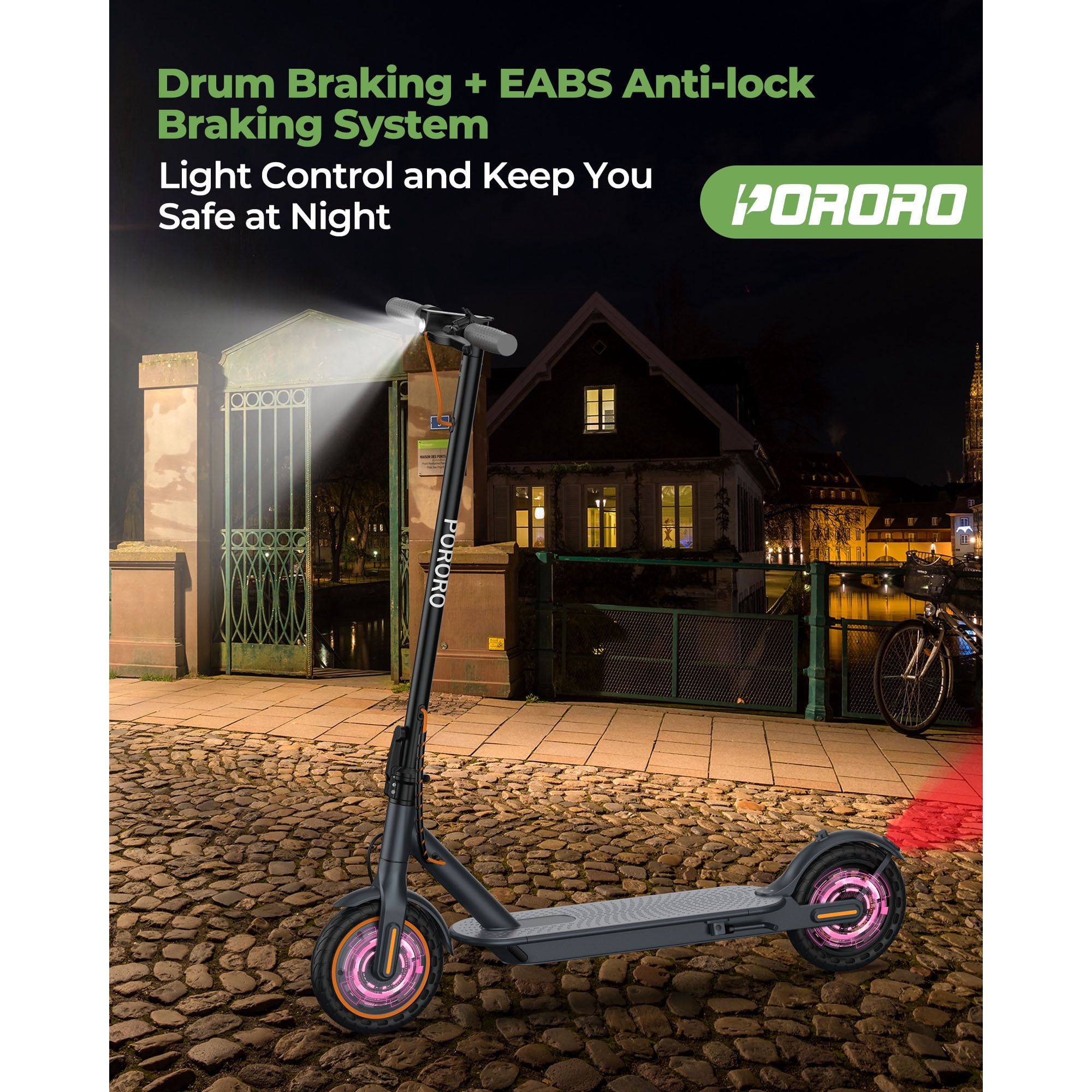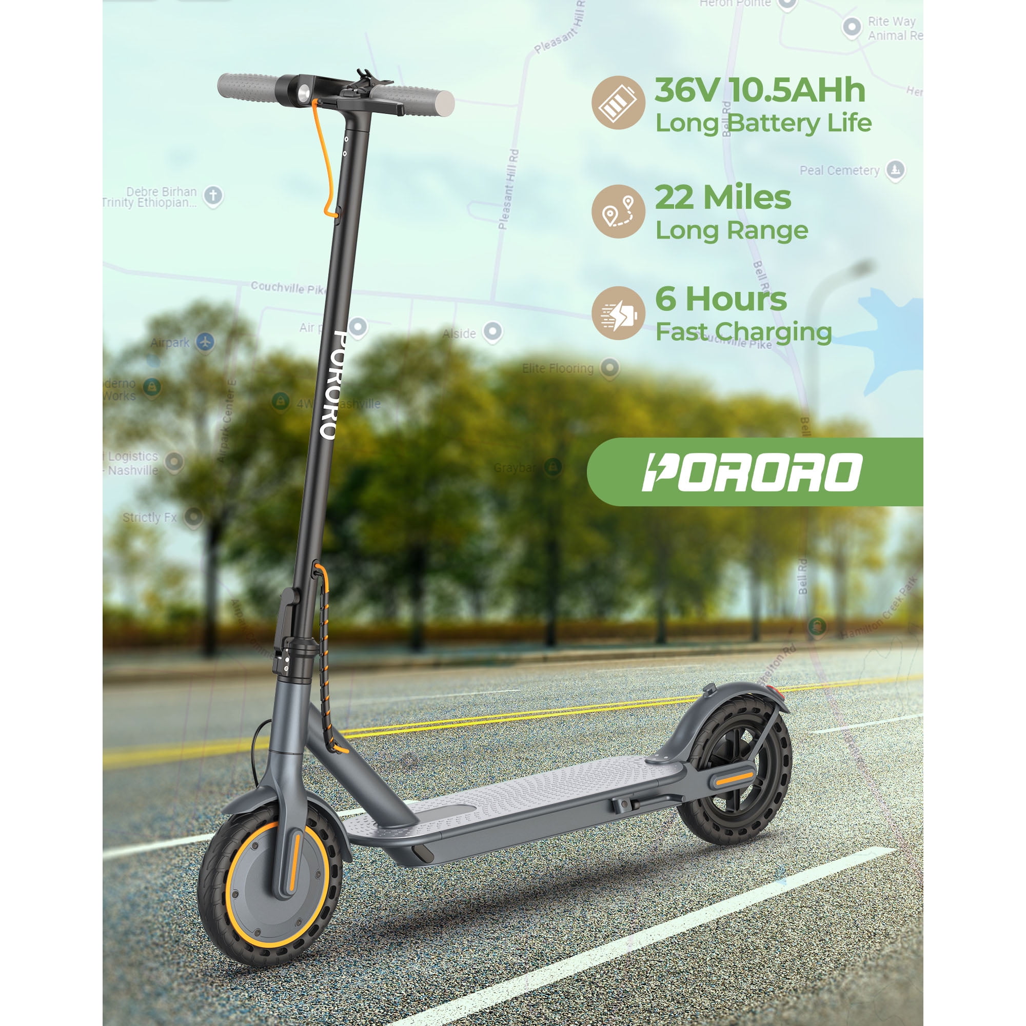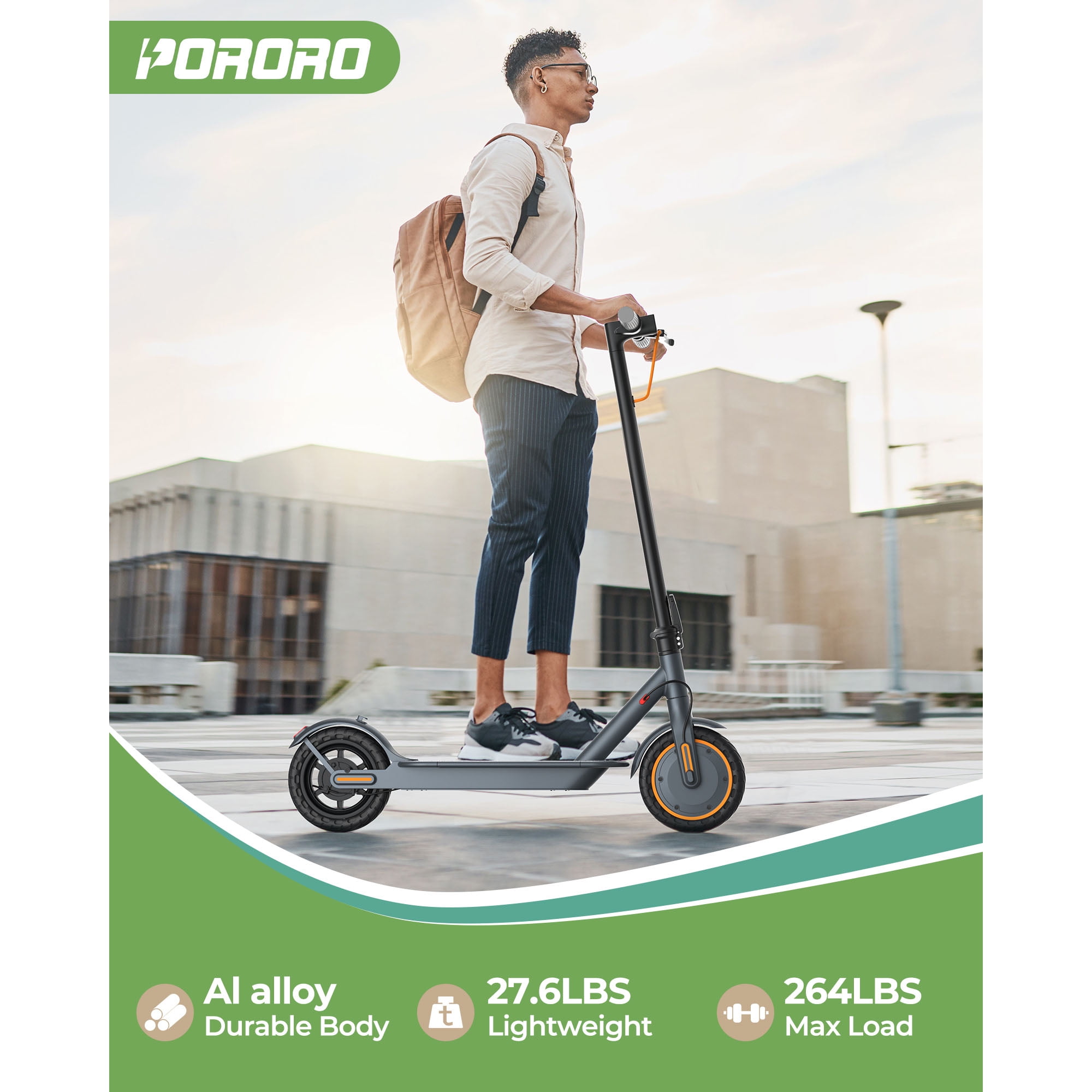 The PORORO is a set design, research and development, production, sales in one of the integrated enterprises. Our philosophy is to respond to the call of the green and low-carbon era and continue to innovate in order to promote our brand to the world while making people’s lives more convenient, healthy and happy. Let’s come to the electric scooter outdoor sports together! Specifications: Brand: PORORO App name: Vicont Frame Material: Aluminum Alloy Motor: 350W high-speed brushless gear motors Battery: 36V 10.5 Ah Mile Range: 12-22 mile / 20-35 km (Actual performance will be affected by user’s weight, road) Max Speed: 19MPH 4 speed level: 6KM/H&12KM/H&18KM/H&31KM/H (equals to 3mph,8mph,12mph,19mph) LCD Display: Shows current speed, speed modes, battery life and headlight. Climbing Capacity: 20° Tyre Size: 8.5 inch Tires Materials: Anti-Skid Solid Tyres (no punctures) Other function: APP lock Double Brake: Front Electric Brake + Rear Dump Brake Net Weight: 12.5KG Max Load: 264 lbs Age suitable: 16 + Waterproof Rate: IP65 Product Dimensions: 42.12″*16.93″*21.26″ Giveaway for: mobile phone holder for electric scooter Simple Folding Step: One-step installation and removal system