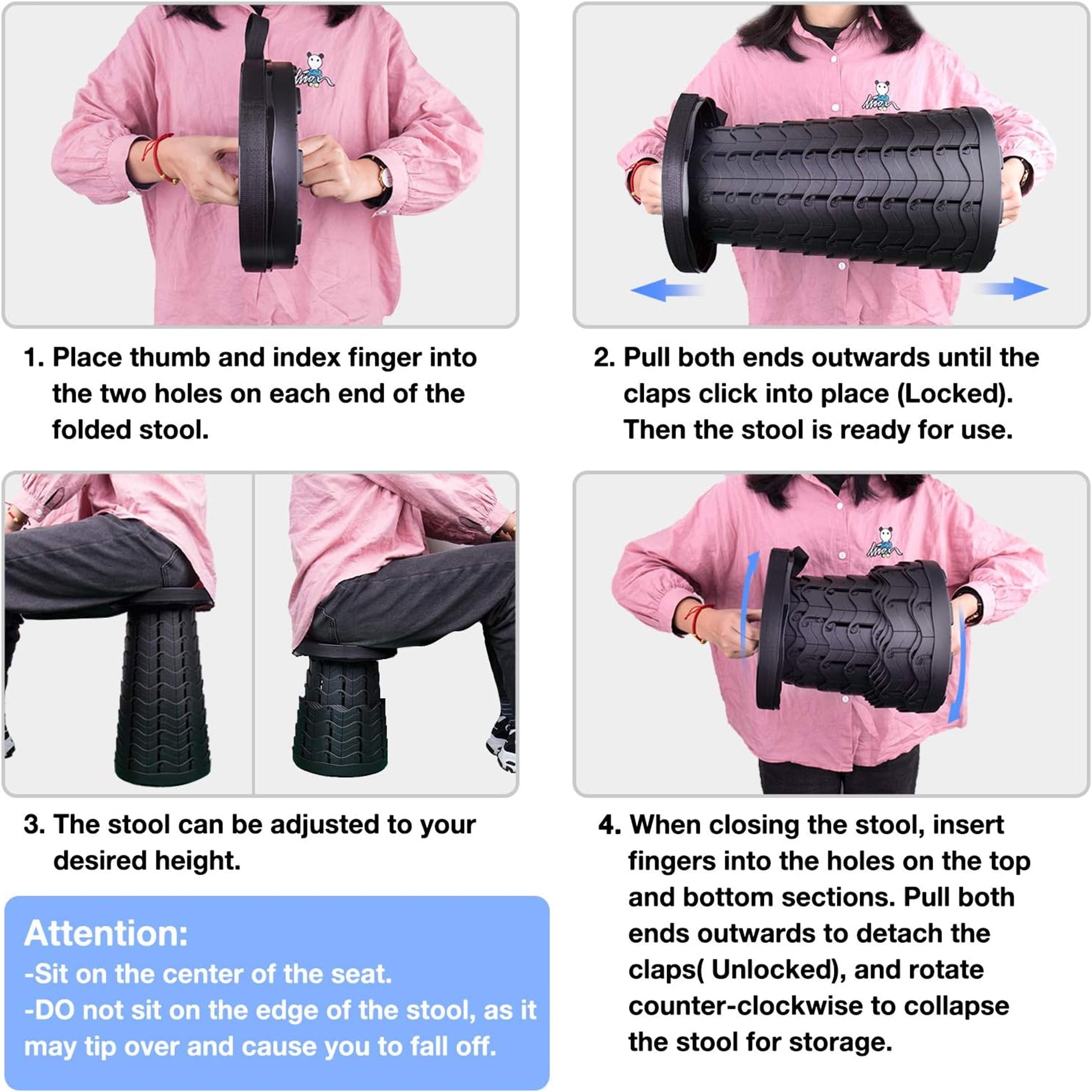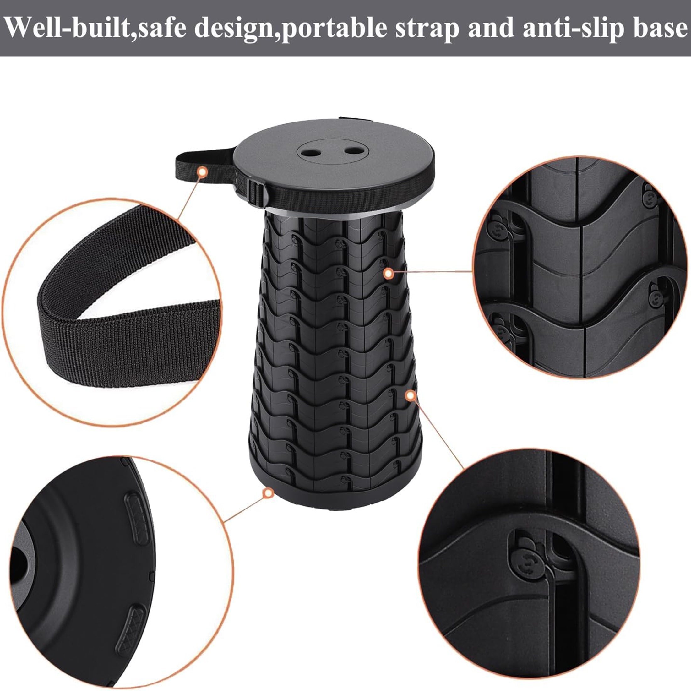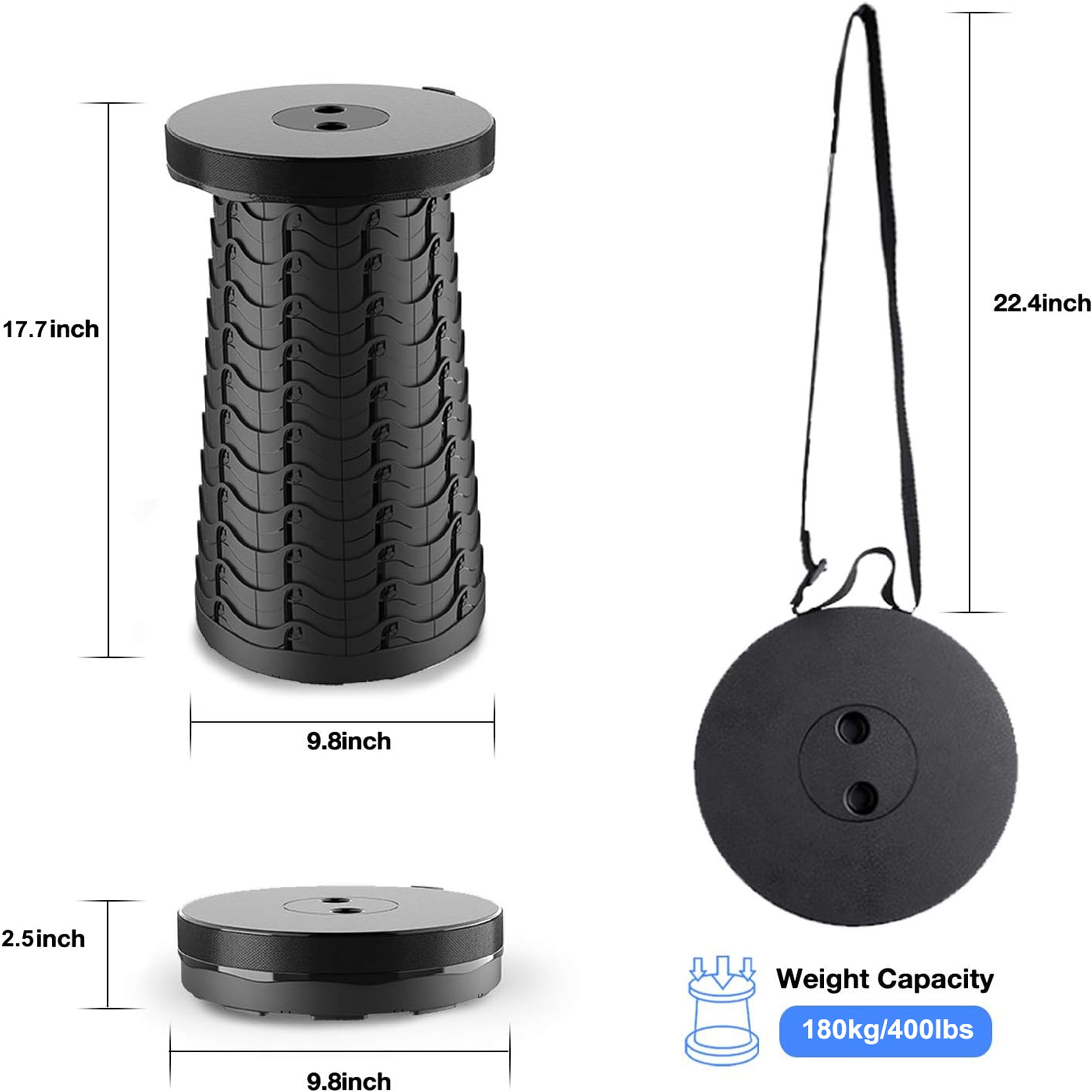 Durable Build with Enhanced Stability: Made from high-quality plastic and designed with a fish-scale structure featuring 120 locks, this collapsible stool is incredibly strong and stable. Supports up to 400 lbs, providing safe and sturdy seating for both adults and kids. Height Adjustable in Seconds: With an adjustable height range from 2.5″ to 17.7″, you can easily set the telescoping stool to your preferred height in a matter of seconds. This makes it suitable for a wide range of activities and users of different ages. Lightweight and Easy to Carry:At just 2.54 lbs, the foldable stool is lightweight and easy to carry with the included shoulder strap or by hand. Its compact size when folded makes it easy to store and transport, perfect for taking on outdoor adventures or keeping in small spaces. Bonus Survival Gear: Comes with a survival bracelet featuring a compass, fire starter, emergency whistle, and mini knife. Also includes a carabiner and cooling towel for added value, making this camping stool an essential for any outdoor adventure. Versatile Uses: Ideal for camping, fishing, hiking, hunting, picnics, BBQs, and even standing in long queues. Also suitable for indoor use in living rooms, bedrooms, bathrooms, and gardens. Note: Before sitting, ensure all buckles are securely locked into place. Failure to do so may cause the retractable stool to collapse under weight. Even though the stool is equipped with anti-slip pads, avoid sitting on the edge to prevent tipping or falling. For your safety, check the stool’s stability before use, as improper locking can lead to structural damage or breakage, especially under heavy weight. Package Includes: 1 x Collapsible Stool 1 x Carabiner 1 x Cooling Towel 1 x Paracord Survival Bracelet