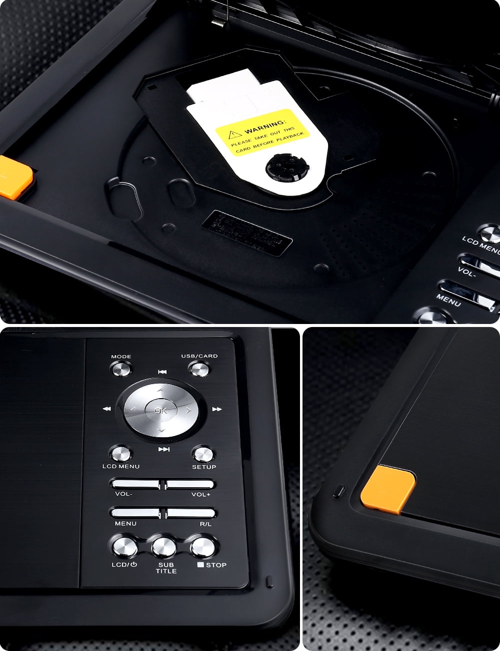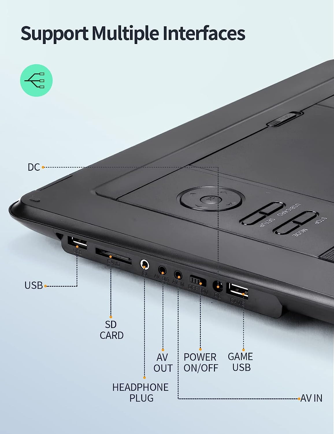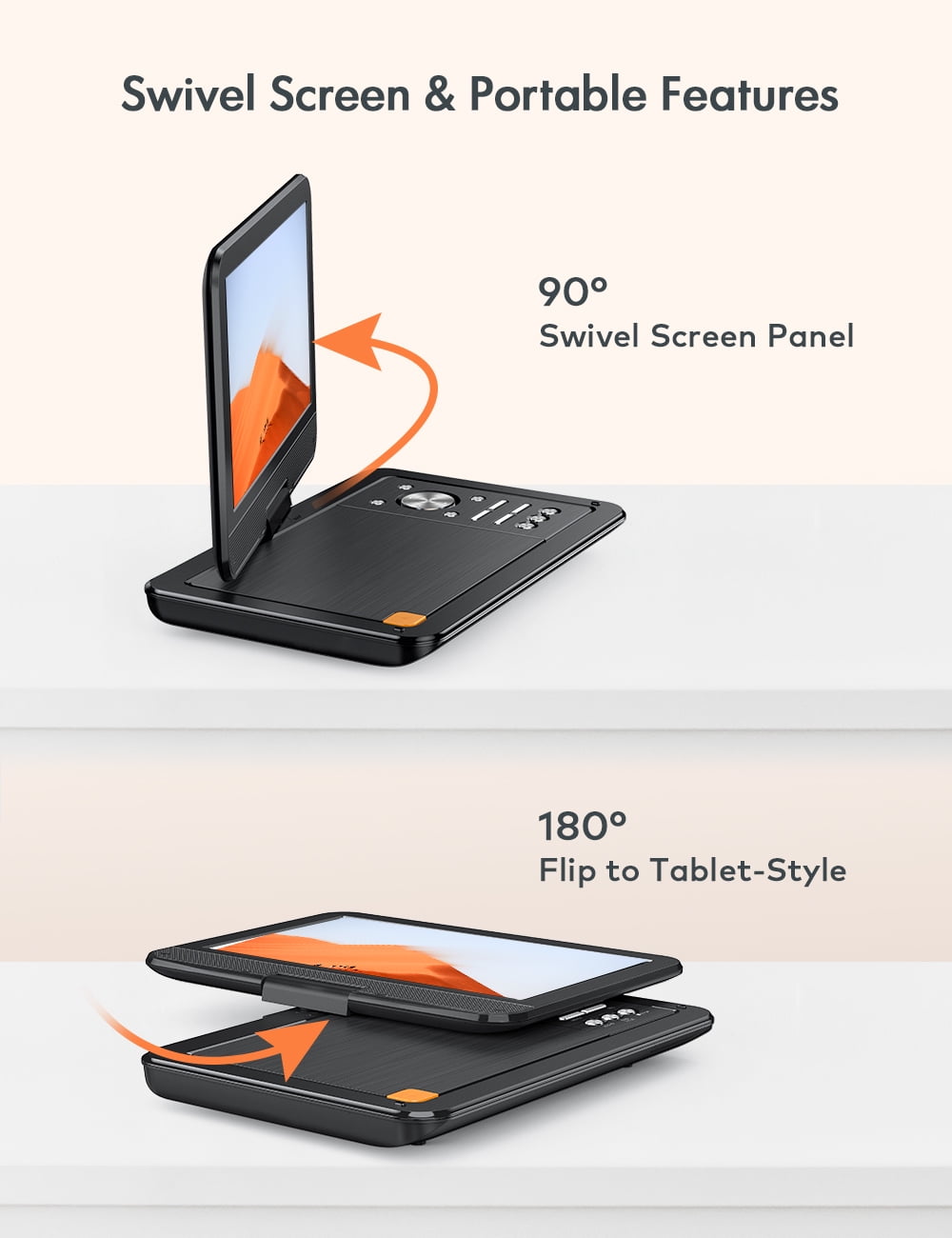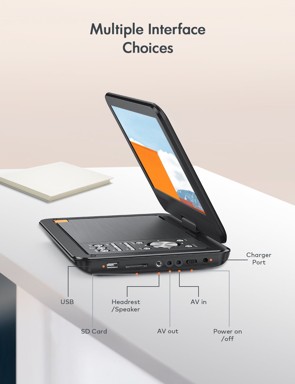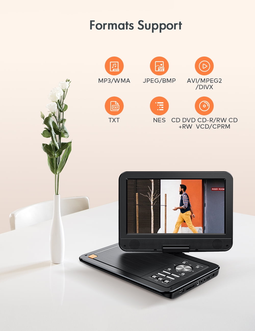 ãHD resolution rotating screenãDVD provides a resolution of 1024 x 600, and the high-definition picture brings an immersive viewing experience. The screen can be flipped 180 degree; and rotated 270 degree. The screen can be adjusted at will, so that whether you are sitting or lying down, you will not be restricted and can enjoy watching movies comfortably. ãStereo sound and external device supportãDual stereo speakers bring a more immersive sound experience, and good sound effects bring a more pleasant viewing experience. It also supports 3.5mm audio port, which can be connected to any external device at any time. ãVersatility and high compatibilityãCan connect USB and SD cards, supports AVI, MPG, MPEG, DAT, VOB, OGG, ASF and other Video File Formats; MP3, WMA and other Audio File Formats, and can save pictures at the same time. Supports game mode and connects a controller to bring a more immersive gaming experience. ãSupports DVD playback in multiple countriesãThere are no geographical restrictions on videos. You can choose videos in different regions to watch according to your personal preferences. Higher compatibility brings freer viewing options and allows you to understand the culture and films of different countries. ãSupport USB/SD CardãYou can play games, watch movies, enjoy music, read e-books, learn, etc. on our DVD player. The renewed players that support the USB slot and SD card greatly enrich your/your family life. It can play CD, DVD, CD-R/RW, DVD -R/+R, DVD +RW/-RW, VCD, SVCD.