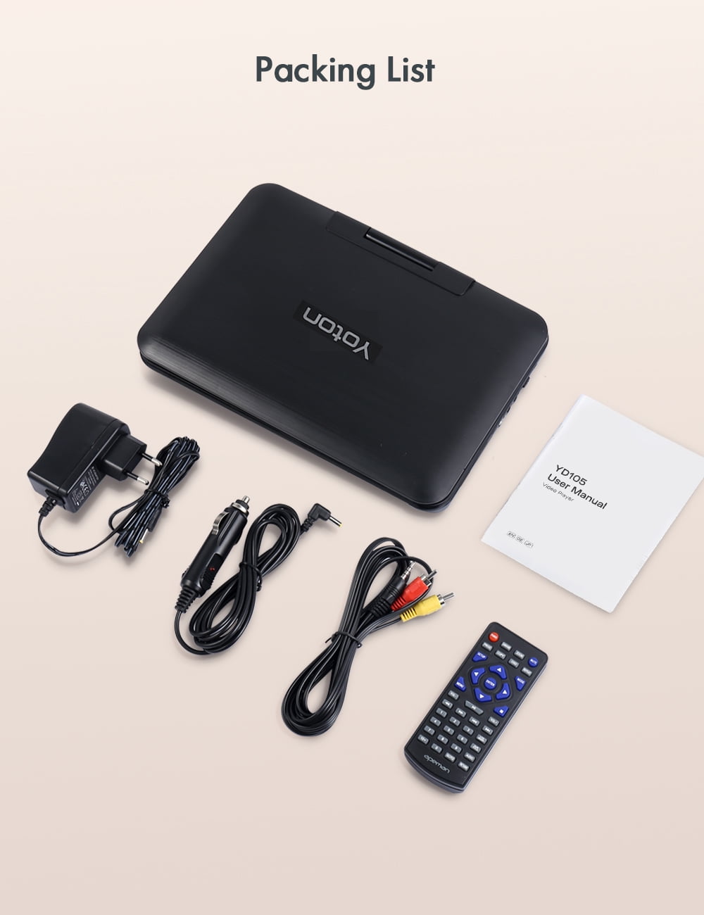YOTON YD105A——Good gift for kids and family ãHD resolution rotating screenãDVD provides a resolution of 1024 x 600, and the high-definition picture brings an immersive viewing experience. The screen can be flipped 180 degree; and rotated 270 degree. The screen can be adjusted at will, so that whether you are sitting or lying down, you will not be restricted and can enjoy watching movies comfortably. ãStereo sound and external device supportãDual stereo speakers bring a more immersive sound experience, and good sound effects bring a more pleasant viewing experience. It also supports 3.5mm audio port, which can be connected to any external device at any time. ãVersatility and high compatibilityãCan connect USB and SD cards, supports AVI, MPG, MPEG, DAT, VOB, OGG, ASF and other Video File Formats; MP3, WMA and other Audio File Formats, and can save pictures at the same time. Supports game mode and connects a controller to bring a more immersive gaming experience. ãSupports DVD playback in multiple countriesãThere are no geographical restrictions on videos. You can choose videos in different regions to watch according to your personal preferences. Higher compatibility brings freer viewing options and allows you to understand the culture and films of different countries. ãSupport USB/SD CardãYou can play games, watch movies, enjoy music, read e-books, learn, etc. on our DVD player. The renewed players that support the USB slot and SD card greatly enrich your/your family life. It can play CD, DVD, CD-R/RW, DVD -R/+R, DVD +RW/-RW, VCD, SVCD.
