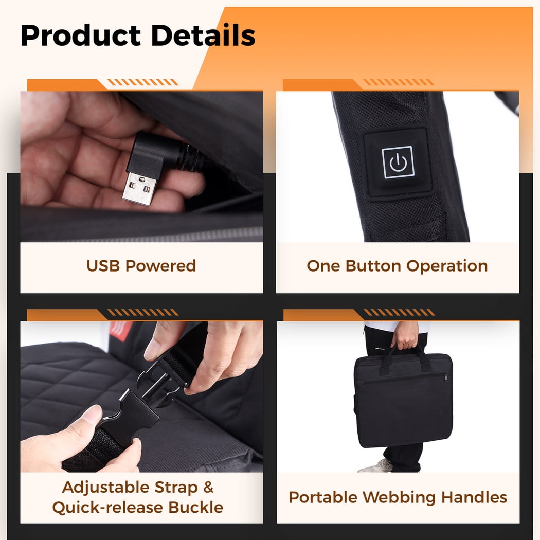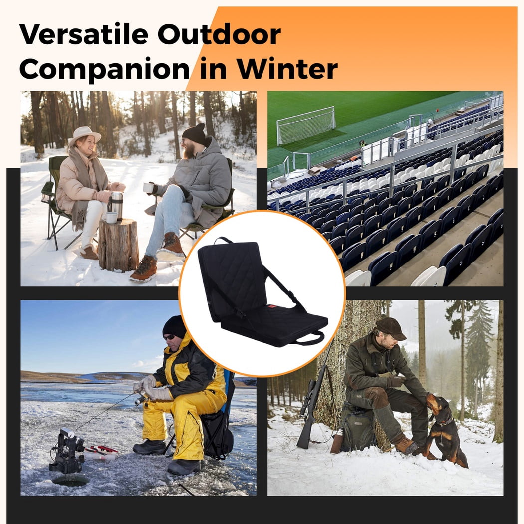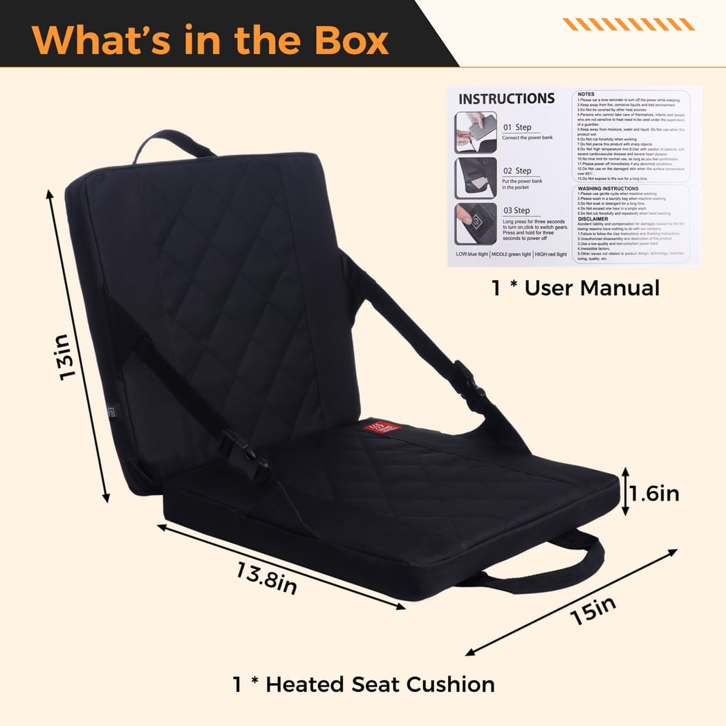 【Stay Warm in Winter】Our heated seat cushion rapidly and evenly warms up, which keeps your hip and back dry and warm in cold winter. It is recommended to connect a 10000mAh power bank (not included) and place it in the pocket inside the cushion. Adjust among 3 different temperature settings according to practical needs. 【Durable Outer & Soft Inner Layers】Crafted with a 600D Oxford cloth outer layer, our seat cushion is resistant to wear, tear, dust, and moisture, ensuring great durability. The inner layer is made of 1.6-inch thick EPE foam and sponge, making it soft and comfortable to sit on. 【Adjustable Strap with Quick-release Buckle】With adjustable straps, you can freely adjust the angle of the cushion to your liking. The straps feature quick-release buckles for you to transform the cushion into a fully reclined position of 180 degrees. Take a moment to lay back and rest, rejuvenating your body and mind. 【Foldable & Portable】Designed for convenience, our seat cushion is foldable and comes with 2 reinforced webbing handles. Weighing about 1.6 lbs, it’s easy to carry in your hand or hang on your backpack. Take it wherever you go and enjoy comfort on the go. 【Versatile Outdoor Companion】This seat cushion is a versatile companion for various outdoor activities. It’s perfect for outdoor sports stadiums, beach chairs, camping chairs, folding chairs, lawn chairs, and more. It’s an ideal choice for winter outdoor activities such as camping, fishing, and hunting.