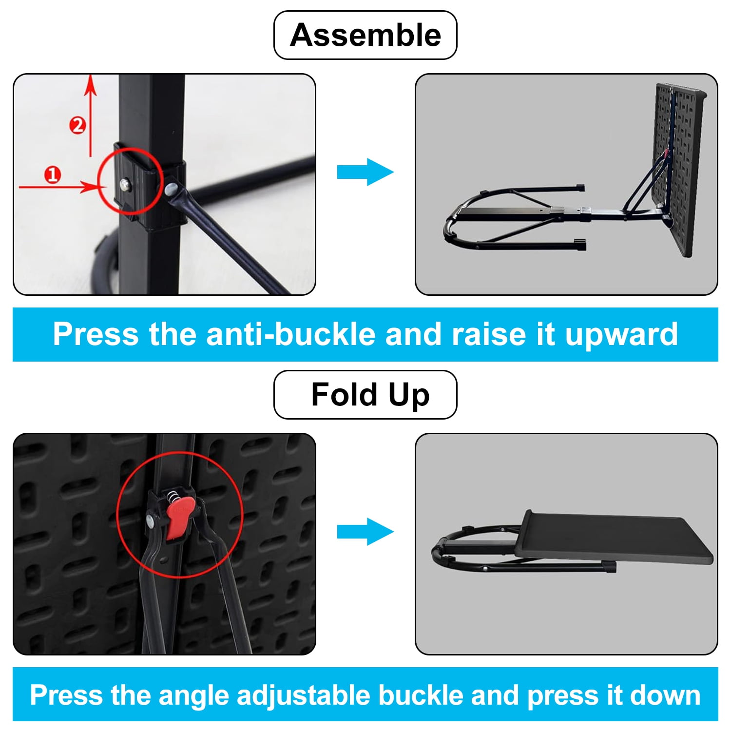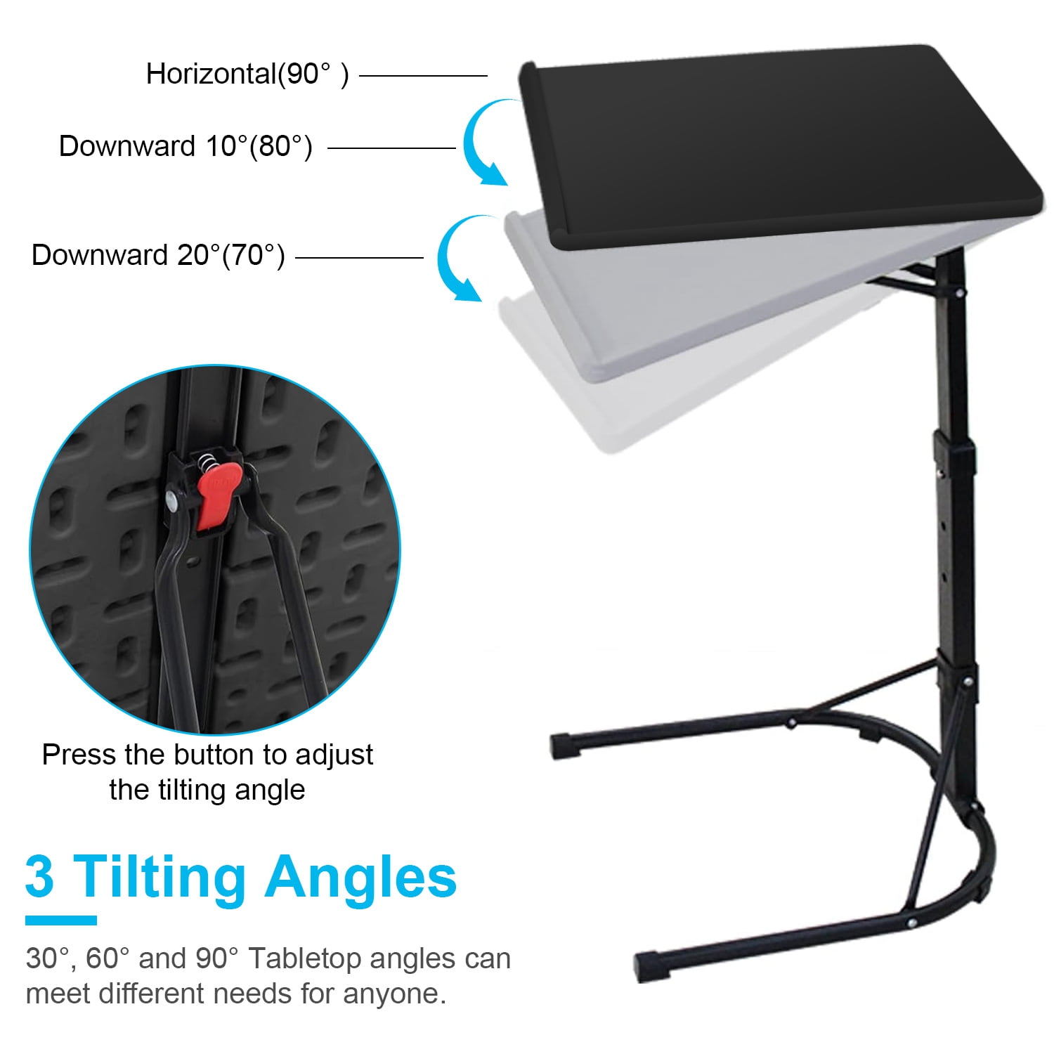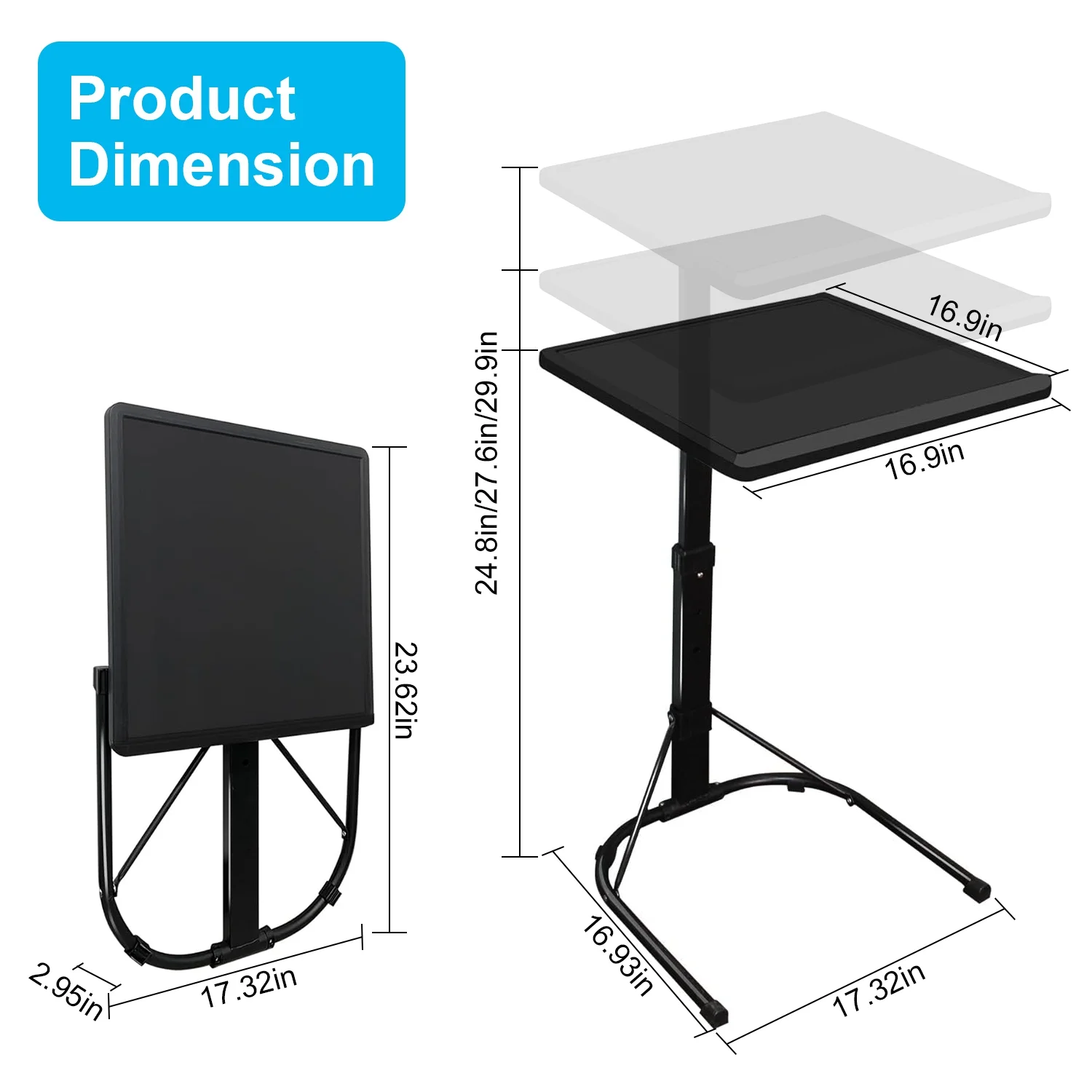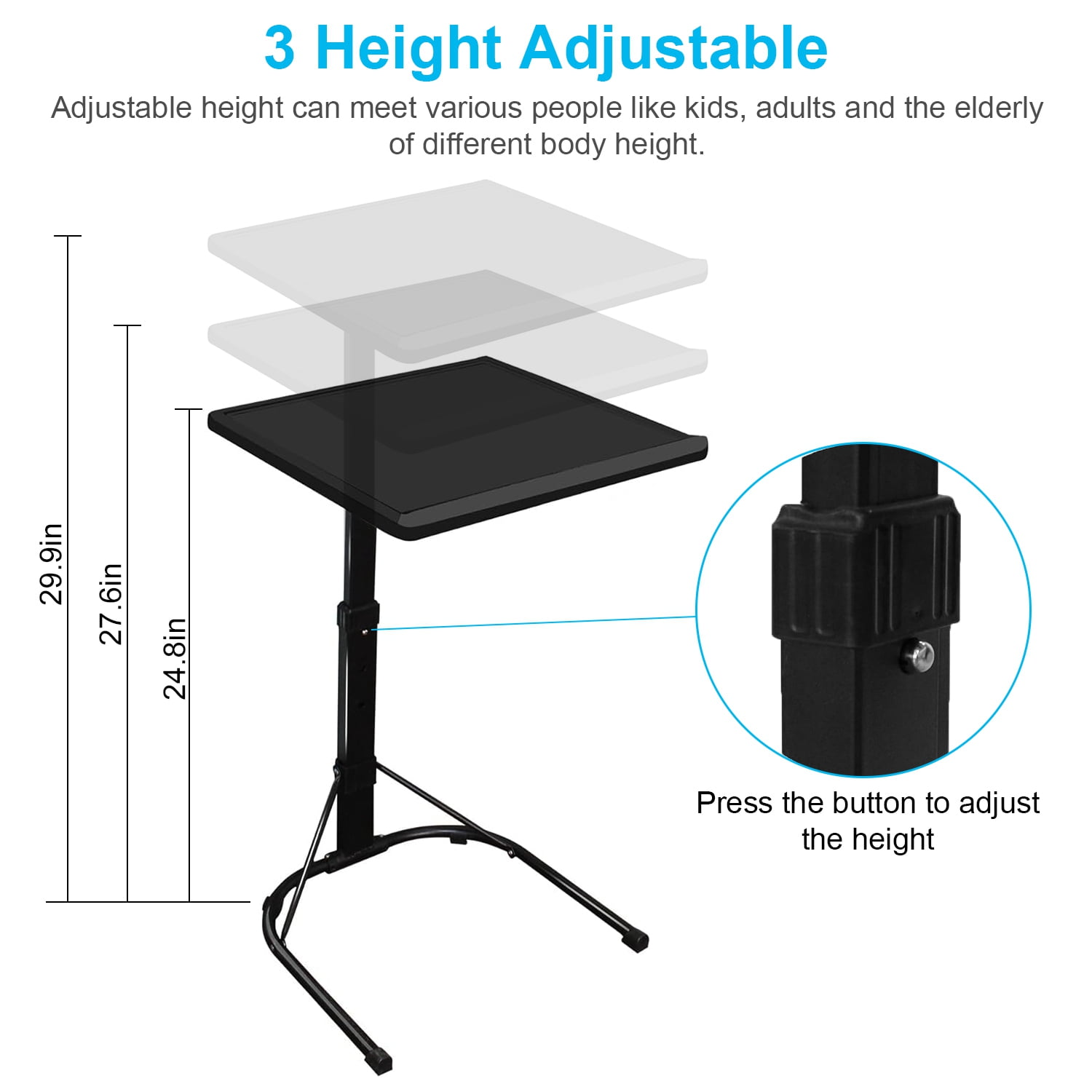 UPGRADE-STABLE & UP TO 55 LBS: black TV tray table has been upgraded with craftsmanship, the panel is thicker and more stable. But the Tray Table with Stand is still lightweight yet strong enough to hold up to 55 pounds, and these folding table can comfortably support your dinner plate or laptop. ADJUSTABLE HEIGHT & ANGLE: This folding table has 3 heights and 3 angles to adjust to meet all the needs in your daily life. FOLDING DESIGN & SAVE SPACE: The couch table tray has a unique foldable design. The table top and table legs can be folded to adapt to the style of your home. Greatly save the space of your room, which is easy to store and carry without assembly. MULTI-FUNCTIONAL TRAY: The folding TV Tray Table only needs to slide the desk top to the position you want, these TV tray can be used! It can be placed next to the chair, under the sofa, or in the closet. These tray tables make meals super convenient, and they can also be used for reading, writing, living room production, food entertainment, camping tables or laptops, which are suitable for working at home. EASY TO INSTALL: It is a great integration of high-strength steel and PE materials and exquisite workmanship. Designed into foldable and assembled style, you can easily set up in minutes with no tools. Specification Product Type: Folding TV Tray Table Color Available: White, Black Material: PE Desktop; Steel Frame 3 Height Adjustment: 63cm/24.8in; 70cm/27.6in; 76cm/29.9in Desktop Angle Adjustment: 3 Angles(90° Horizontal; 80°; 70°) Load Bearing: 25kg/55lbs Desk Top Size: 43x43cm/16.9×16.9in Foldable Item Size: 23.62×17.32×2.95in Item Size(Extended): 43x43x76cm/16.9×16.9×29.9in Item Weight: 2.85kg/6.28lbs Package Size: 62x47x8cm/24.41×18.5×3.15in Package Weight: 3.25kg/7.17 lbs Package Contents 1 x Folding TV Tray Table 1 x User Manual