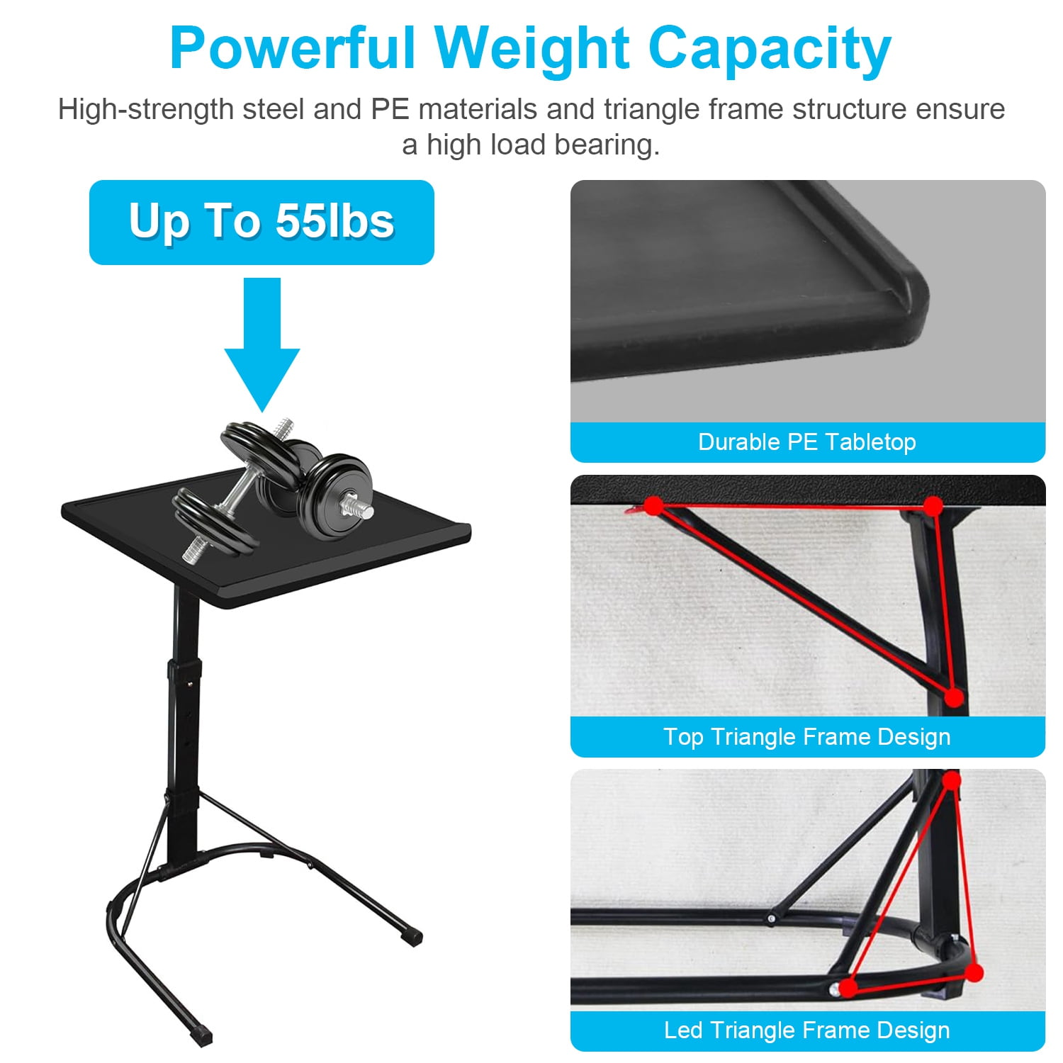 Foldable Sofa Tray Table is extremely lightweight and weighs 6.28 lbs for easy storage and portability. The TV tray table can hold up to 55 lbs and comfortably supports dinner plates, laptops, snack boxes and more. The adjustable TV tray table can be adjusted in height and angle to maintain a comfortable position for different needs. The tray table does not require the use of tools to assemble, simply remove it from the package and follow the steps to open it and it is ready to use. Ideal for reading, writing, lounging, camping, laying down to sleep and working at home.
