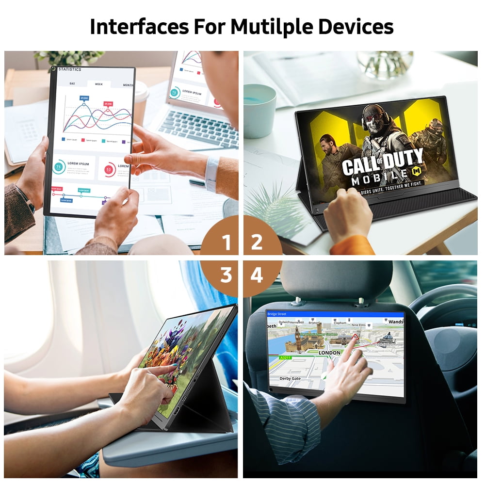 Specification: Resolution: 3840*2160 Screen size: 15.6″ Panel Type: IPS Brightness: 450cd/m² Contrast ratio: 1000:1 Viewing angle:178° NTSC:72% sRGB:100% Response Time: 5ms Built-in Dual 2W Speakers No Splash + Low Blue Monitor Housing: Aluminum Alloy Interface: full-functioned type-c port *2 type-c port for charging Mini DP Port Standard HDMI port*1 3.5mm headphone jack*1 Package included: 1 x 15.6″ Laptop monitor 1 x Standard HDMI to Standard HDMI Cable 2 x USB-C – USB-C cord 1 x 5V 3A adapter 1 x Leather Case 1 x User Manual