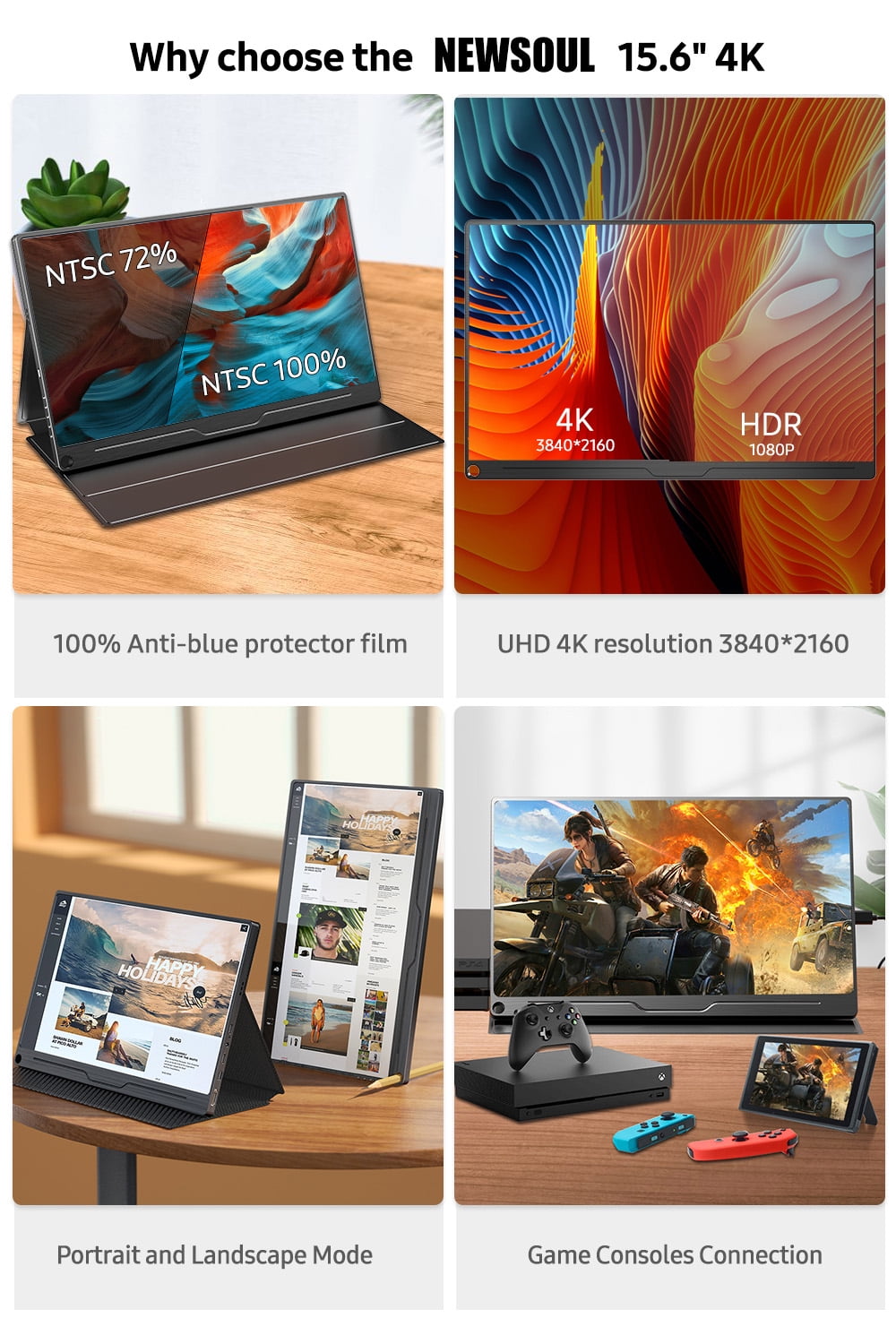 🔍 4K UHD Portable Monitor – Comes with native 4K[3840*2160] ultra-clear resolution(4x more pixels than FHD), 15.6-inch IPS panel, providing exceptional, sharp, and immersive images with detail and clarity. 60hz refresh rate with HDR technology, delivers unmatched contrast and accurate reproduction, perfect for gamers, photographers, content creators, multitaskers. 💯 Stunning Viewing Experiences – Featuring 100% Adobe RGB, up to 450 nits peak brightness, 1000:1 high contrast ratio, 16.7M colors displays, this 4K USB-C Laptop Monitor offers vivid colors to deliver cinematic-quality visuals. Compare with sRGB, 100% Adobe RGB has a wider color space, it can restore the authenticity of the image & video to a greater extent and record more lifelike color details, enhancing your watching experience. 🔗 Connect with Convenience – Rich connectivity includes usb-c 3.1 full function port, mini-hdmi port, and a 3.5mm headphone interface, widely compatible with most Laptops, PC, PS4, PS5, XBOX, Switch, Mac, etc. The USB Type-C port enables you to power up, transmit video with just one cable connection, bringing you an enjoyable clutter-free work environment. (Note: The 4K portable monitor needs to be powered when connect to the phone.) 💼 Ready to Carry &Travel – The 15.6″ 4k portable computer monitor is incredibly slim, with only 0.3in ultra-slim premium profile, weighs only 1.7lbs, which is incredibly compact and portable design, fits easily into a backpack or suitcase whenever you go, making your monitor ideal for work, play, or study. 💖 Choose in Your Way – Multi-functional portable monitor has landscape and portrait mode and multi-scene modes like text/movie/game mode, good for browsing, editing, playing or watching. Also, You can set the 4k laptop monitor screen to duplicate/extend/second screen mode to meet your different needs. Whether you watch movies or play various gaming consoles, the 4k HDMI portable monitor brings you an extraordinary experience.