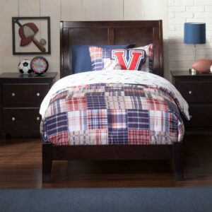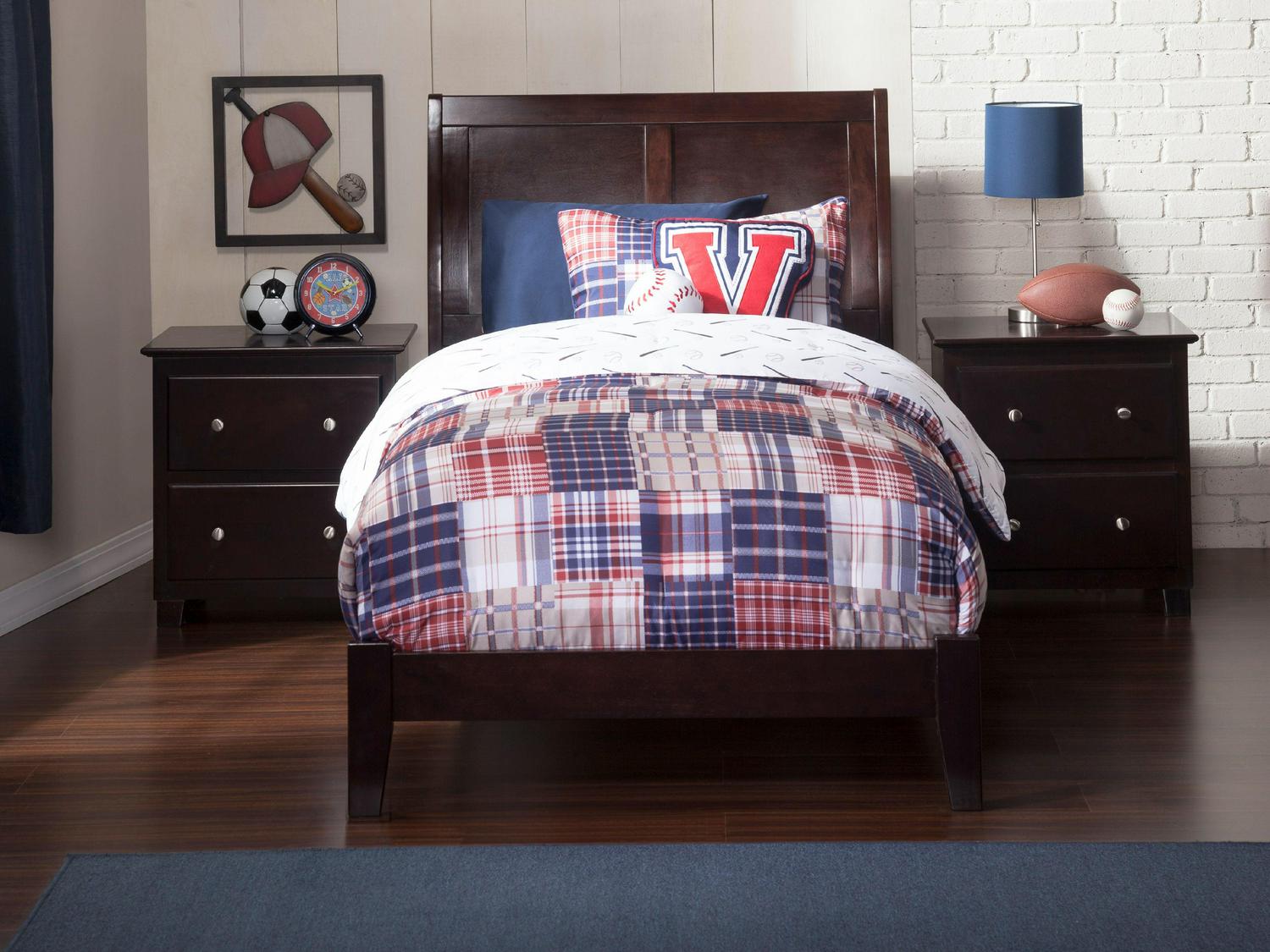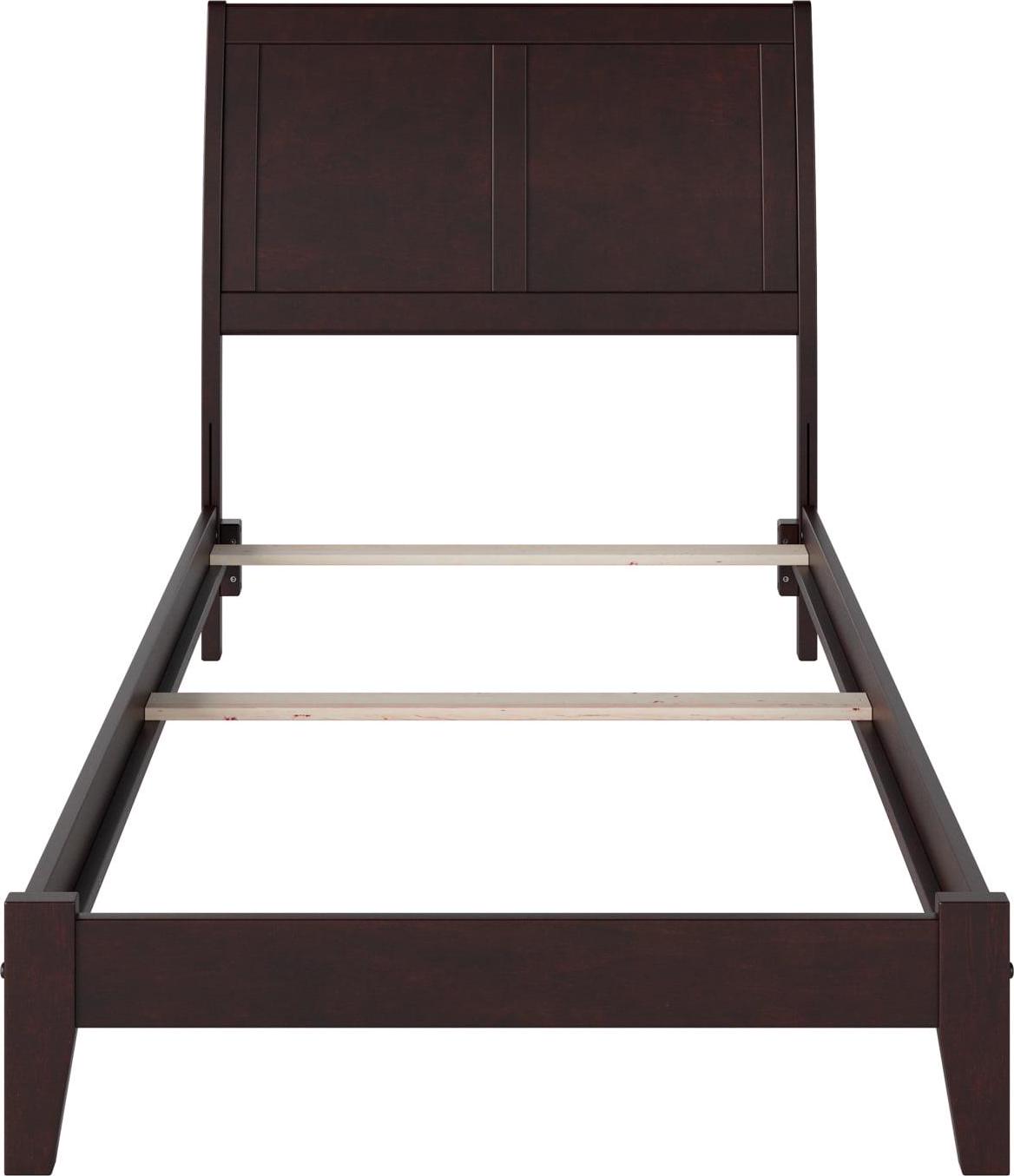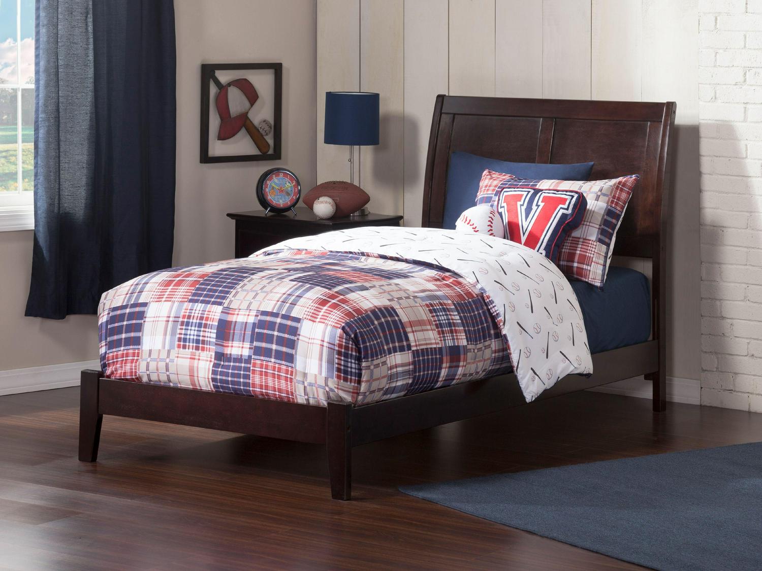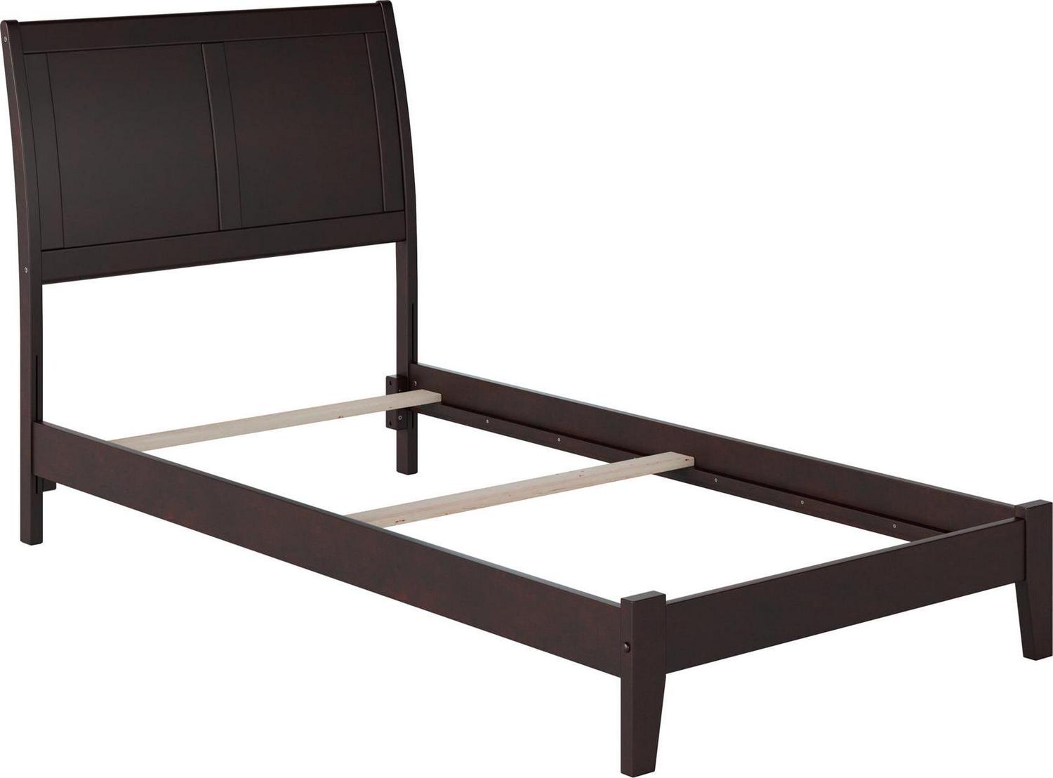 The modern sleigh design of the Portland headboard is sure to fit into any decor. Inset panels are framed by beautiful curved wood posts.