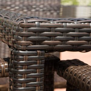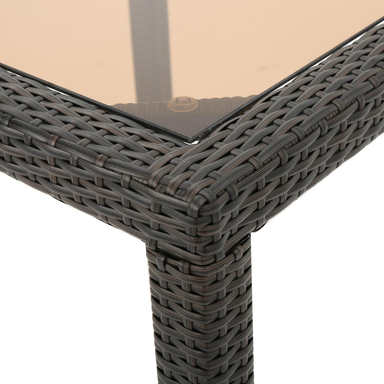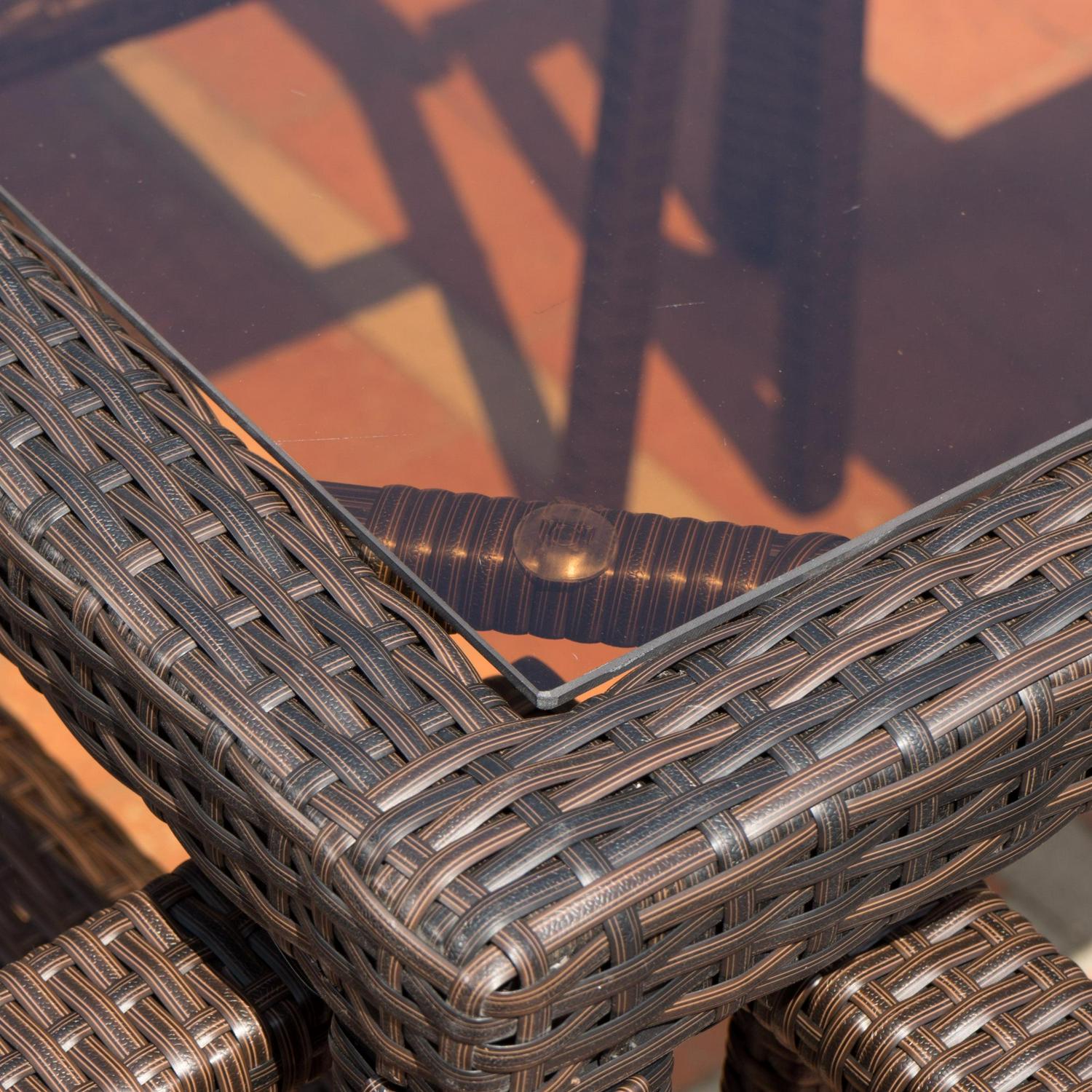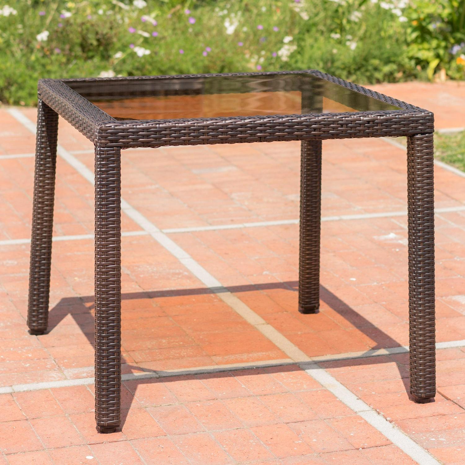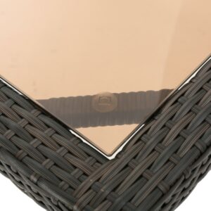 Do you need a table for set of outdoor furniture for you and your family members to sit together and enjoy leisure time This elegant square table is ideal for intimate outdoor dining. Featuring high-quality wicker over an iron frame and glass top, this piece is as durable as it is charming. Each wicker table is hand crafted by trained professionals with premium quality materials assuring your set will last many years. The darkened glass and wicker lend this piece a romantic feel that will transform your patio or backyard into a place of magic. This table is easy to assemble and clean.