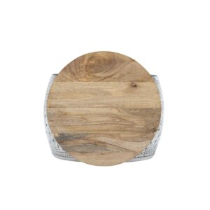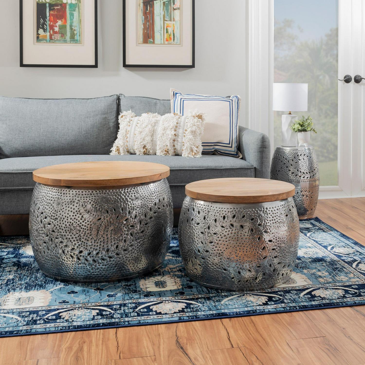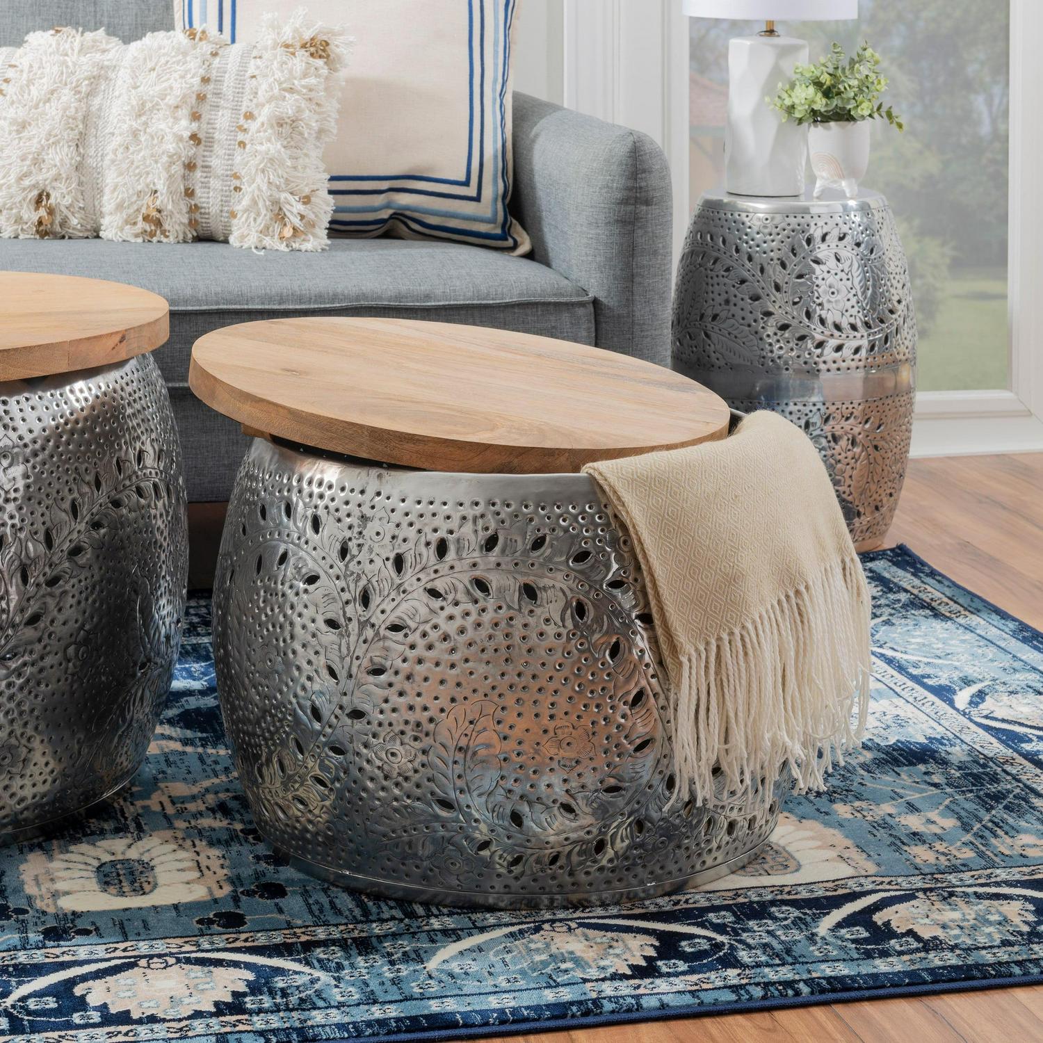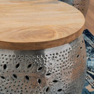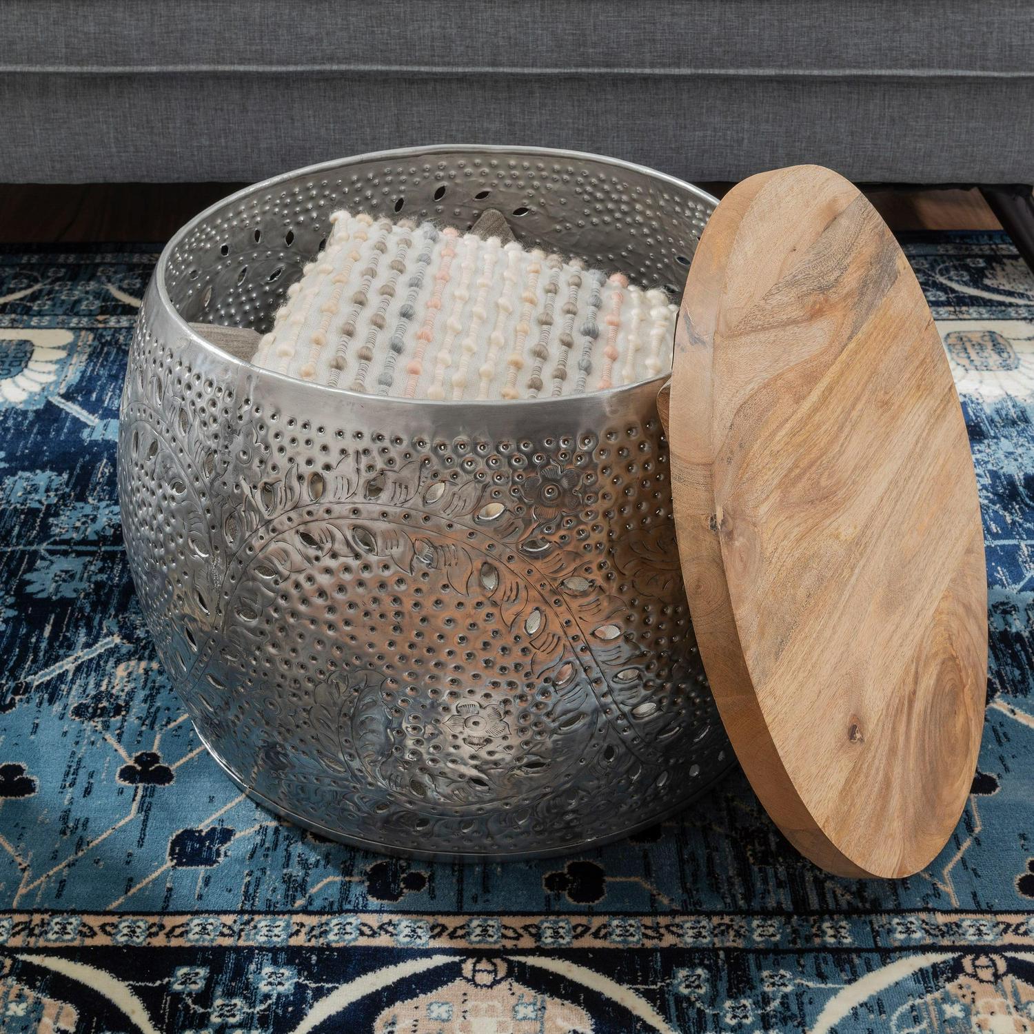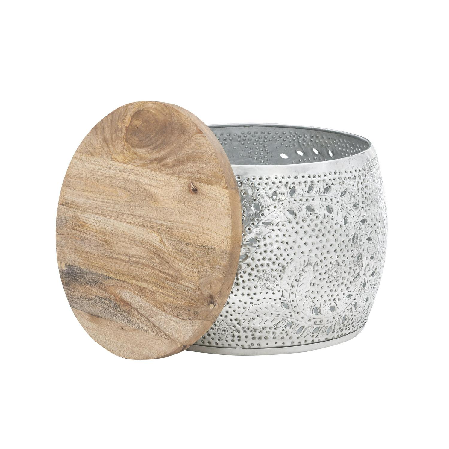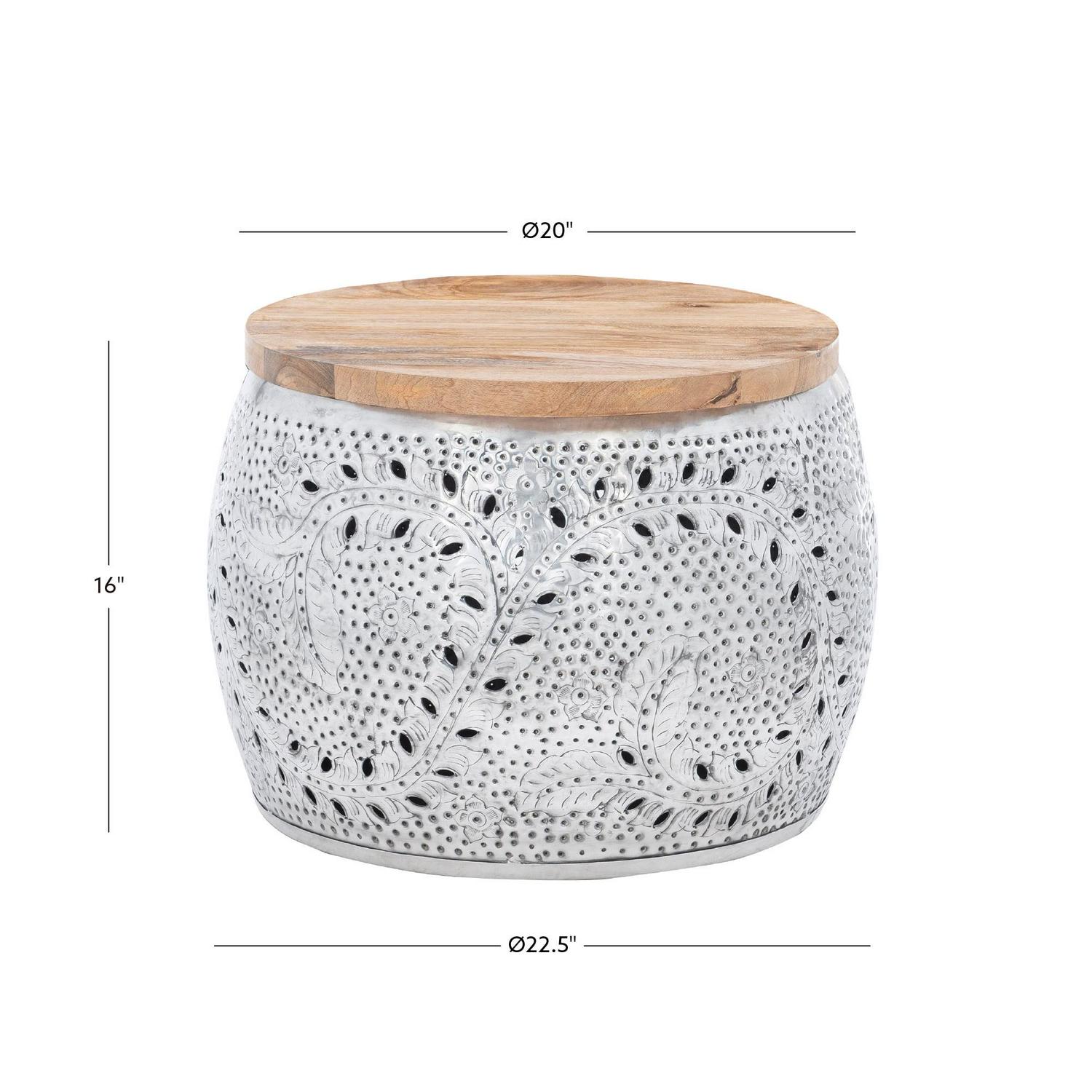 Compact and adorned with beautiful lattice cuts, this hammered Indoor Drum table will catch the eye while hardly taking up any space. The aluminum body is finished in a silver lacquer polish that lends itself to a timeless artisan aesthetic. A solid natural mango wood top lifts up to reveal hidden storage, perfect for stowing away blankets and runaway items in a hurry. With a 16 table height and 20 diameter, this piece is perfect for holding cocktails and hors d’oeuvre plates in front of a couch or next to a set of chairs in your living room.