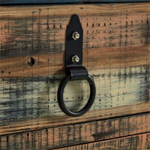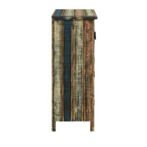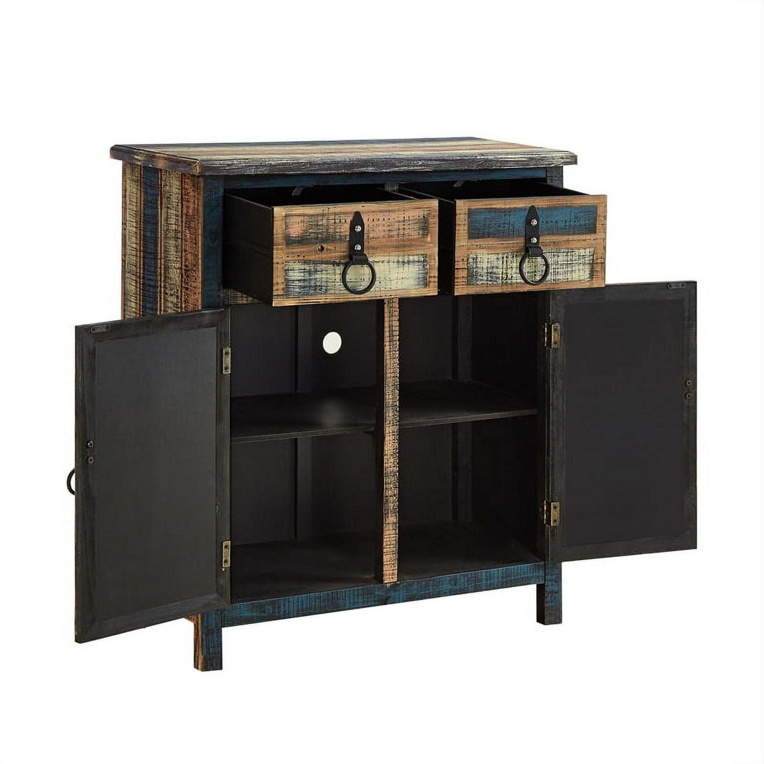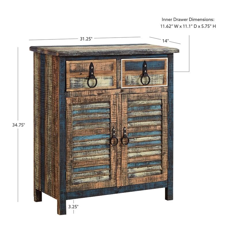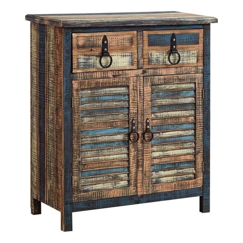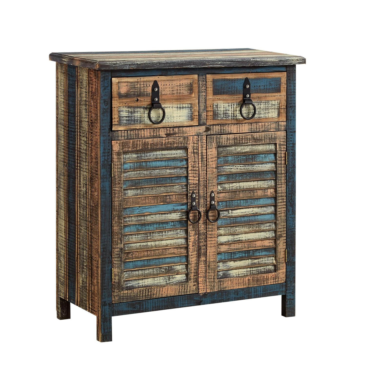 The Calypso Collection combines an antique, weathered look with a warm, rustic, industrial feel. Its distressed look is trendy, popular and full of unique character. The 2-Drawer, 2-Door Console is a perfect addition to any area of your home. It features 2 deep upper drawers and 2 doors below which provide ample storage space for a variety of items. The door fronts are accented with distressed colored louvers that add character to the piece. Drawer face and doors feature black powder coated hardware. Fully assembled.