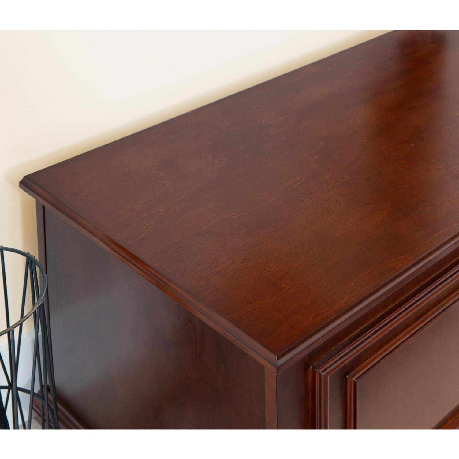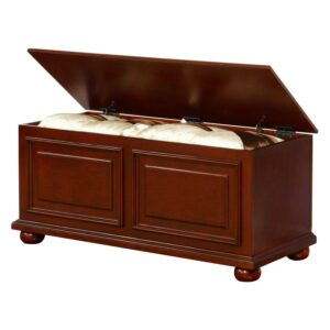Rich cherry brown finish Rubberwood, MDF with veneer on outside, Cedar veneer on inside Features raised panels, decorative molding and bun feet Traditional design style Top opens wide to reveal ample storage space Child safe hinges and breath holes Some assembly required