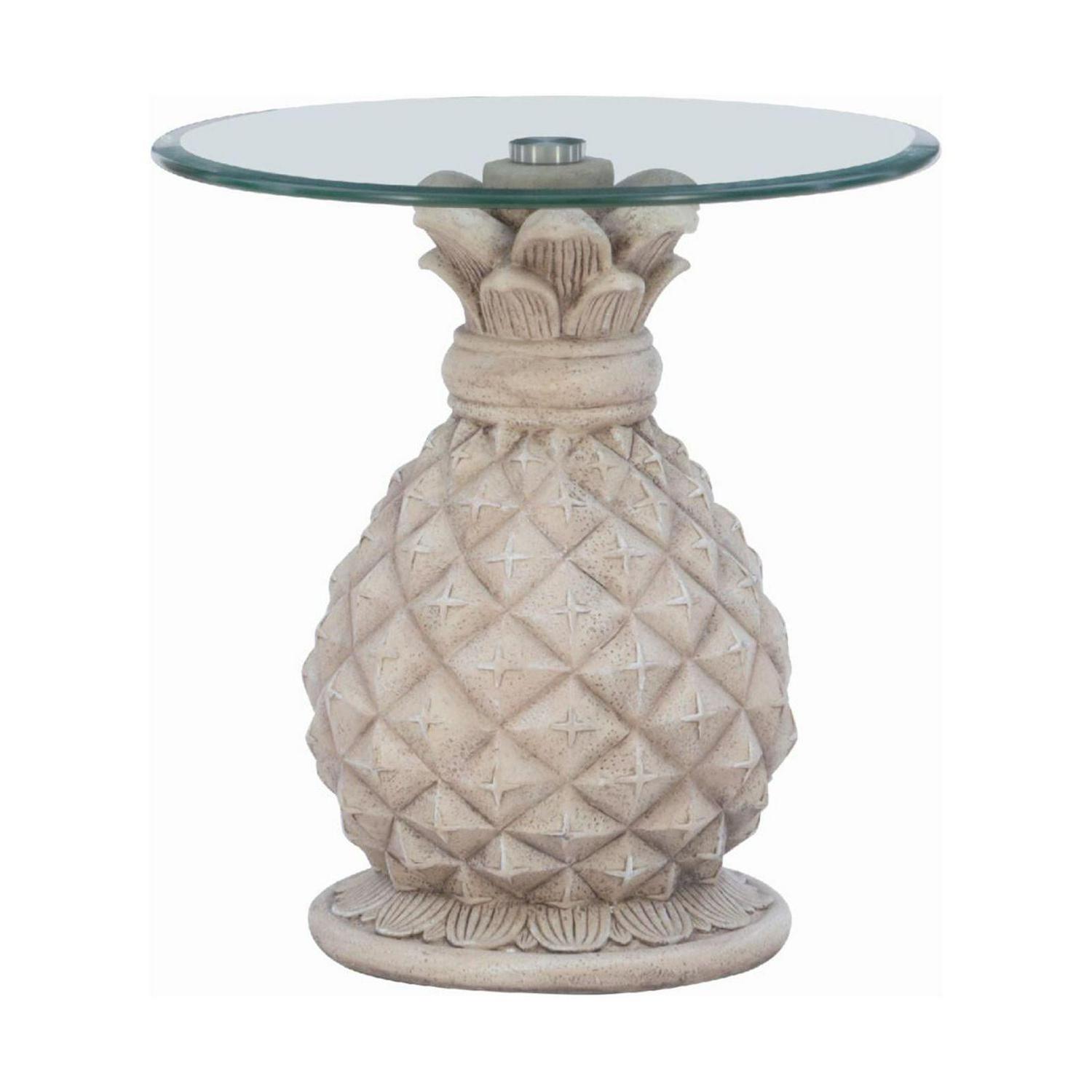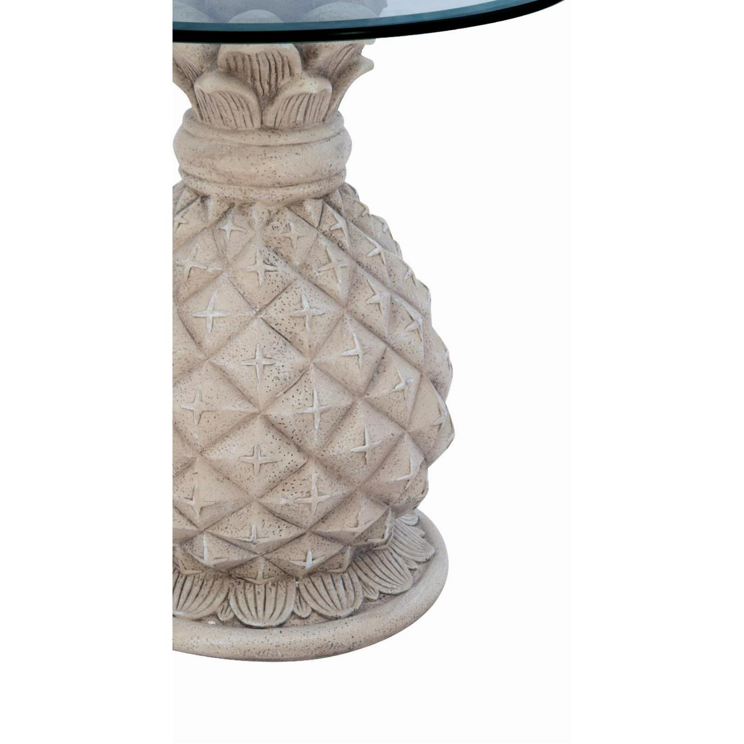 The pineapple is the symbol for hospitality and this piece is ready to continue the tradition. Incredible details with a stone texture, antiqued in shades of white and gray, capped off with a beveled glass top. Formed from an artist’s sculpture, use this accent table in a guest room, den or living room to hold a lamp or flower arrangement.