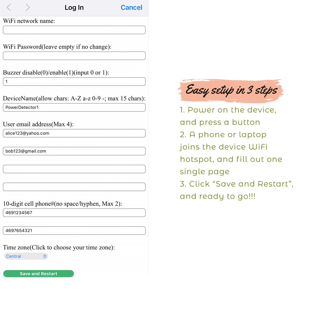 Easy setup: Simply connect the device to your Wi-Fi and enjoy uninterrupted monitoring without any monthly fees or subscriptions. (Only 2.4GHz WiFi supported. However, most WiFi routers nowadays could support both 2.4 and 5 GHz.) Prompt detection: Our device identifies power outage within 3 seconds and alerts you instantly. Experience faster responsiveness than many competitors that require much longer to recognize a power outage. Be in the know of even short power interruptions, enabling you to act preventively. Comprehensive notifications: Not just power outages, receive alerts for power restoration, low battery, and device offline (Wi-Fi loss). Unlike some brands that only inform about power status, our device ensures you’re never in the dark about battery health or device connectivity. Audible security: An 85dB alarm sounds during power failures, independent of Wi-Fi. If you prefer a quieter environment, this feature can be disabled during setup. Visual power status: The bright green LED provides a clear indication of your A/C outlet’s power status. Durable backup battery: Our device is built with an internal backup battery designed to last over 5 years, considering average power outages and maintaining a stable wifi connection. When not relying on the backup, the device seamlessly draws power from the A/C outlet it monitors.