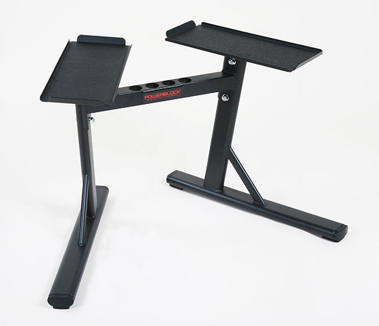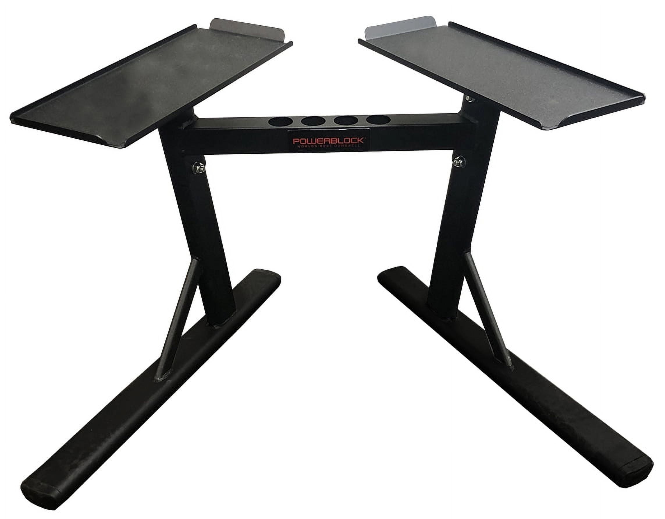 Rack your PowerBlock Dumbbells on the small footprint and convenience of a PowerStand The open design allows the user to comfortably “step in” when removing the weights Flat trays make changing weights fast between sets Works with any PowerBlock set up to 90 lbs Has adder weight storage
