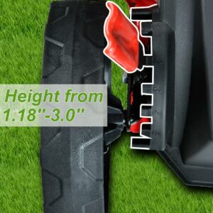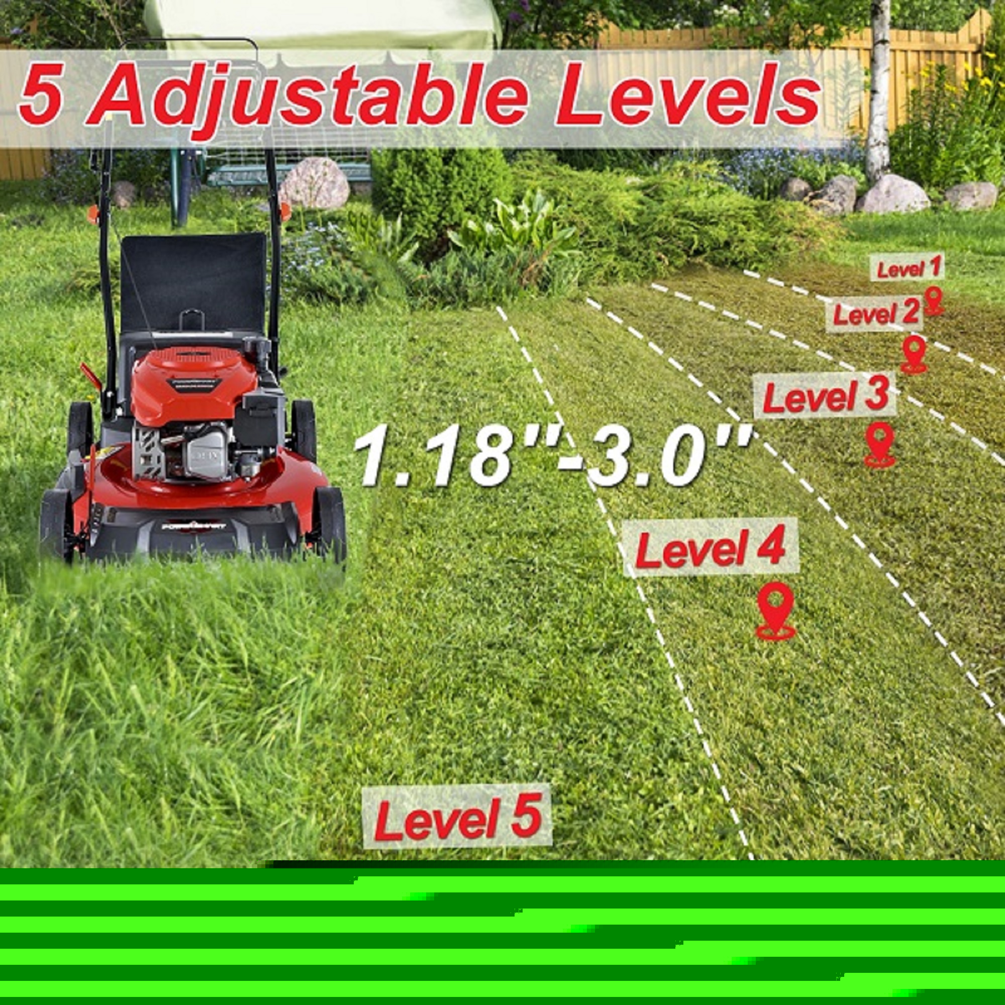 – 5-position height adjustment allows you to change the cutting height to easily cut grass, weeds and overgrowth, and the 8-inch rear wheels make it easy to push.