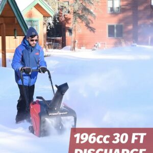 The PowerSmart PSS1210M Single-Stage 21 in. wide gas Snow Blower has a 196cc Engine. This heavy-duty workhorse has a recoil start. The powerful snow engine gives you up to 30 ft. of throwing distance. Its compact design makes for easy storage of the unit. 196cc engine offers powerful snow-clearing action. Blower allows a snow clearing width of 21 in. and a maximum intake of 13 in. Compact design makes for easy storage. Largest engine available in a single stage unit. Light weight design makes it easy to handle.