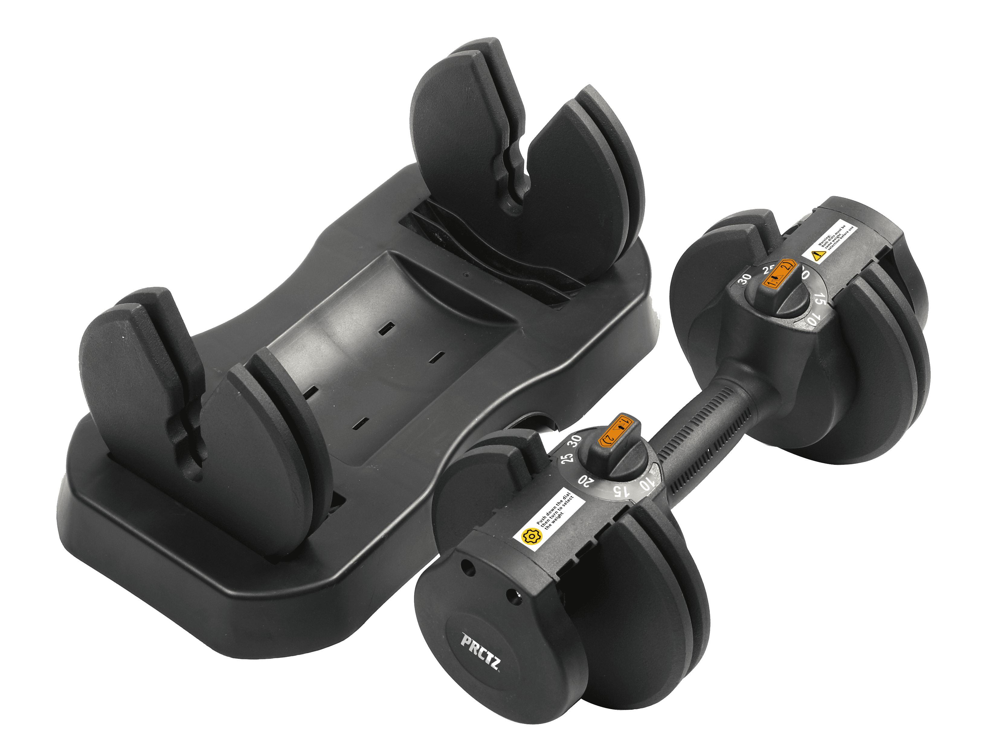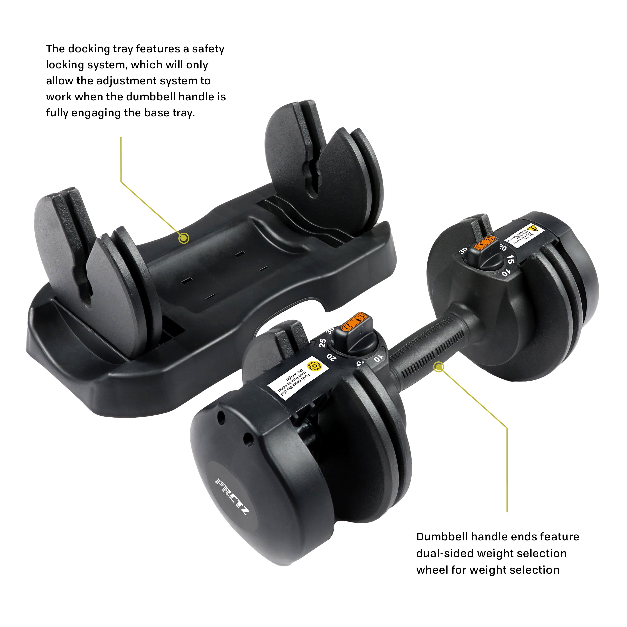 The PRCTZ, 10-30lb (4.54-13.61kg) Quick Select Adjustable Dumbbell with Stand, Pair comes with two adjustable dumbbells quick and easy weight adjustments from 10 to 30 lbs. The dumbbell’s weight selector dial features a safety locking system. The anti-slip contoured handle design allows this dumbbell to fit any free weight and strength training exercise at home or group workout with training partners! Our adjustable dumbbell has functional details such as textured handle for a tight and secure grip, built-in weight selector with safety locking system for weight plate adjustment from 10lbs, 15lbs, 20lbs, 25lbs, to 30lbs, and a compact weight tray to save your space in your home gym. The set also includes a compact 16.9 x 18.9 x 16.9 dumbbell stand. Its ergonomic design helps minimize lower back strain when picking up weights.
