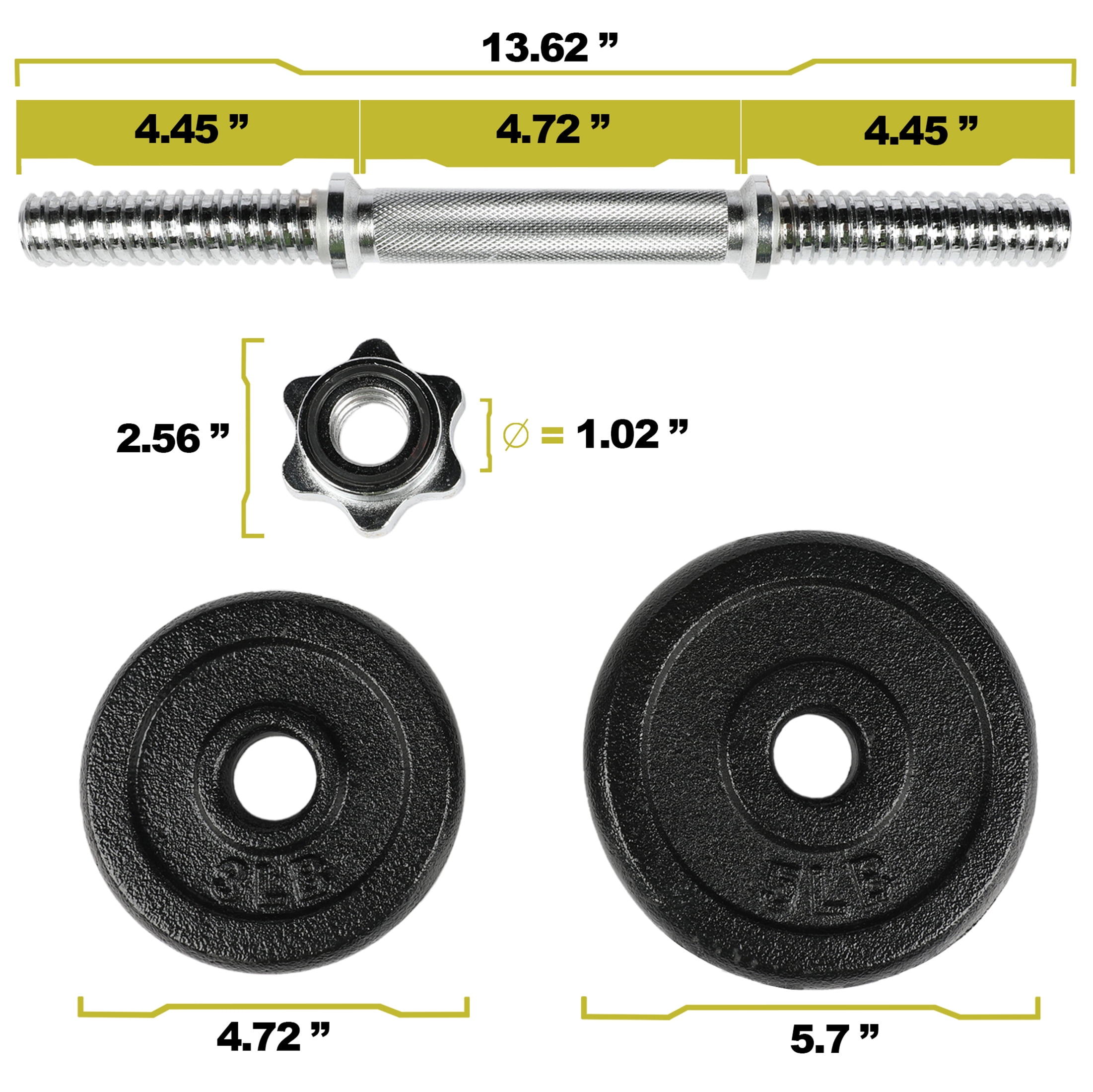 Great choice for both beginners and advanced fitness enthusiast Fully-knurled handles for a secure grip Adjustable cast iron dumbbell set includes: Four 3lb plates (11lbs 12.2oz in total) Four 5lb plates (20lbs 6.2oz in total) Two 14″ standard size (1″ dia) dumbbell handles (5lbs 8.8oz) Four: spin-lock collars (2lb 2oz in total) Total weight: 40lbs